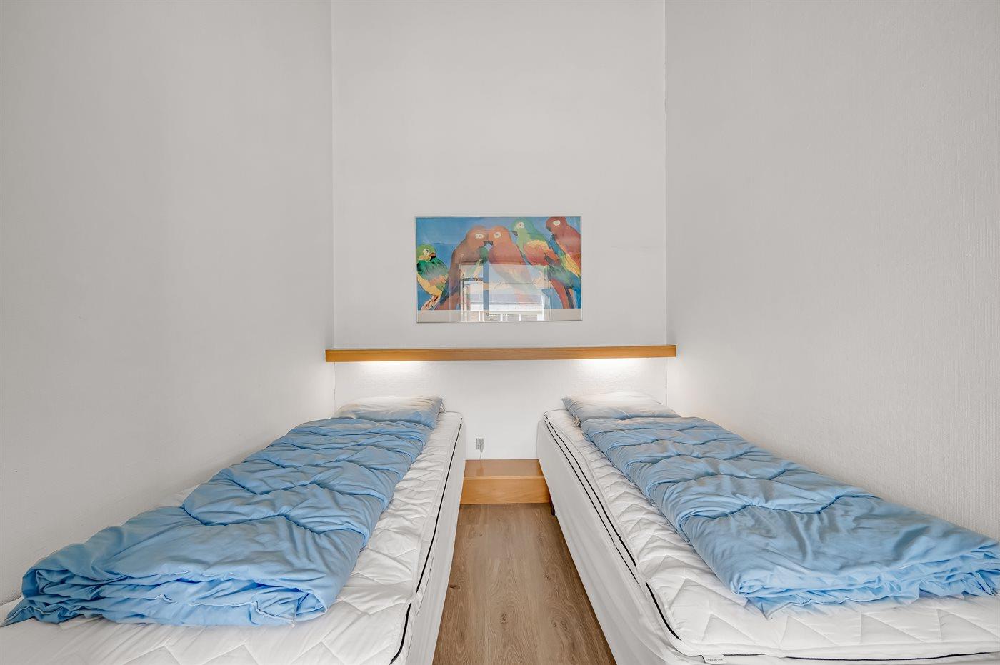Der er i alt 2 soveværelser. Sovepladserne fordeler sig på: 2 sovepladser i dobbeltseng. 4 sovepladser i enkeltsenge. 2 sovepladser i køjeseng. 4 af disse sovepladser befinder sig på husets hems.