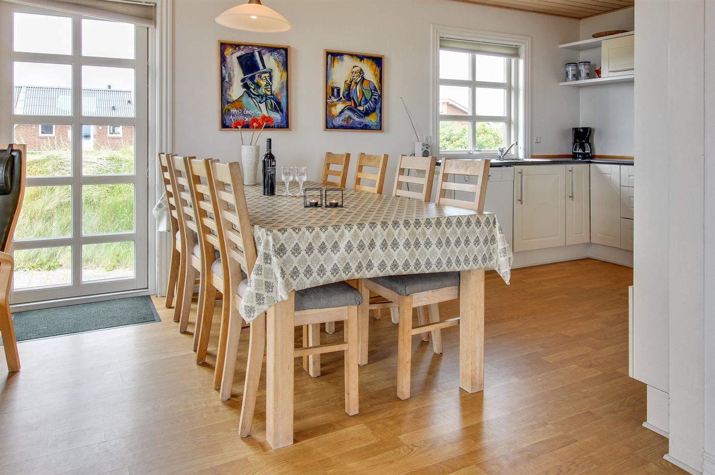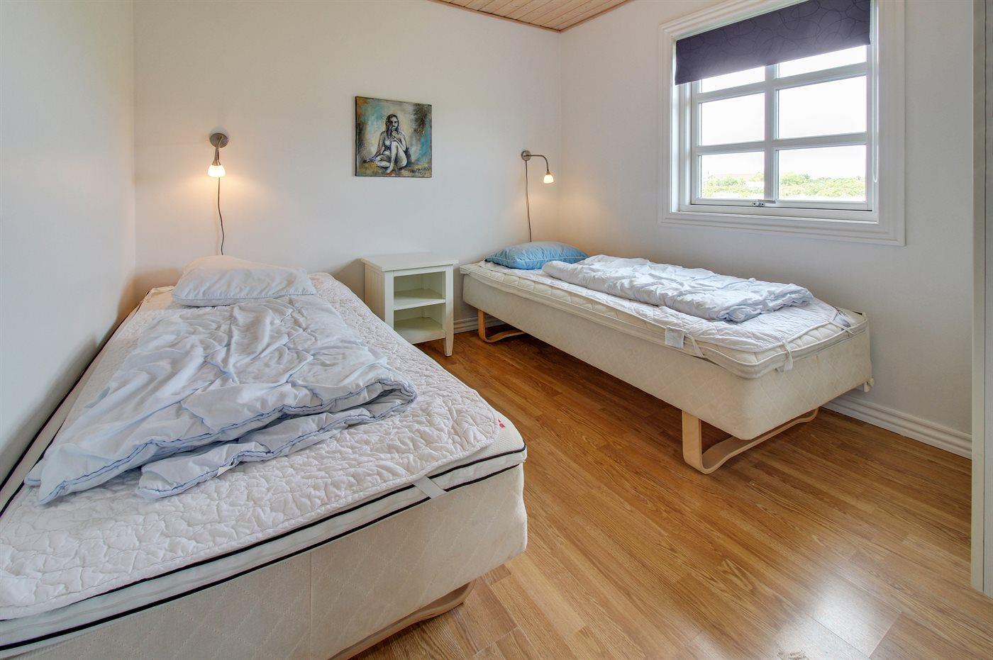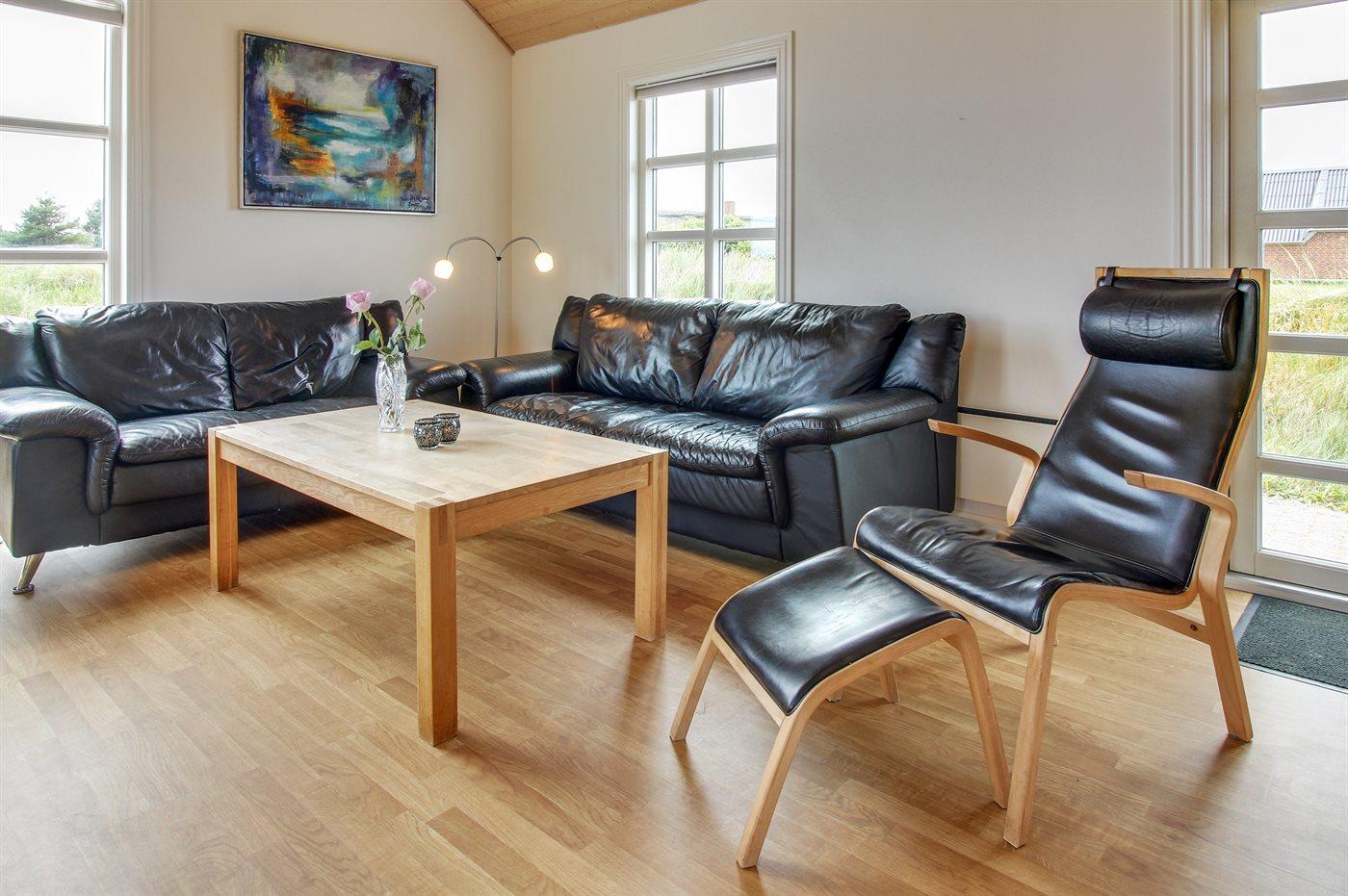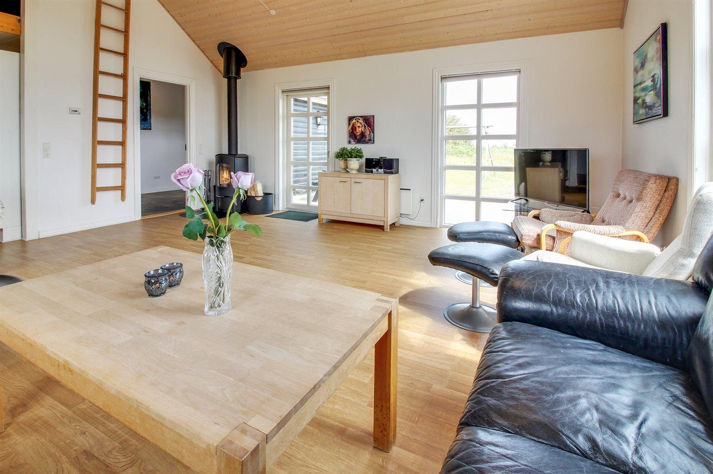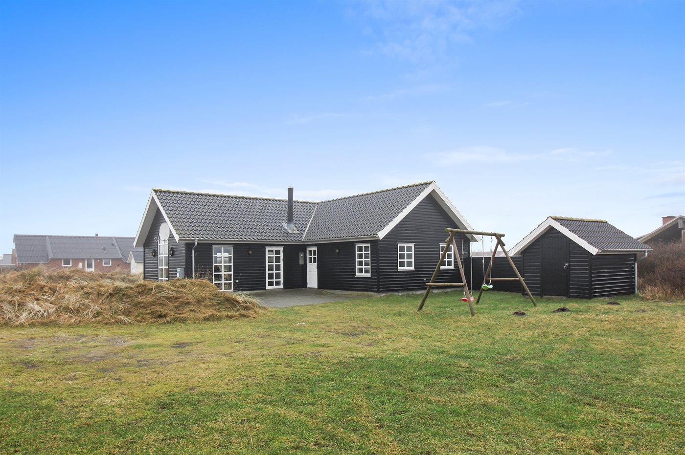 På en stor naturgrund - kun få min. kørsel fra badebyen Søndervig ligger dette dejlige og rummelige sommerhus i træ, bygget i 2005. Til huset hører et stort terrasseareal med havemøbler. Indvendig er der trægulve, dog klinkegulv i gangen og på badeværelset. 2 lækre badeværelser med gulvvarme og bruseniche. I det ene finder I desuden 2-pers. spa og adgang til husets sauna. I det andet vaskemaskine og tørretumbler. Det moderne og velindrettede køkken er bl.a. udstyret med mikrobølgeovn, opvaskemaskine, fryser, varmluftsovn samt komfur med keramiske kogeplader. Den lyse og venlige opholdsstue indeholder brændeovn, stereoanlæg med CD-afspiller, DVD-afspiller og TV med parabol (digital). Desuden gratis trådløs internetforbindelse. 3 gode soveværelser med fin skabsplads; 2 med dobbeltseng og 1 med 2 enkeltsenge. Desuden hems med 2 sovepladser samt 2 ekstra hemse hvor børnene kan lege. Til de mindste feriegæster findes der 2 barnesenge og 2 høje barnestole samt gynge på grunden. Huset er beliggende i et område med gode aktivitetsmuligheder, bl.a. golfbane, fiskesøer, bowlingbane og fitnesscenter m.m.