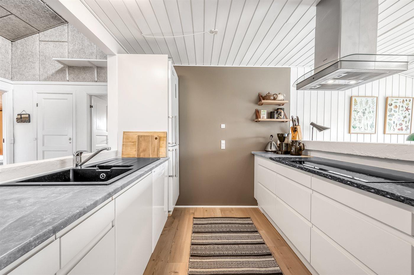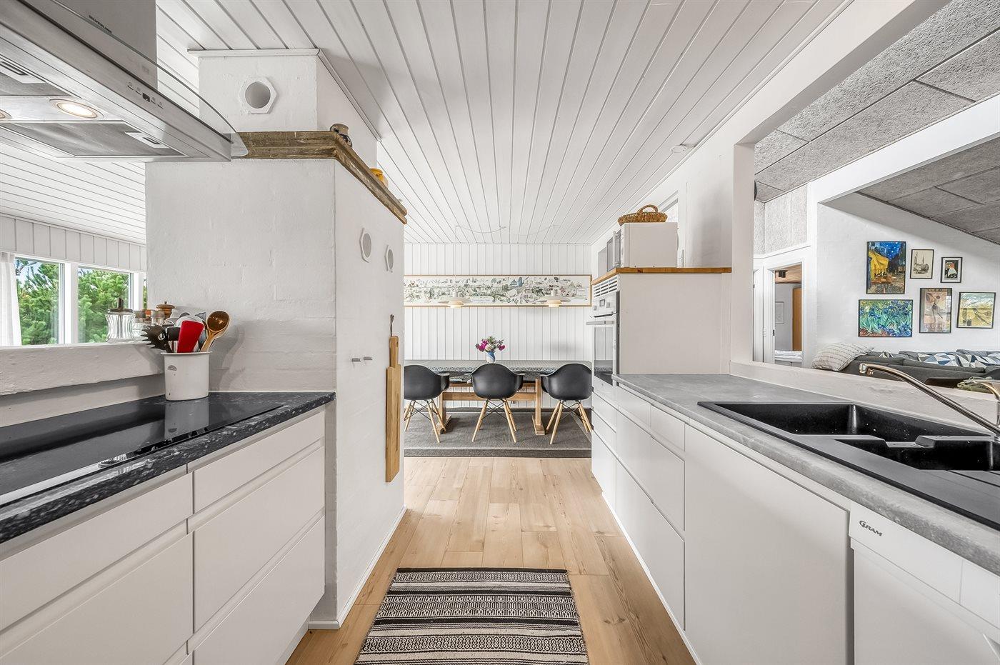 Køkkenet er udstyret med 1 køleskab. Der er 4 keramiske kogeplader, varmluftovn, mikrobølgeovn samt opvaskemaskine.
