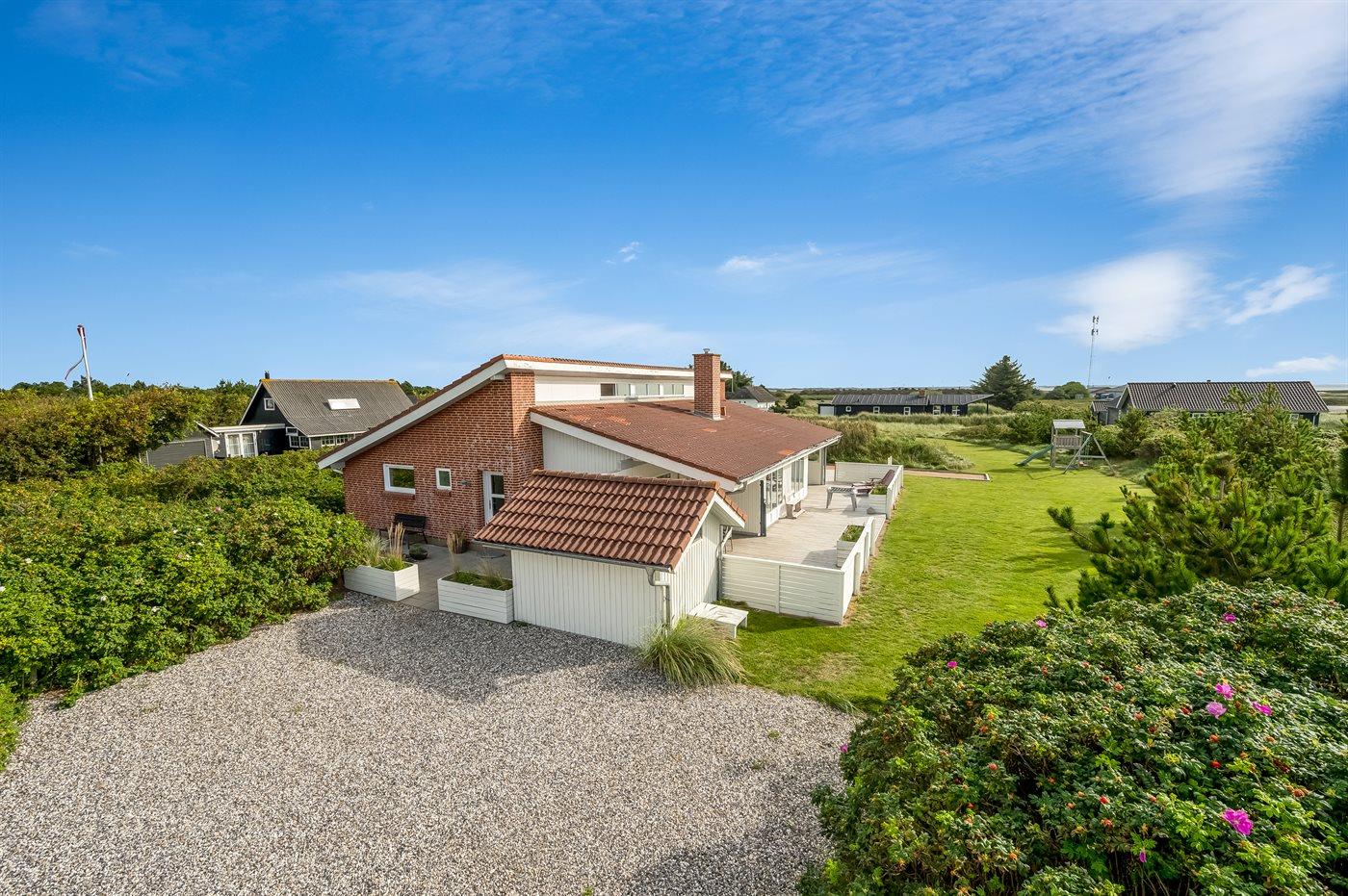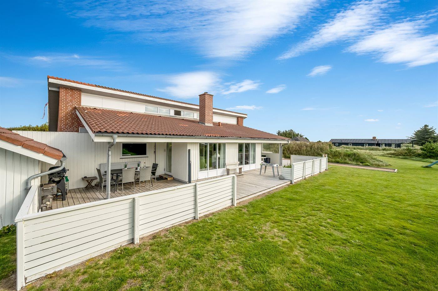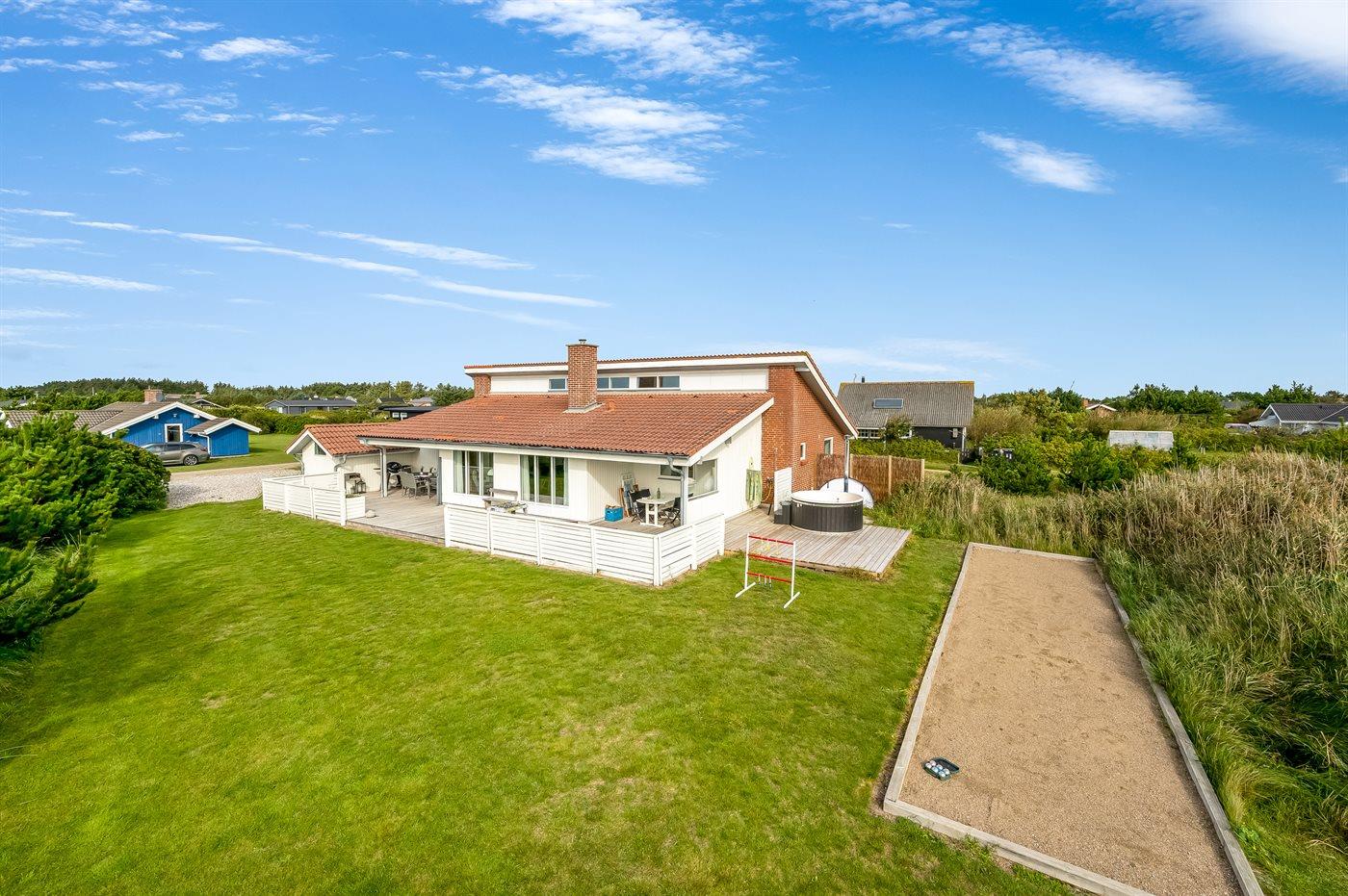 Velindrettet sommerhus nær hav og fjord med spa, store terrasser og aktivitetsrum i Søndervig.