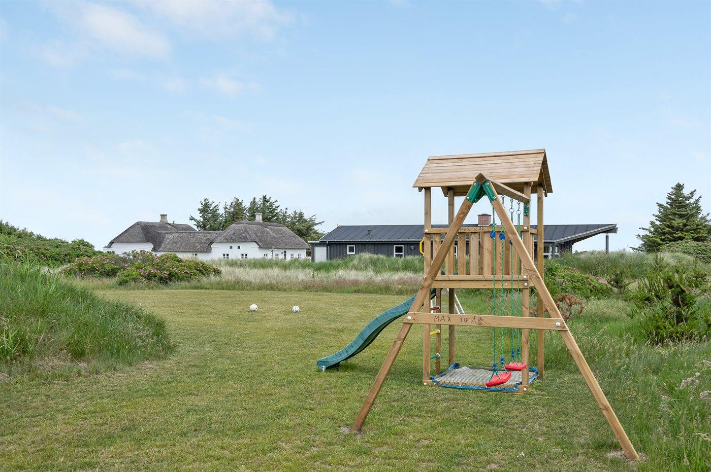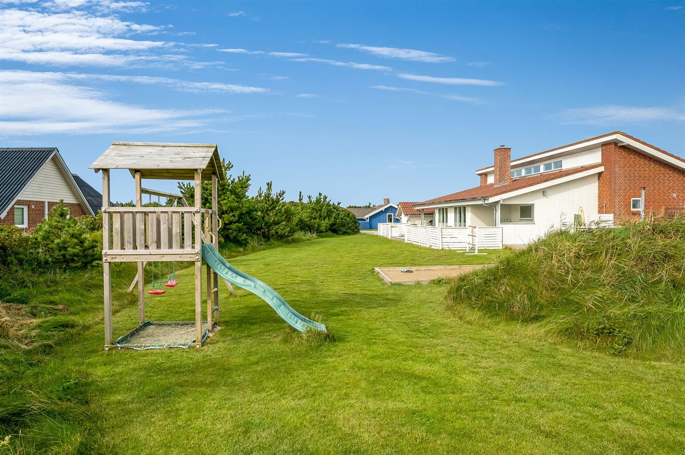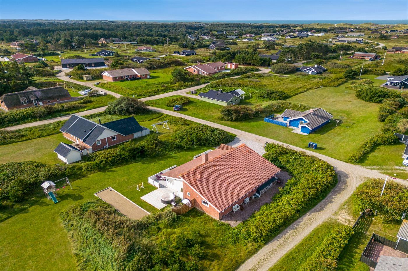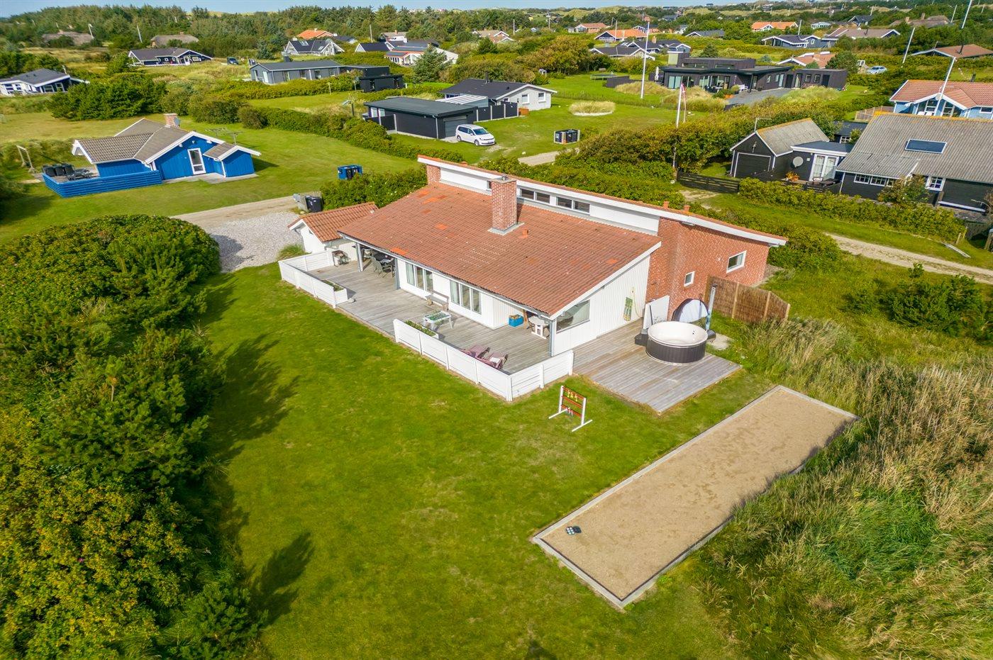 Ferieboligen er beliggende på en 2405 m² stor naturgrund. Der er 900 m til havet. Der er 1000 m til fjorden. Nærmeste forretning er beliggende i en afstand af 2000 m. Til ferieboligen hører 50 m² terrasseareal. Desuden er der 24 m² overdækket terrasse. Gynge. Sandkasse. Legetårn. Petanque. Udendørs bruser. Parkering ved ferieboligen.
