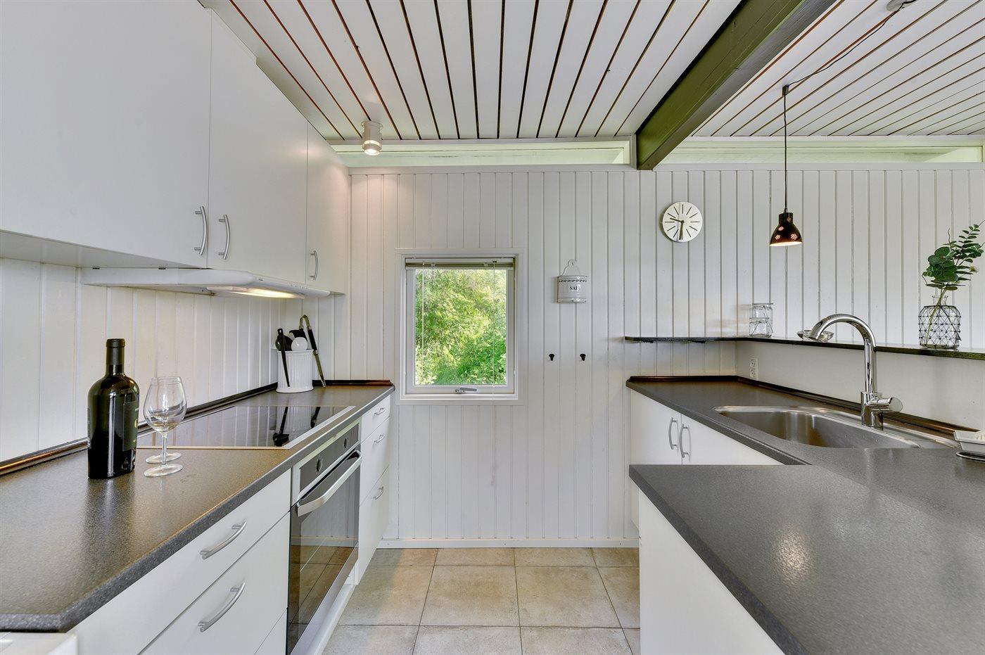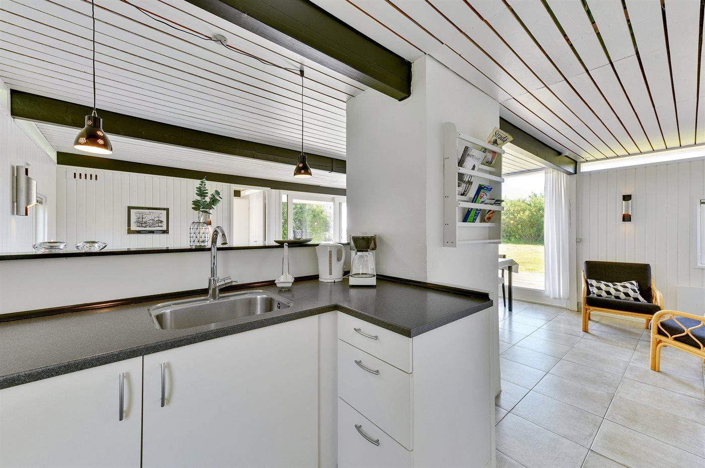 Køkkenet er udstyret med 1 køleskab. Der er 4 keramiske kogeplader, varmluftovn, mikrobølgeovn samt opvaskemaskine.