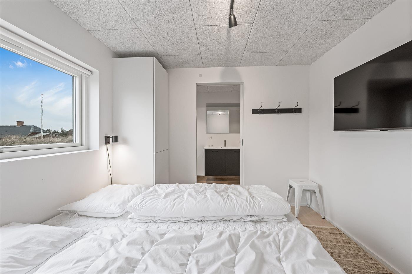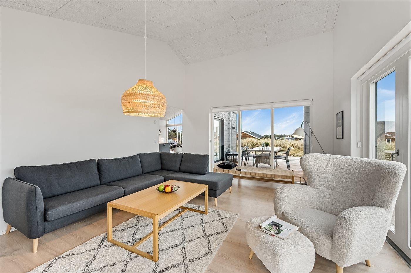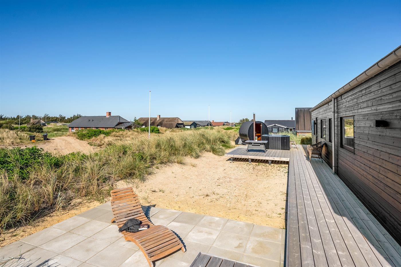 I dette feriehus er du både nær ved Vestkysten og stranden samt golfbane og byen med indkøb, cafeer og restauranter. Selve sommerhuset giver også mulighed for afslapning og forkælelse. Her er et skønt udendørsområde med sauna, bruser og vildmarksbad på terrassen. Huset er moderne og veludstyret med bl.a. et stort opholdsrum og gulvvarme i hele huset for et behageligt indeklima. I et af de to badeværelser finder du en indendørs spa til wellness.