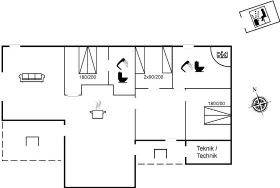 Der er i alt 3 soveværelser. Sovepladserne fordeler sig på: 4 sovepladser i dobbeltsenge. 2 sovepladser i enkeltsenge.