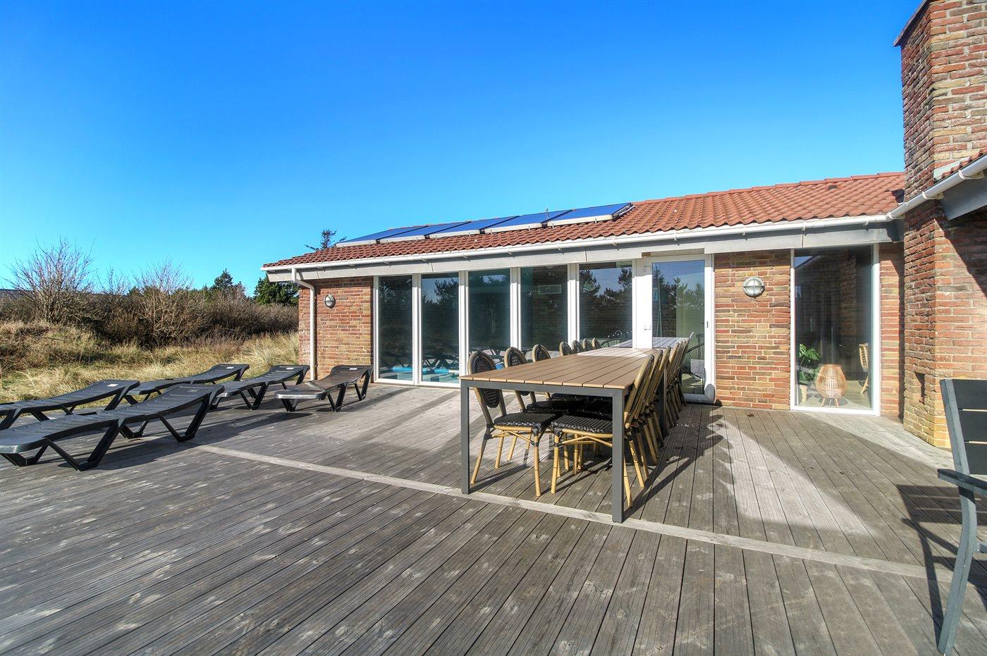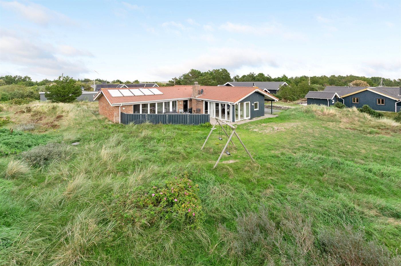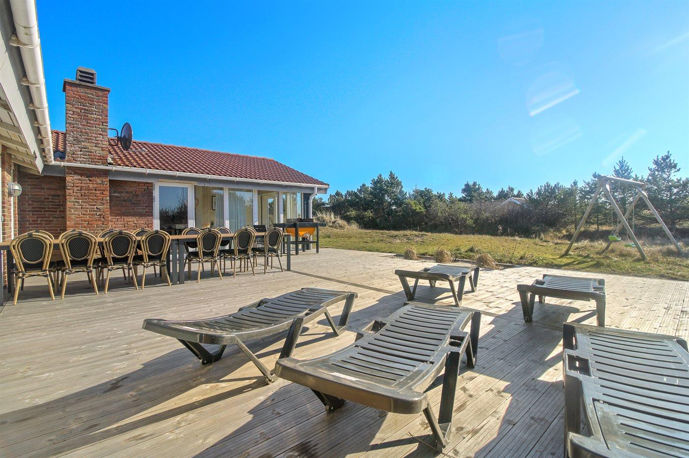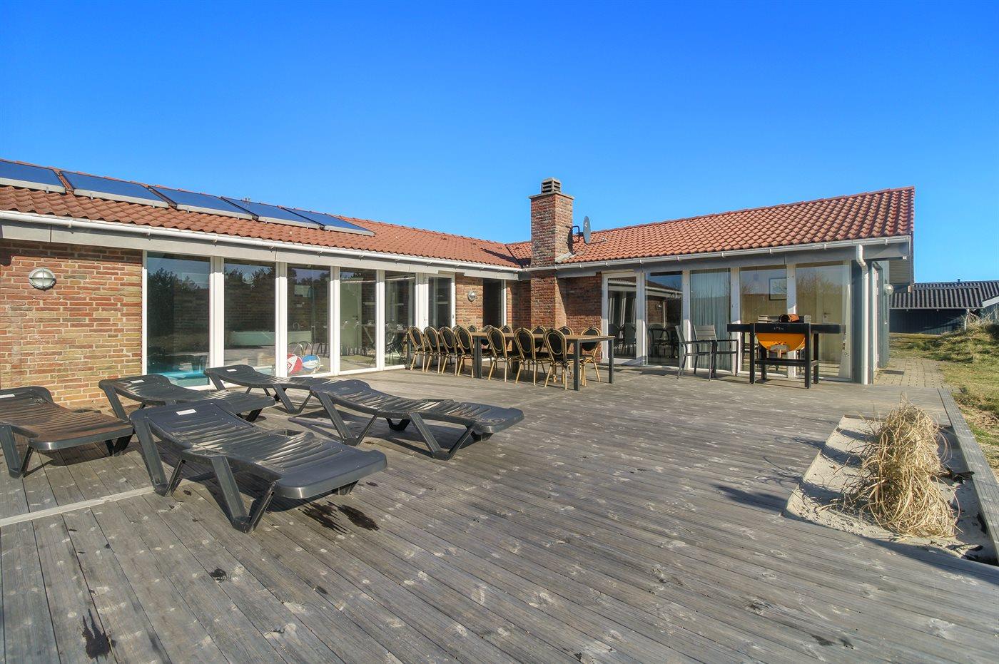I det skønne sommerhusområde Søndervig, kun 900 m fra Vesterhavet, ligger dette dejlige sommerhus med gratis internetadgang (egen computer skal medbringes), pool, spa og sauna. Huset er bygget i sten i 1991 og moderniseret i 2010. Det ligger på en skøn natur-/klitgrund, hvor der er sandkasse og gynge til børnene. Skøn delvist afskærmet terrasse med diverse havemøbler, hvor I rigtigt kan sidde og slappe af og nyde solen. Indvendig er der klinkegulv med gulvvarme overalt. Skøn pool-afdeling med swimmingpool, hvor der er installeret en energivenlig luft til vand varmepumpe til opvarmning af poolen. Denne medvirker til store besparelser på elforbruget. I poolafdelingen findes desuden 2-pers.-spabad samt direkte adgang til det ene badeværelse, hvor der er bruseniche og gulvvarme. Herfra er der adgang til husets sauna. Der findes endnu et badeværelse med gulvvarme og bruseniche. Godt indrettet køkken med komfur med keramiske kogeplader og varmluftovn, mikrobølgeovn, opvaskemaskine, fryser samt køleskab med vanddispenser. God spiseplads. Hyggelig opholdsstue med brændeovn, TV med Boxer-tv, stereoanlæg med CD-afspiller, DVD-afspiller og Playstation2. Husets sovepladser fordeler sig på 5 soveværelser: 3 med dobbeltseng, 1 med 3/4-seng og 1 med 2 køjesenge (4 sovepladser). Til de mindste feriegæster er der barneseng og høj barnestol. Desuden gratis, trådløs internetforbindelse (computer skal medbringes), vaskemaskine og tørretumbler til rådighed. Et dejligt sommerhus, som er velegnet til flere familier, og som ligger i et område, hvor der er gode muligheder for gå- og cykelture, og for at nyde den skønne vestjyske natur. I kan cykle eller køre til badebyen Søndervig, hvor der er et stort moderne supermarked, restauranter, små butikker, bowling- og fitnesscenter m.m. I kan også spille golf og fiske i området.
