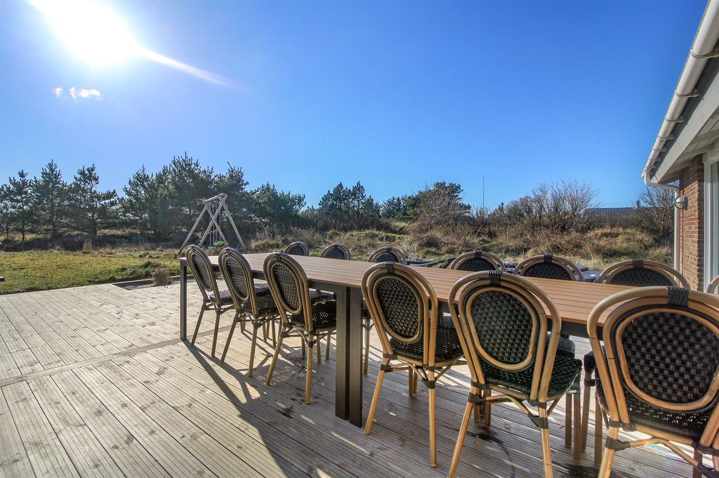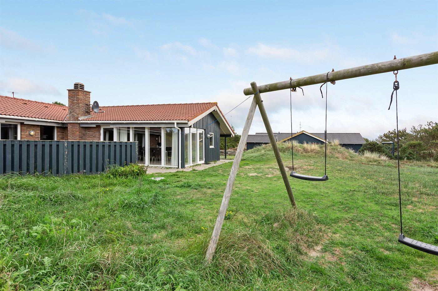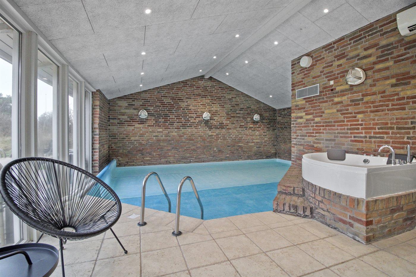 I det skønne sommerhusområde Søndervig, kun 900 m fra Vesterhavet, ligger dette dejlige sommerhus med gratis internetadgang (egen computer skal medbringes), pool, spa og sauna. Huset er bygget i sten i 1991 og moderniseret i 2010. Det ligger på en skøn natur-/klitgrund, hvor der er sandkasse og gynge til børnene. Skøn delvist afskærmet terrasse med diverse havemøbler, hvor I rigtigt kan sidde og slappe af og nyde solen. Indvendig er der klinkegulv med gulvvarme overalt. Skøn pool-afdeling med swimmingpool, hvor der er installeret en energivenlig luft til vand varmepumpe til opvarmning af poolen. Denne medvirker til store besparelser på elforbruget. I poolafdelingen findes desuden 2-pers.-spabad samt direkte adgang til det ene badeværelse, hvor der er bruseniche og gulvvarme. Herfra er der adgang til husets sauna. Der findes endnu et badeværelse med gulvvarme og bruseniche. Godt indrettet køkken med komfur med keramiske kogeplader og varmluftovn, mikrobølgeovn, opvaskemaskine, fryser samt køleskab med vanddispenser. God spiseplads. Hyggelig opholdsstue med brændeovn, TV med Boxer-tv, stereoanlæg med CD-afspiller, DVD-afspiller og Playstation2. Husets sovepladser fordeler sig på 5 soveværelser: 3 med dobbeltseng, 1 med 3/4-seng og 1 med 2 køjesenge (4 sovepladser). Til de mindste feriegæster er der barneseng og høj barnestol. Desuden gratis, trådløs internetforbindelse (computer skal medbringes), vaskemaskine og tørretumbler til rådighed. Et dejligt sommerhus, som er velegnet til flere familier, og som ligger i et område, hvor der er gode muligheder for gå- og cykelture, og for at nyde den skønne vestjyske natur. I kan cykle eller køre til badebyen Søndervig, hvor der er et stort moderne supermarked, restauranter, små butikker, bowling- og fitnesscenter m.m. I kan også spille golf og fiske i området.