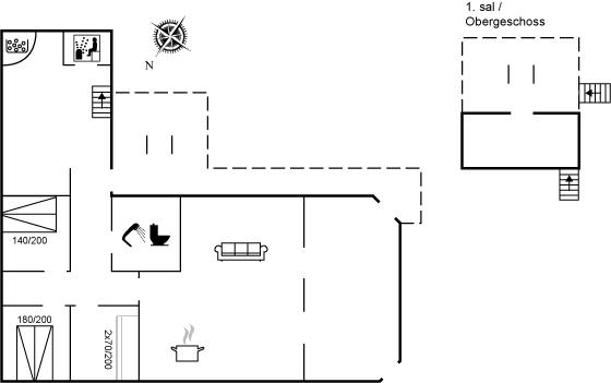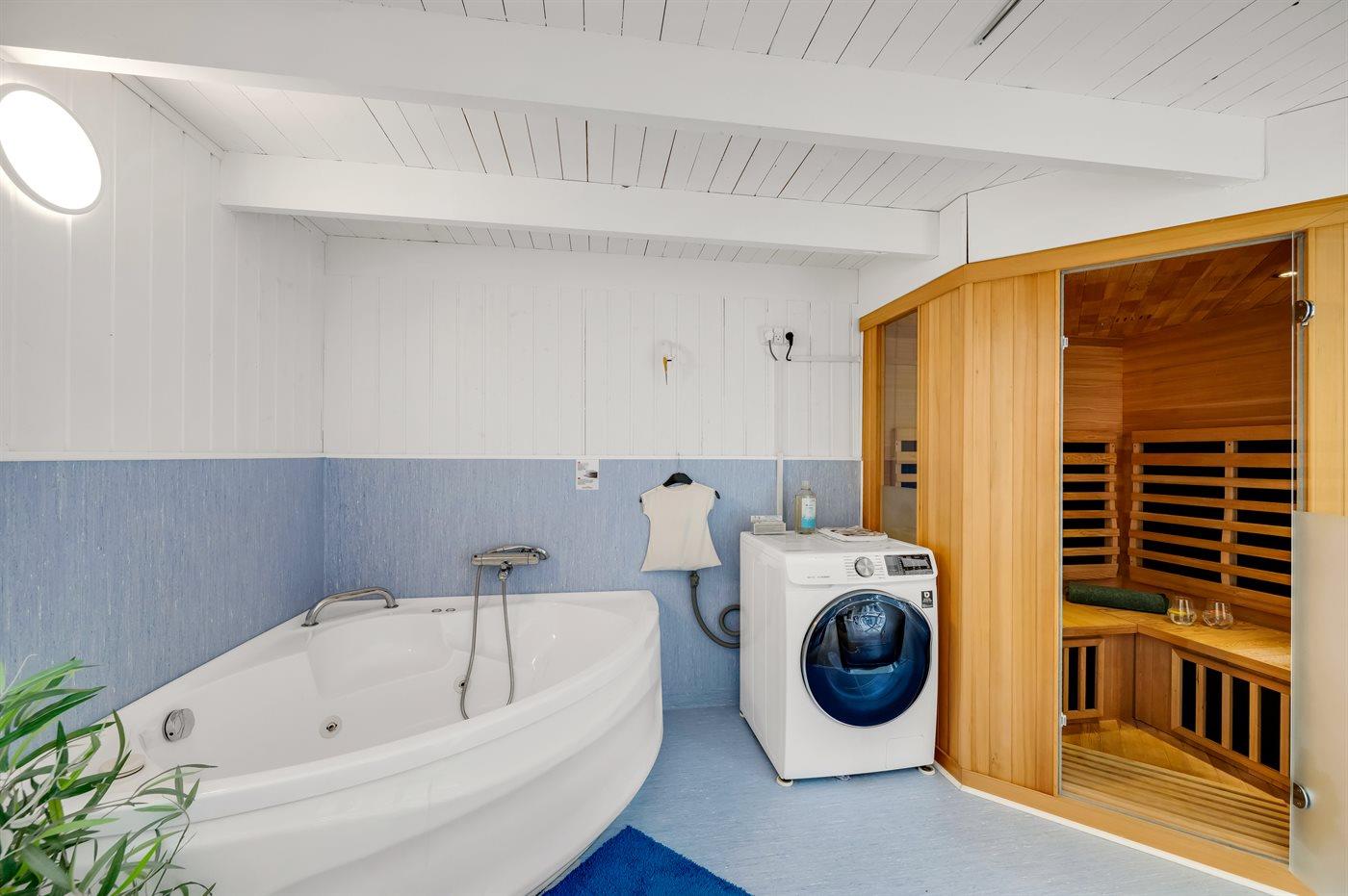 Der er 1 badeværelse med bruseniche og 1 toilet. I saunaen er der mulighed for afslapning.
