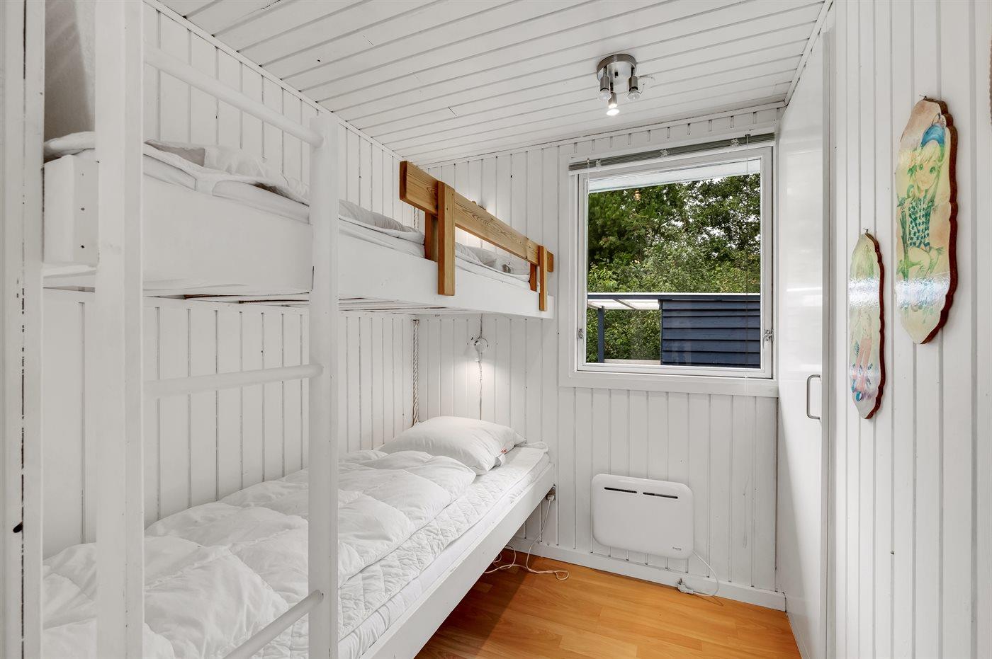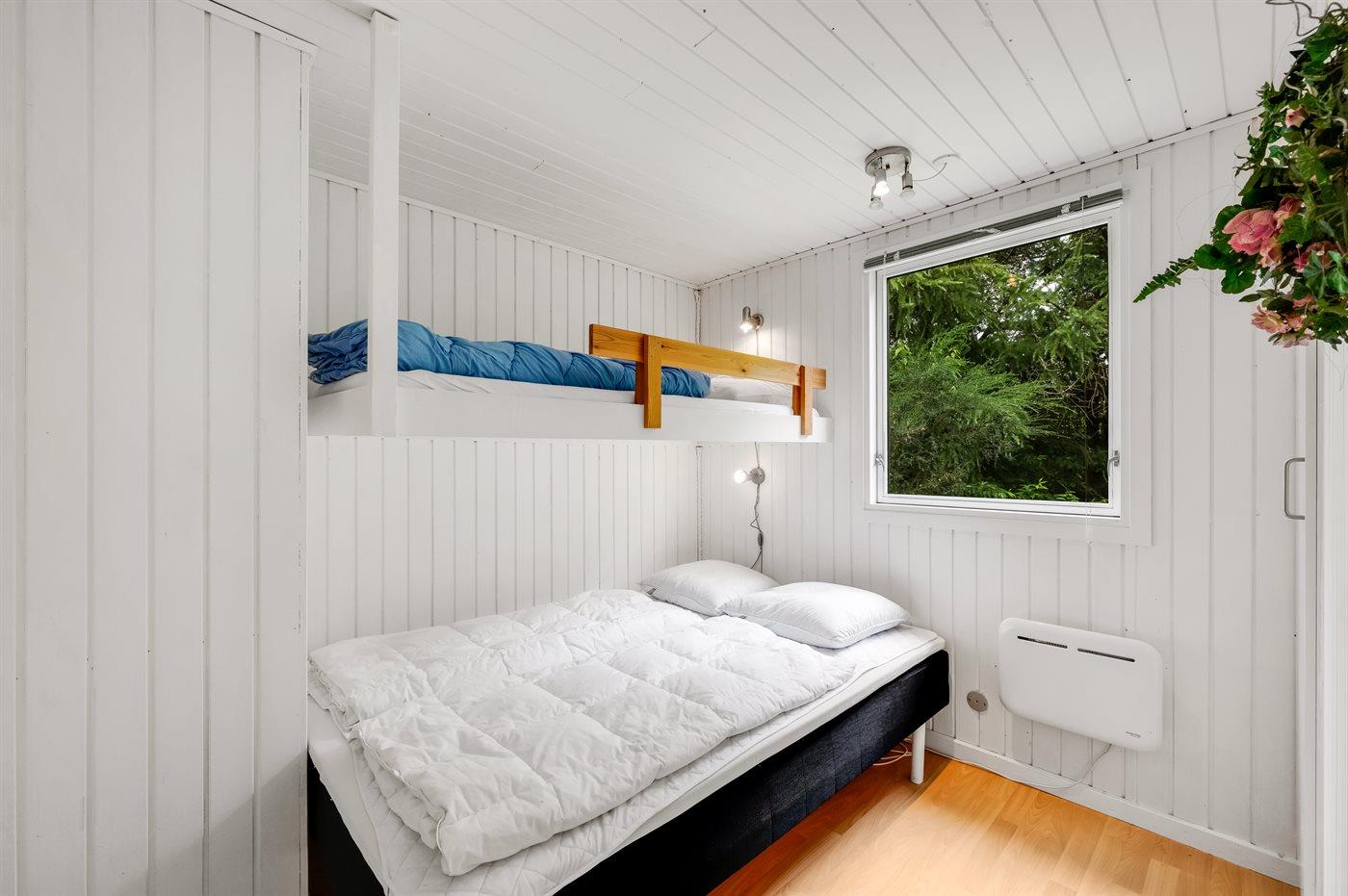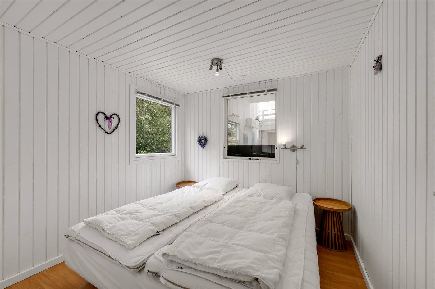 Der er i alt 3 soveværelser. Sovepladserne fordeler sig på: 4 sovepladser i dobbeltsenge. 2 sovepladser i køjeseng. 2 sovepladser på madrasser. 2 af disse sovepladser befinder sig på husets hems. Derudover er der 1 stk. barneseng.