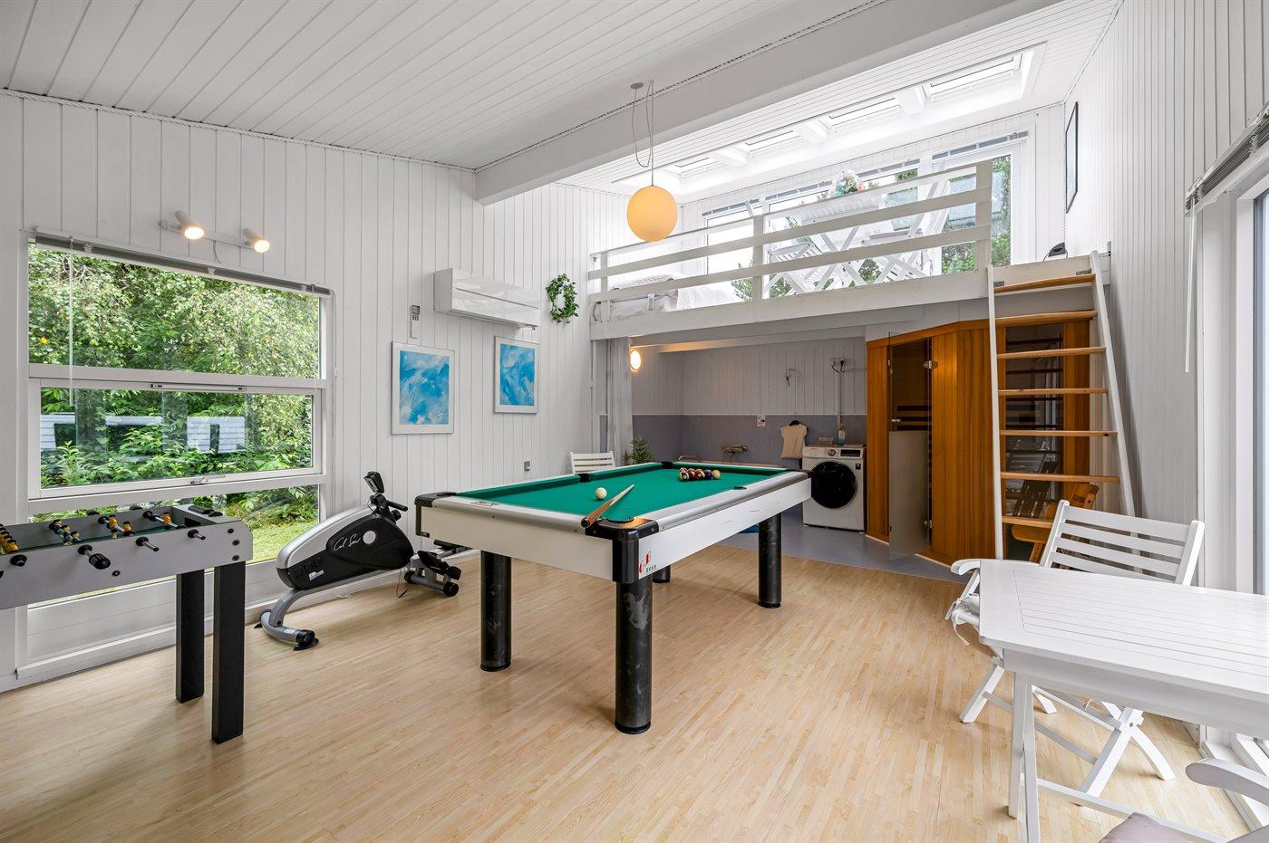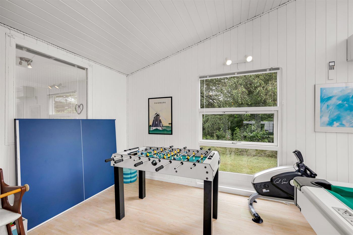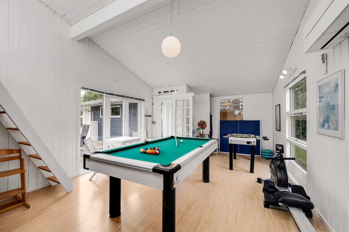 I aktivitetsrummet er der følgende udstyr: Poolbord. Bordtennis. Bordfodbold. Romaskine.