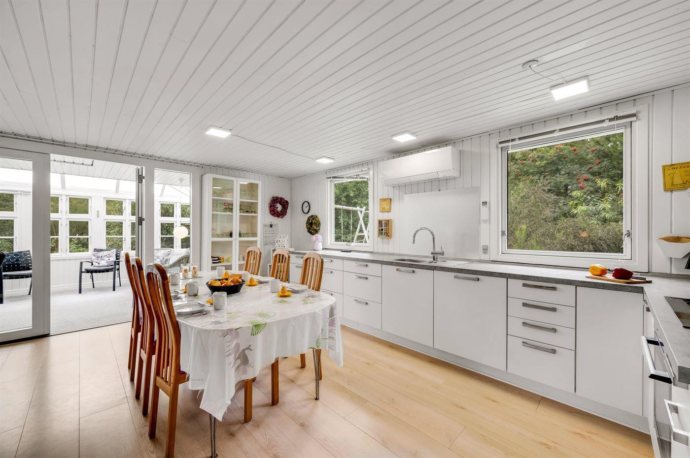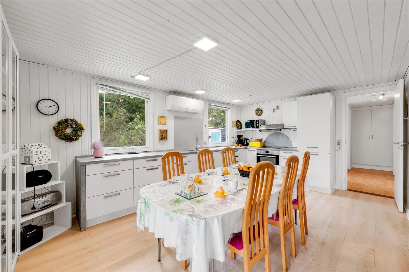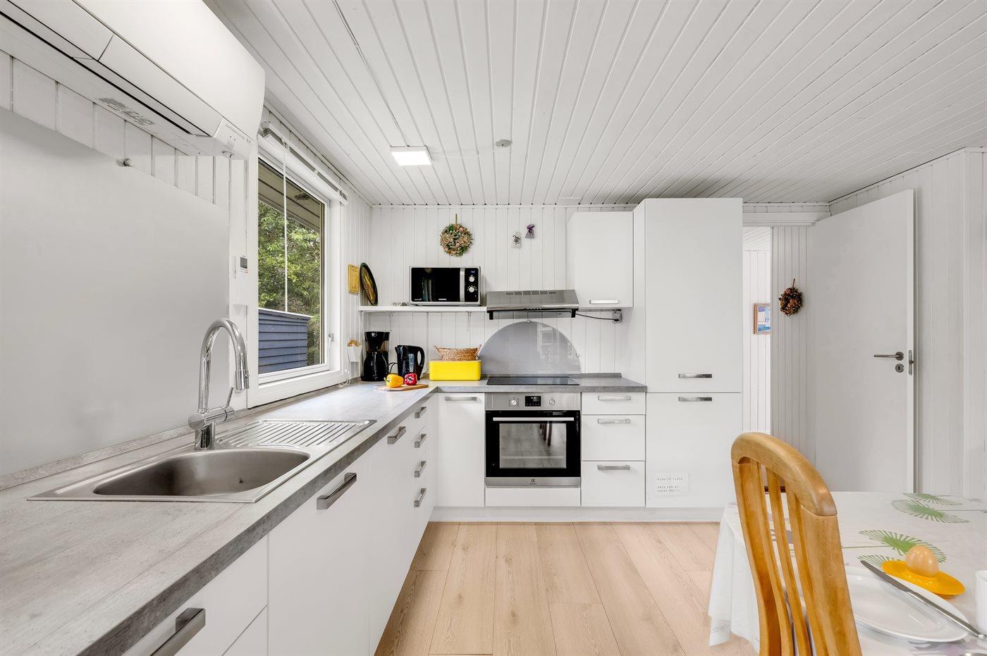 Køkkenet er udstyret med 1 køleskab. Der er 4 keramiske kogeplader, varmluftovn, mikrobølgeovn samt opvaskemaskine.