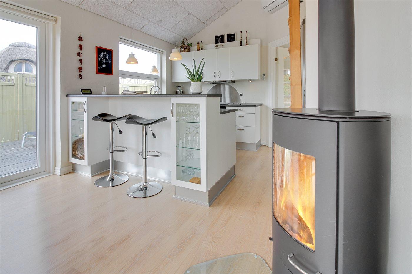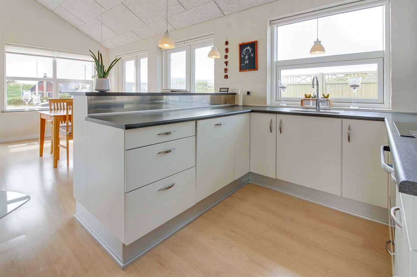 Køkkenet er udstyret med 1 køleskab. Der er 4 keramiske kogeplader, varmluftovn, mikrobølgeovn samt opvaskemaskine.