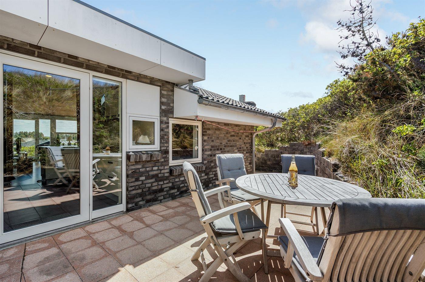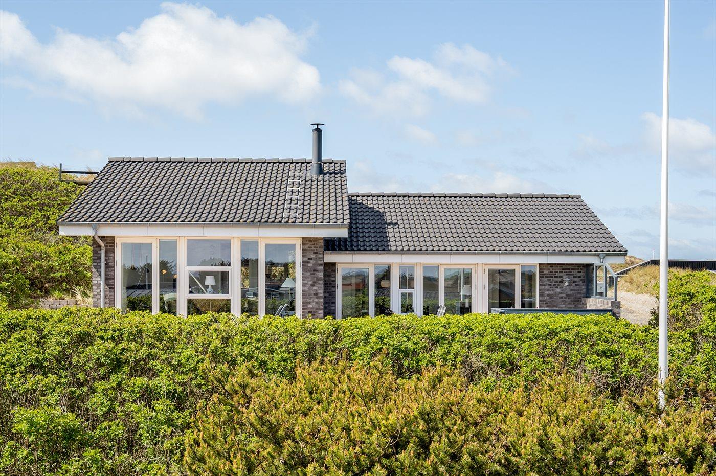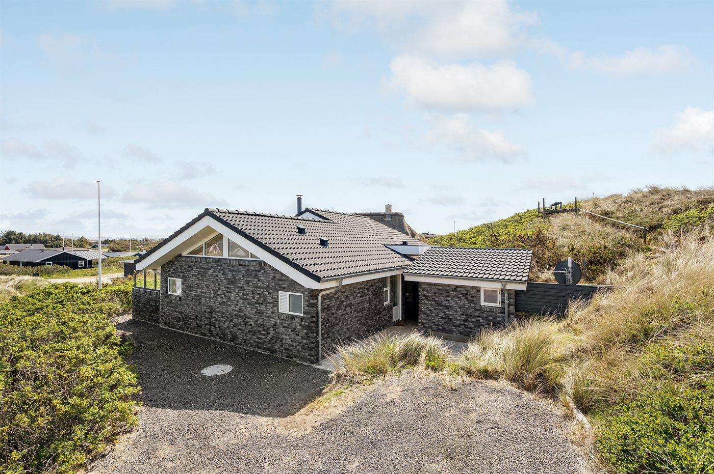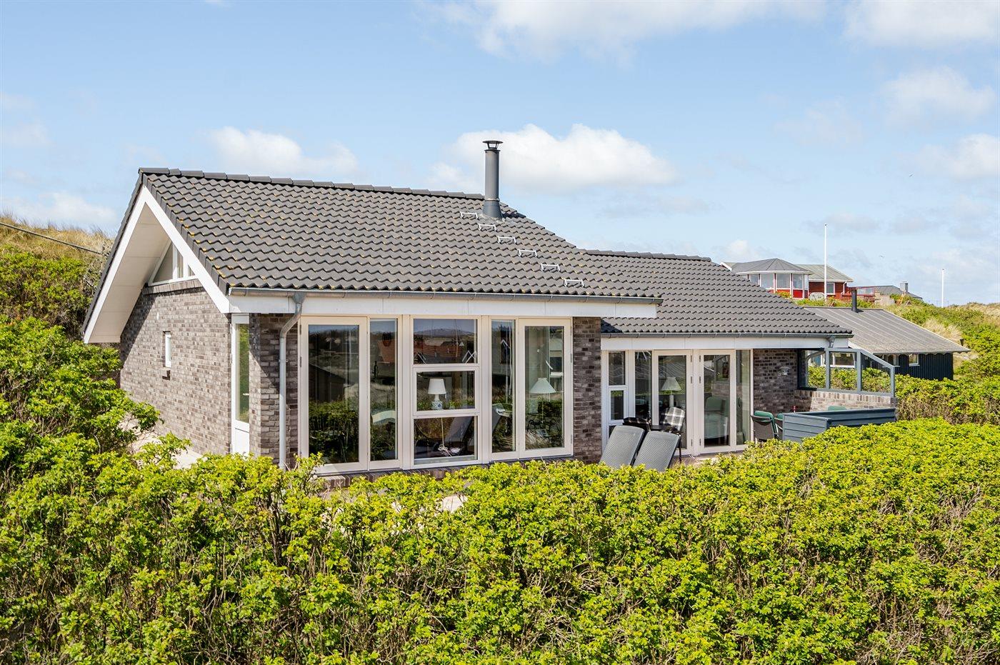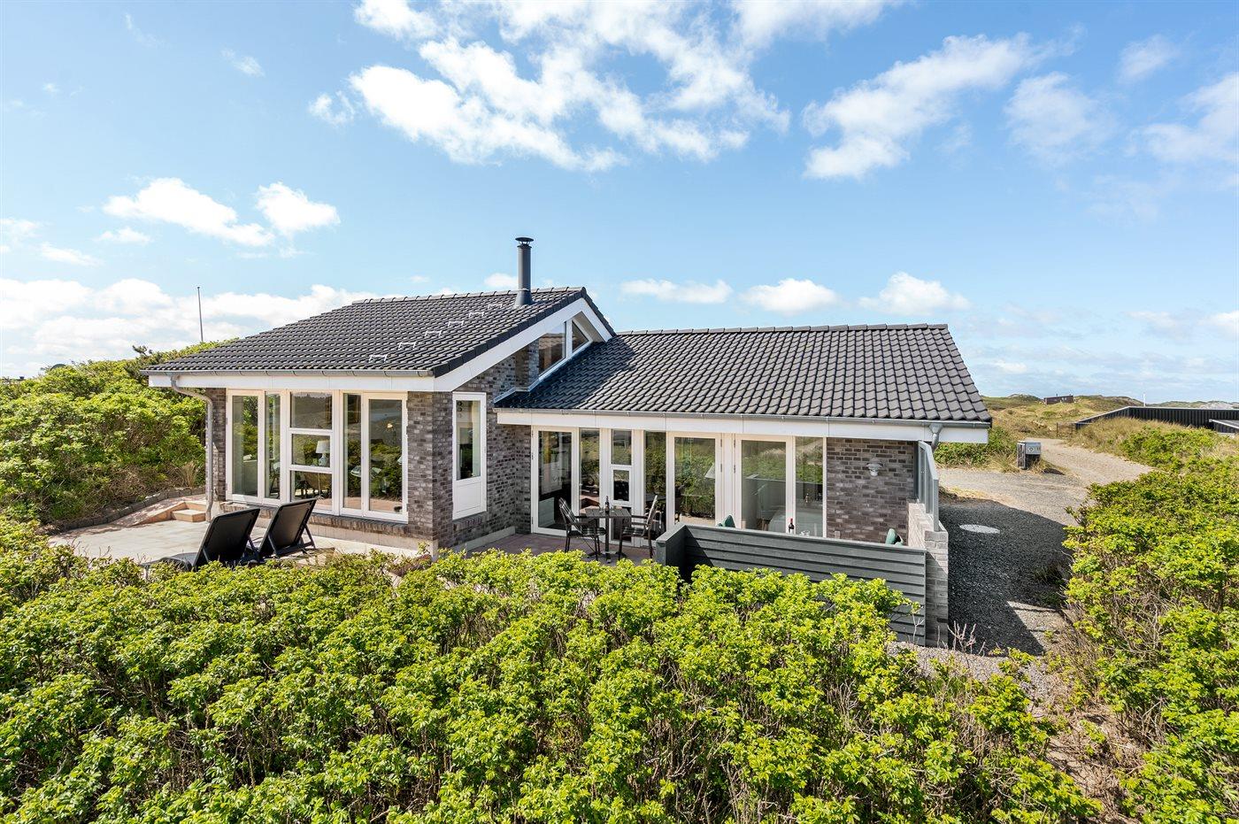 Dette fantastisk flotte sommerhus er bygget i kvalitetsmaterialer i 2009 og ligger højt på en kuperet klitgrund, 300 m fra Vesterhavet og i gåafstand fra Søndervig Centrum. Fra toppen af klitten er der havudsigt. Her findes der en bænk, hvor I kan sidde og nyde udsigten over fjord og hav og samtidig opleve solnedgangen over Vesterhavet. Fra huset er der anlagt gangsti direkte til havet. Et skønt terrasseareal med diverse havemøbler, hvorfra I kan nyde den flotte udsigt over fjorden, omgiver huset. På den ene terrasse findes der endvidere udekøkken med varm og kold vand. Det flotte og velindrettede køkken er bl.a. udstyret med opvaskemaskine, mikrobølgeovn, fryser, varmluftovn og komfur med keramiske kogeplader. Smagfuld indrettet og møbleret opholdsstue med brændeovn, TV med parabol (digital), DVD-afspiller og stereoanlæg med CD-afspiller. Sovepladserne fordeler sig på 2 gode værelser med dobbeltseng, og 1 værelse med dobbelt sovesofa. 2 lækre badeværelser, begge med gulvvarme og bruseniche. Fra det ene badeværelse er der endvidere direkte adgang til husets sauna. Af yderligere udstyr kan gratis, trådløs internetforbindelse (computer skal medbringes), vaskemaskine samt tørretumbler nævnes og der er installeret energibesparende varmepumpe. Dels trægulve, dels klinkegulve. Ønsker I at holde ferie i stilfulde omgivelser, er dette sommerhus et rigtigt godt valg.