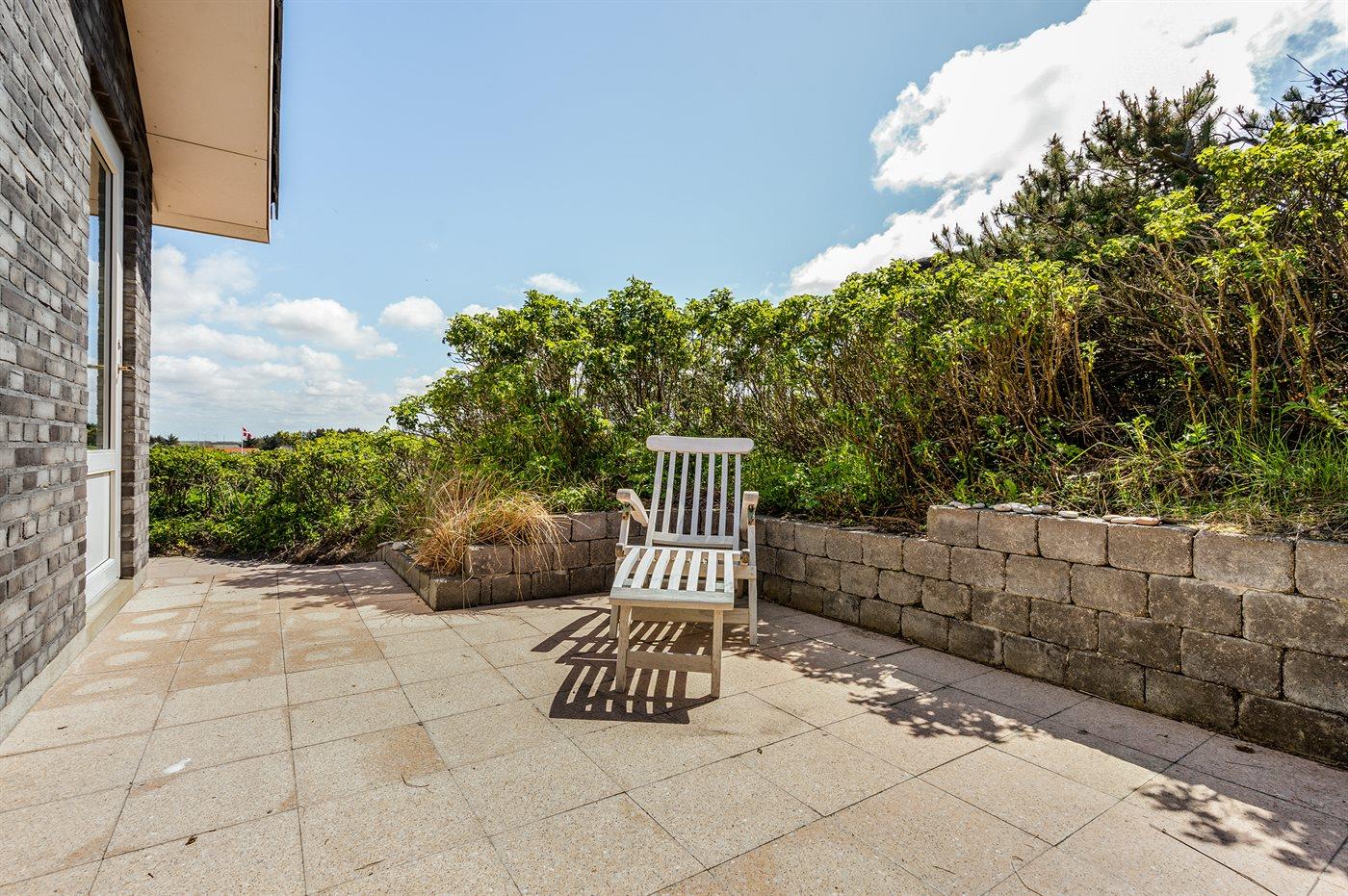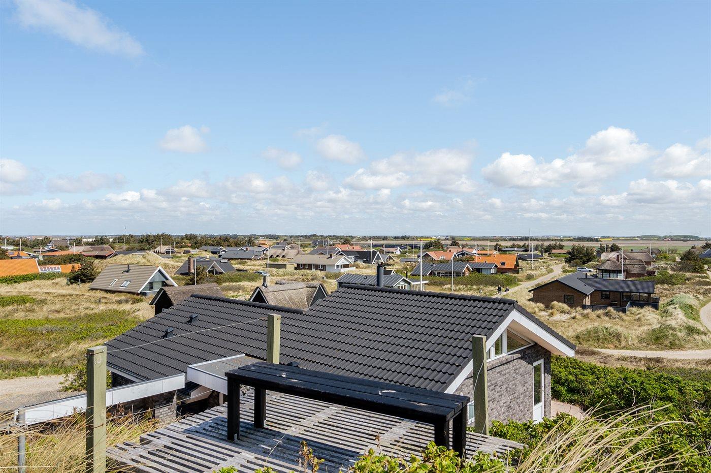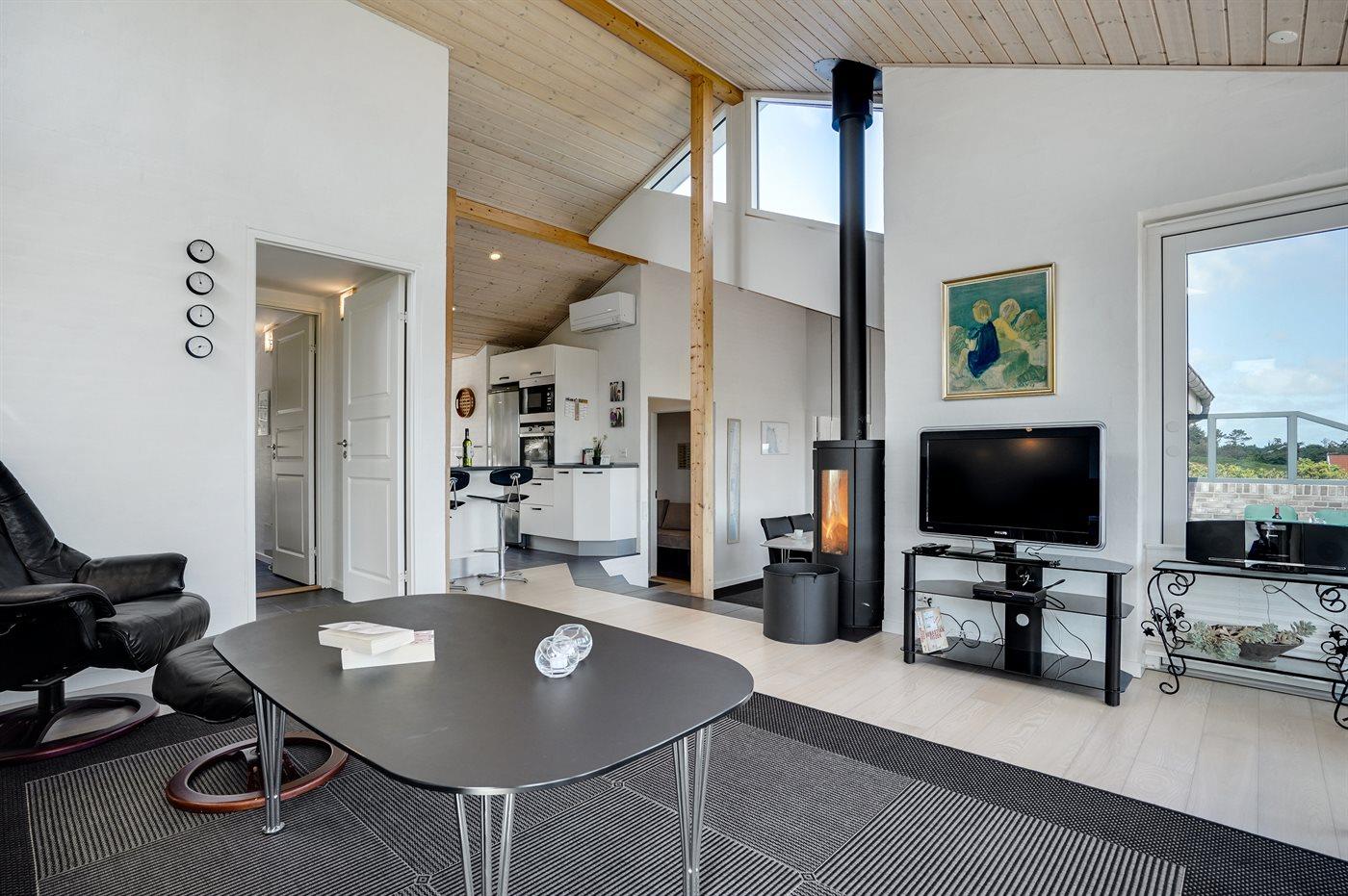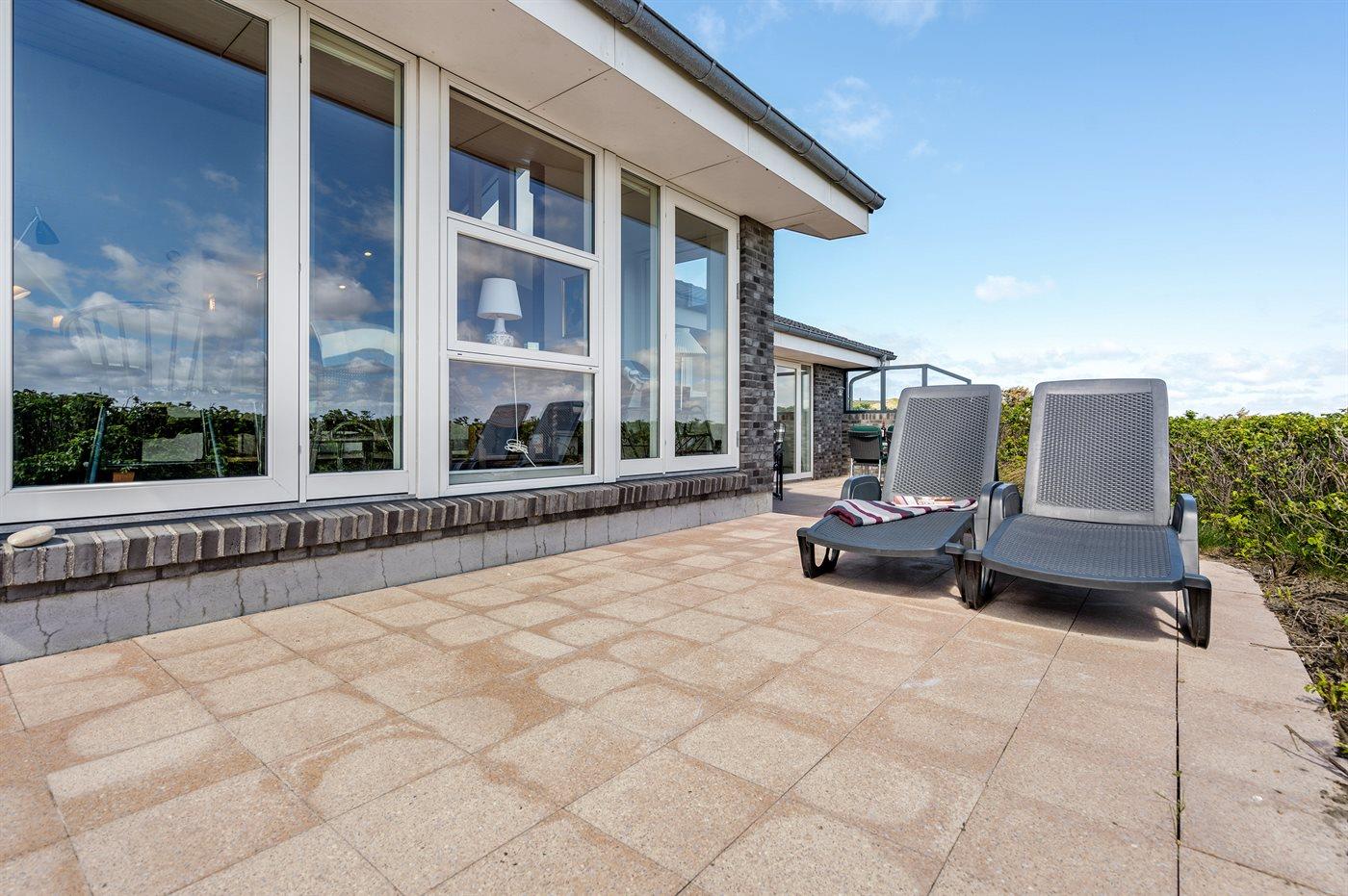 Dette fantastisk flotte sommerhus er bygget i kvalitetsmaterialer i 2009 og ligger højt på en kuperet klitgrund, 300 m fra Vesterhavet og i gåafstand fra Søndervig Centrum. Fra toppen af klitten er der havudsigt. Her findes der en bænk, hvor I kan sidde og nyde udsigten over fjord og hav og samtidig opleve solnedgangen over Vesterhavet. Fra huset er der anlagt gangsti direkte til havet. Et skønt terrasseareal med diverse havemøbler, hvorfra I kan nyde den flotte udsigt over fjorden, omgiver huset. På den ene terrasse findes der endvidere udekøkken med varm og kold vand. Det flotte og velindrettede køkken er bl.a. udstyret med opvaskemaskine, mikrobølgeovn, fryser, varmluftovn og komfur med keramiske kogeplader. Smagfuld indrettet og møbleret opholdsstue med brændeovn, TV med parabol (digital), DVD-afspiller og stereoanlæg med CD-afspiller. Sovepladserne fordeler sig på 2 gode værelser med dobbeltseng, og 1 værelse med dobbelt sovesofa. 2 lækre badeværelser, begge med gulvvarme og bruseniche. Fra det ene badeværelse er der endvidere direkte adgang til husets sauna. Af yderligere udstyr kan gratis, trådløs internetforbindelse (computer skal medbringes), vaskemaskine samt tørretumbler nævnes og der er installeret energibesparende varmepumpe. Dels trægulve, dels klinkegulve. Ønsker I at holde ferie i stilfulde omgivelser, er dette sommerhus et rigtigt godt valg.