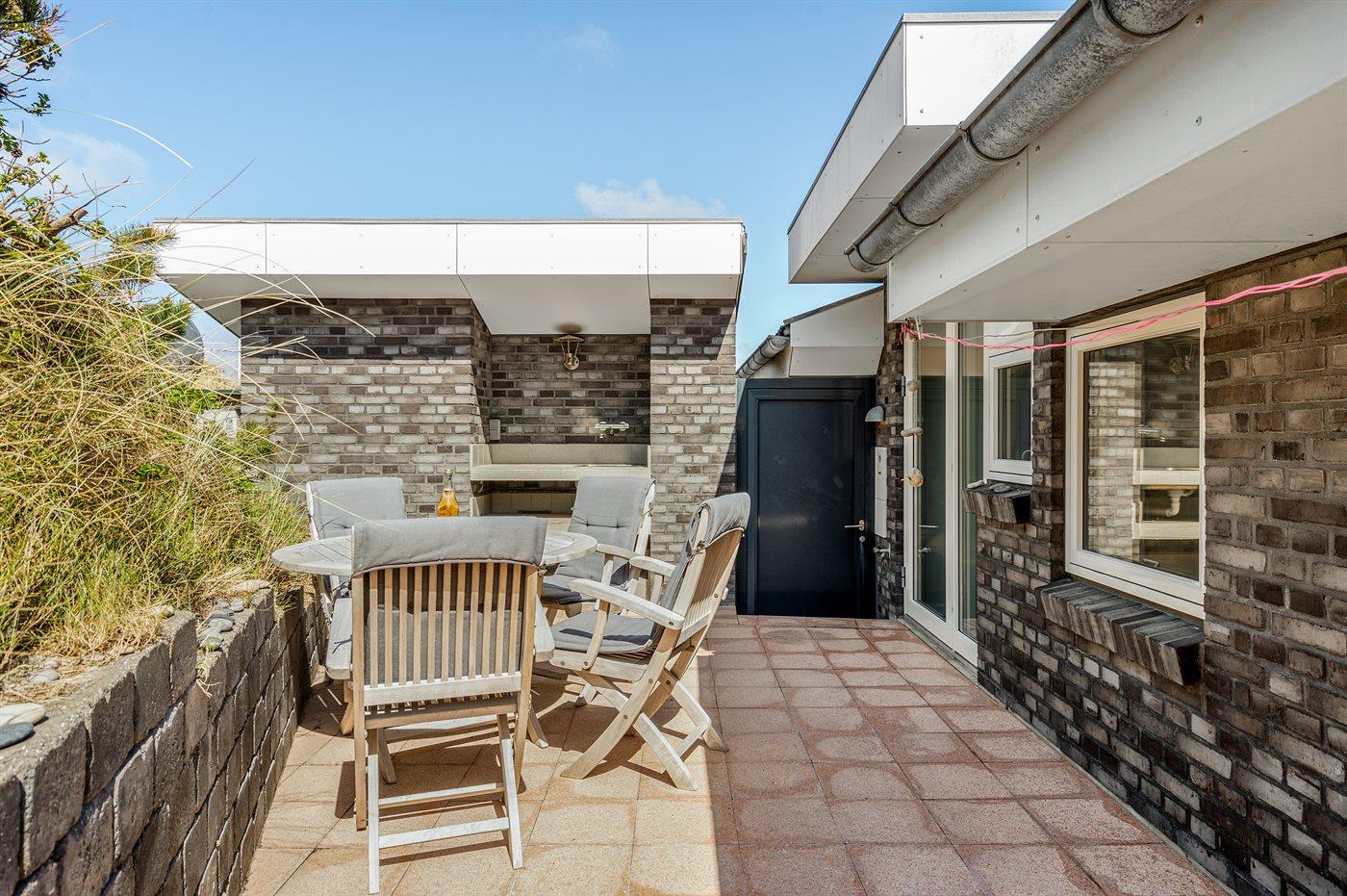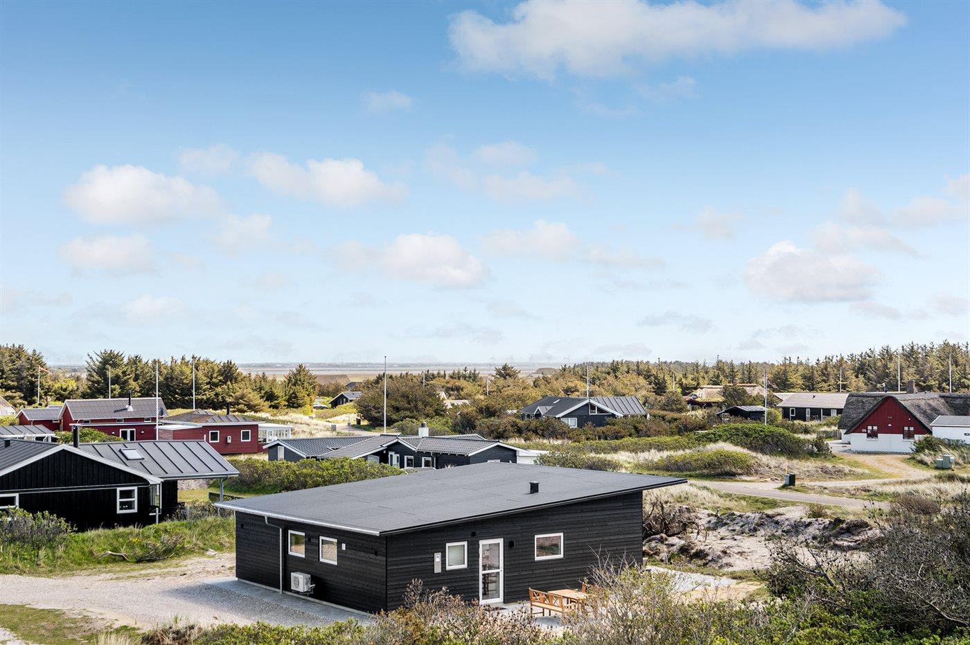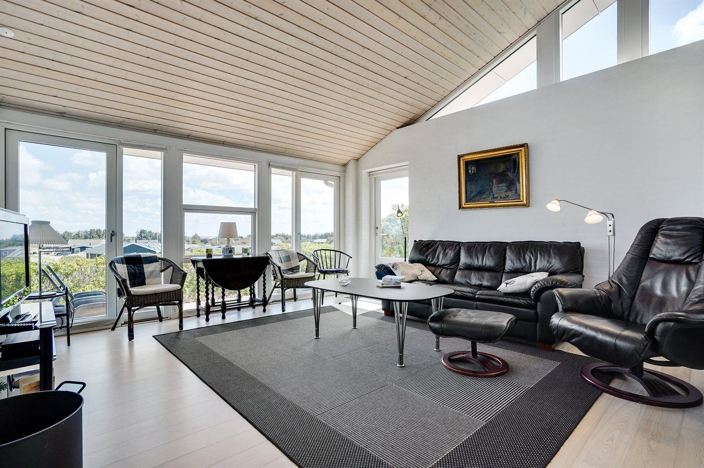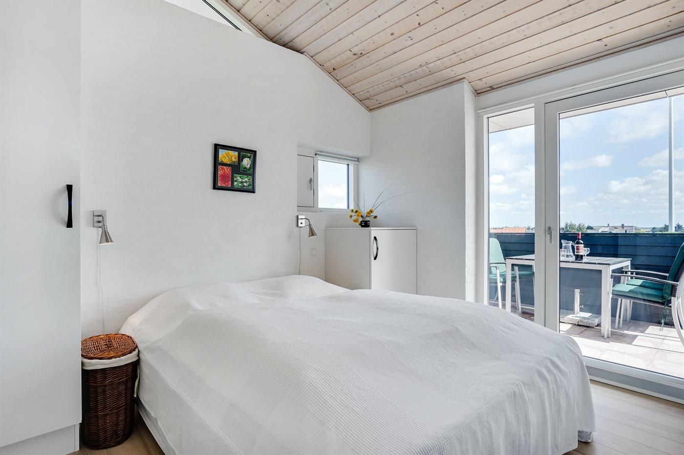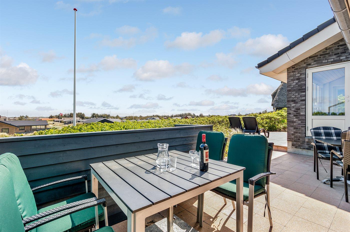 Dette fantastisk flotte sommerhus er bygget i kvalitetsmaterialer i 2009 og ligger højt på en kuperet klitgrund, 300 m fra Vesterhavet og i gåafstand fra Søndervig Centrum. Fra toppen af klitten er der havudsigt. Her findes der en bænk, hvor I kan sidde og nyde udsigten over fjord og hav og samtidig opleve solnedgangen over Vesterhavet. Fra huset er der anlagt gangsti direkte til havet. Et skønt terrasseareal med diverse havemøbler, hvorfra I kan nyde den flotte udsigt over fjorden, omgiver huset. På den ene terrasse findes der endvidere udekøkken med varm og kold vand. Det flotte og velindrettede køkken er bl.a. udstyret med opvaskemaskine, mikrobølgeovn, fryser, varmluftovn og komfur med keramiske kogeplader. Smagfuld indrettet og møbleret opholdsstue med brændeovn, TV med parabol (digital), DVD-afspiller og stereoanlæg med CD-afspiller. Sovepladserne fordeler sig på 2 gode værelser med dobbeltseng, og 1 værelse med dobbelt sovesofa. 2 lækre badeværelser, begge med gulvvarme og bruseniche. Fra det ene badeværelse er der endvidere direkte adgang til husets sauna. Af yderligere udstyr kan gratis, trådløs internetforbindelse (computer skal medbringes), vaskemaskine samt tørretumbler nævnes og der er installeret energibesparende varmepumpe. Dels trægulve, dels klinkegulve. Ønsker I at holde ferie i stilfulde omgivelser, er dette sommerhus et rigtigt godt valg.