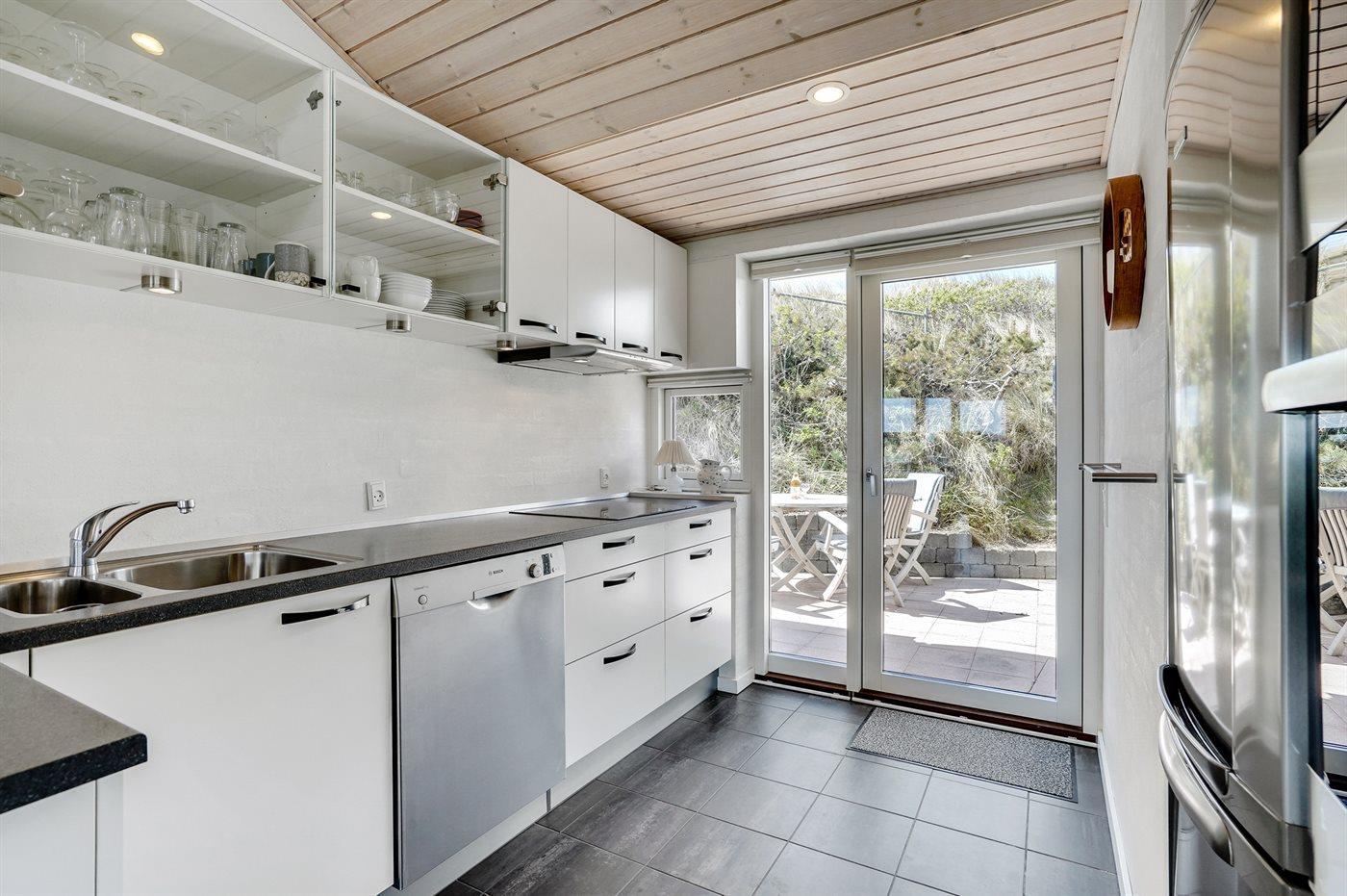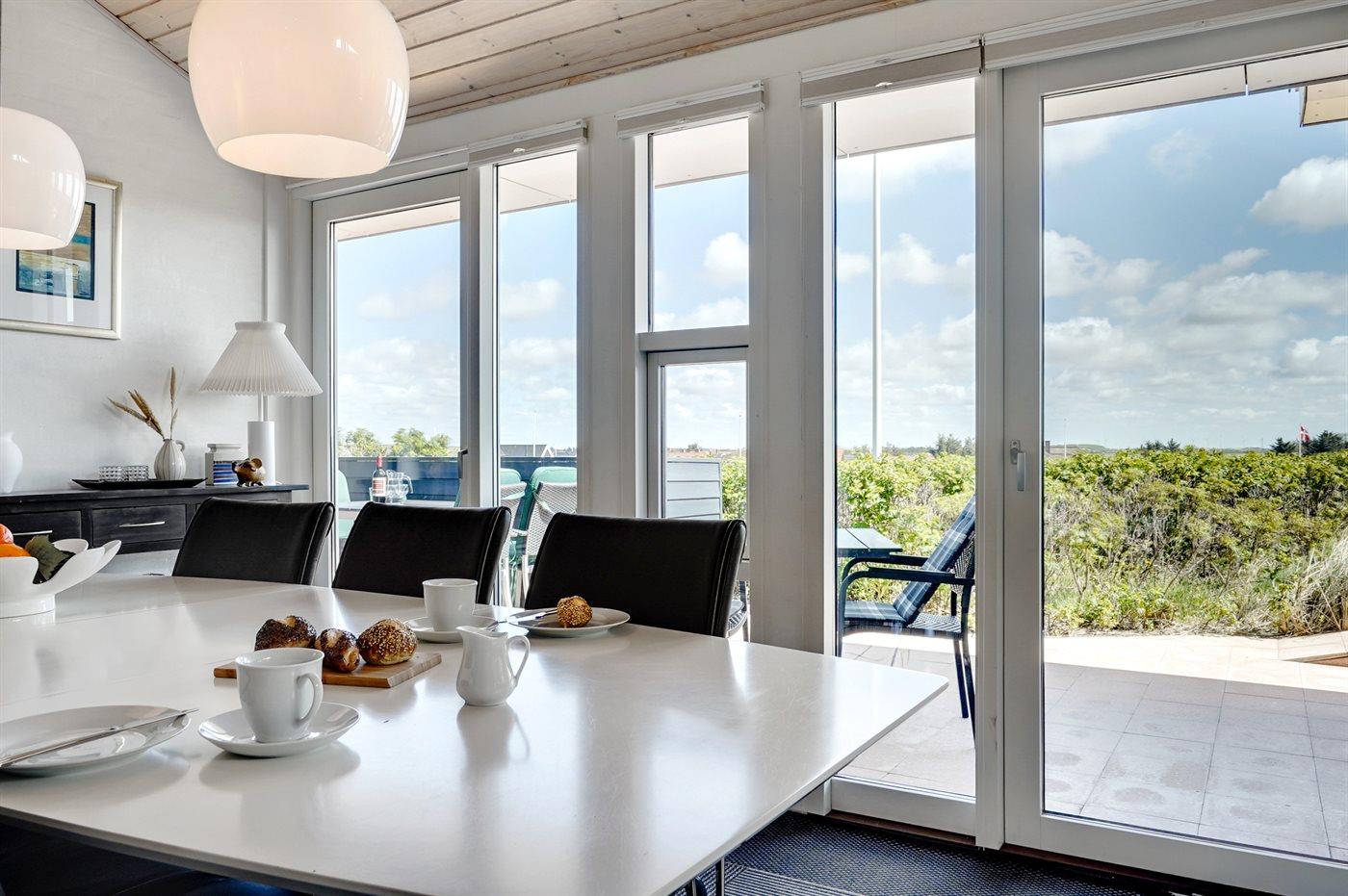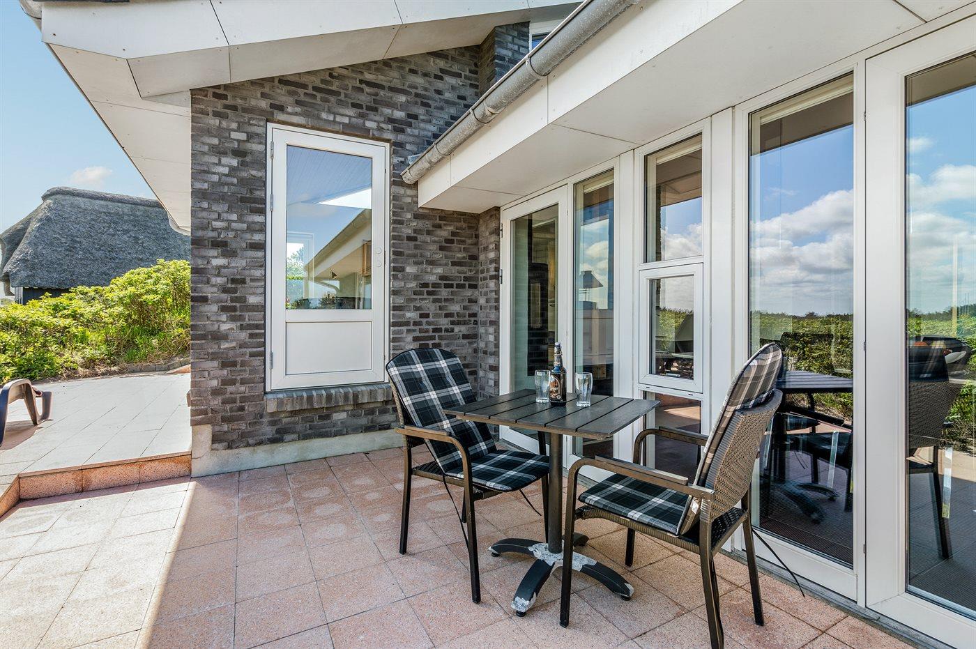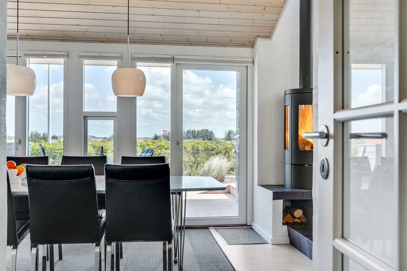 Dette fantastisk flotte sommerhus er bygget i kvalitetsmaterialer i 2009 og ligger højt på en kuperet klitgrund, 300 m fra Vesterhavet og i gåafstand fra Søndervig Centrum. Fra toppen af klitten er der havudsigt. Her findes der en bænk, hvor I kan sidde og nyde udsigten over fjord og hav og samtidig opleve solnedgangen over Vesterhavet. Fra huset er der anlagt gangsti direkte til havet. Et skønt terrasseareal med diverse havemøbler, hvorfra I kan nyde den flotte udsigt over fjorden, omgiver huset. På den ene terrasse findes der endvidere udekøkken med varm og kold vand. Det flotte og velindrettede køkken er bl.a. udstyret med opvaskemaskine, mikrobølgeovn, fryser, varmluftovn og komfur med keramiske kogeplader. Smagfuld indrettet og møbleret opholdsstue med brændeovn, TV med parabol (digital), DVD-afspiller og stereoanlæg med CD-afspiller. Sovepladserne fordeler sig på 2 gode værelser med dobbeltseng, og 1 værelse med dobbelt sovesofa. 2 lækre badeværelser, begge med gulvvarme og bruseniche. Fra det ene badeværelse er der endvidere direkte adgang til husets sauna. Af yderligere udstyr kan gratis, trådløs internetforbindelse (computer skal medbringes), vaskemaskine samt tørretumbler nævnes og der er installeret energibesparende varmepumpe. Dels trægulve, dels klinkegulve. Ønsker I at holde ferie i stilfulde omgivelser, er dette sommerhus et rigtigt godt valg.