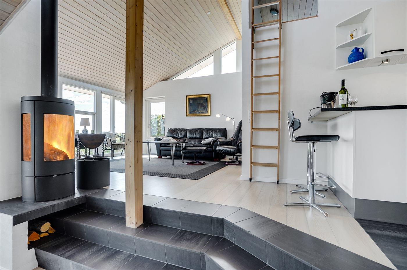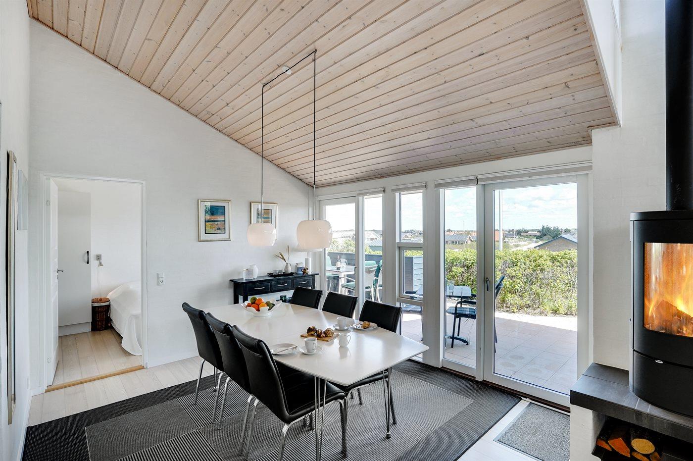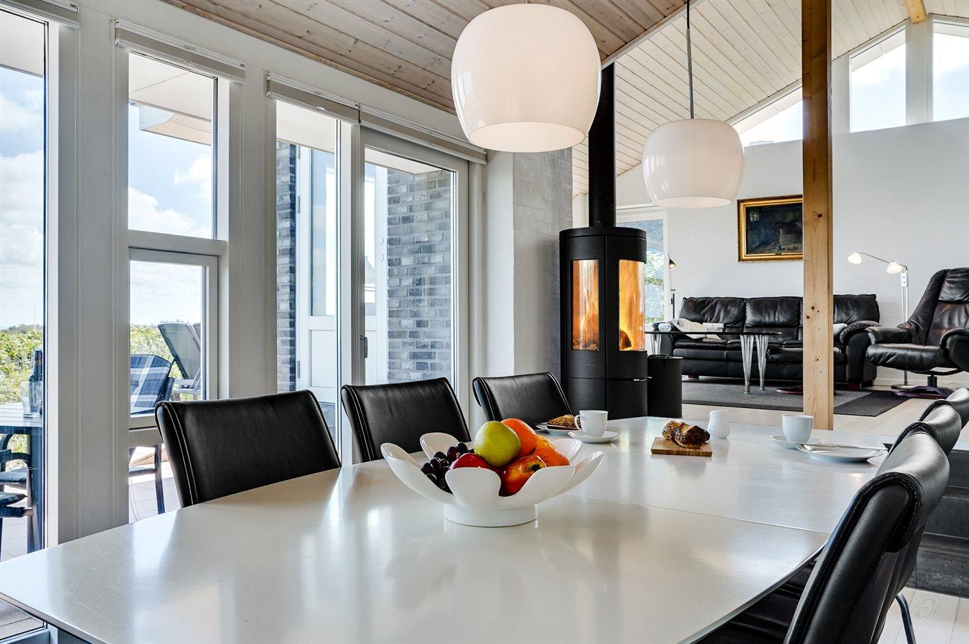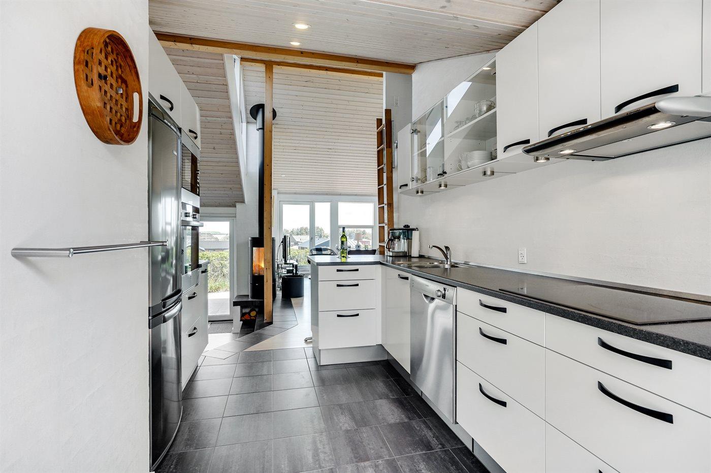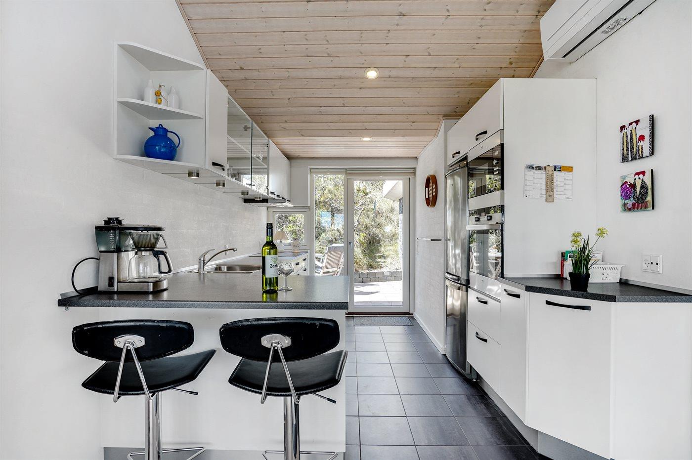 Dette fantastisk flotte sommerhus er bygget i kvalitetsmaterialer i 2009 og ligger højt på en kuperet klitgrund, 300 m fra Vesterhavet og i gåafstand fra Søndervig Centrum. Fra toppen af klitten er der havudsigt. Her findes der en bænk, hvor I kan sidde og nyde udsigten over fjord og hav og samtidig opleve solnedgangen over Vesterhavet. Fra huset er der anlagt gangsti direkte til havet. Et skønt terrasseareal med diverse havemøbler, hvorfra I kan nyde den flotte udsigt over fjorden, omgiver huset. På den ene terrasse findes der endvidere udekøkken med varm og kold vand. Det flotte og velindrettede køkken er bl.a. udstyret med opvaskemaskine, mikrobølgeovn, fryser, varmluftovn og komfur med keramiske kogeplader. Smagfuld indrettet og møbleret opholdsstue med brændeovn, TV med parabol (digital), DVD-afspiller og stereoanlæg med CD-afspiller. Sovepladserne fordeler sig på 2 gode værelser med dobbeltseng, og 1 værelse med dobbelt sovesofa. 2 lækre badeværelser, begge med gulvvarme og bruseniche. Fra det ene badeværelse er der endvidere direkte adgang til husets sauna. Af yderligere udstyr kan gratis, trådløs internetforbindelse (computer skal medbringes), vaskemaskine samt tørretumbler nævnes og der er installeret energibesparende varmepumpe. Dels trægulve, dels klinkegulve. Ønsker I at holde ferie i stilfulde omgivelser, er dette sommerhus et rigtigt godt valg.
