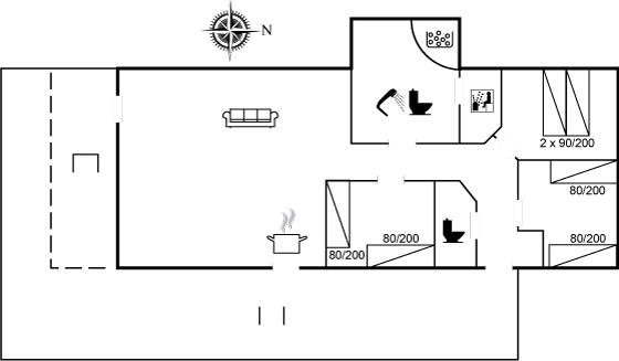 Der er i alt 3 soveværelser. Sovepladserne fordeler sig på: 2 sovepladser i dobbeltseng. 4 sovepladser i enkeltsenge.