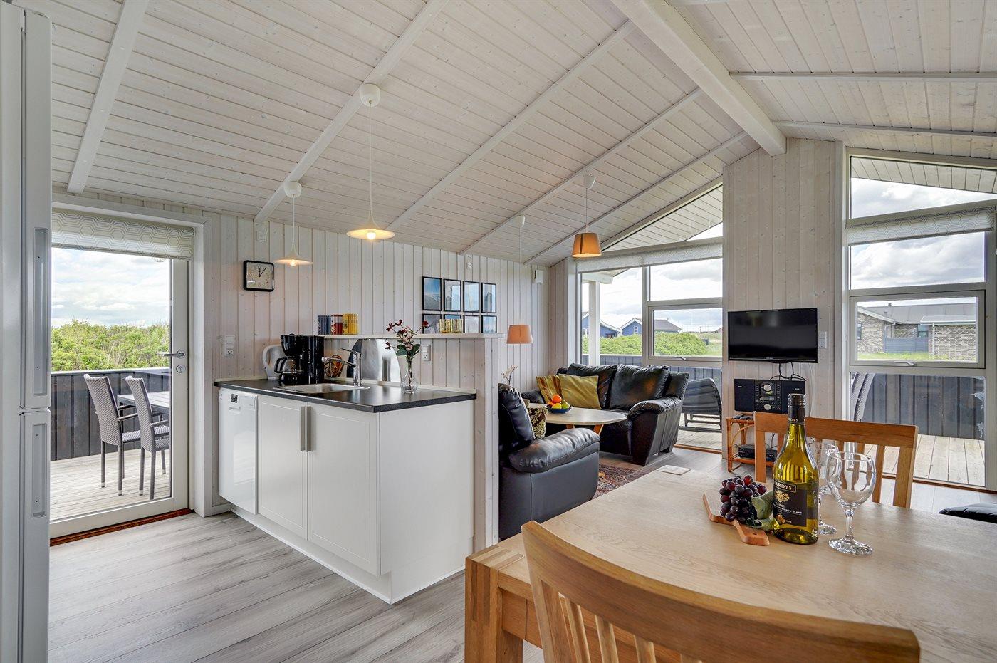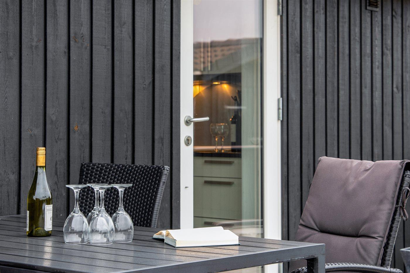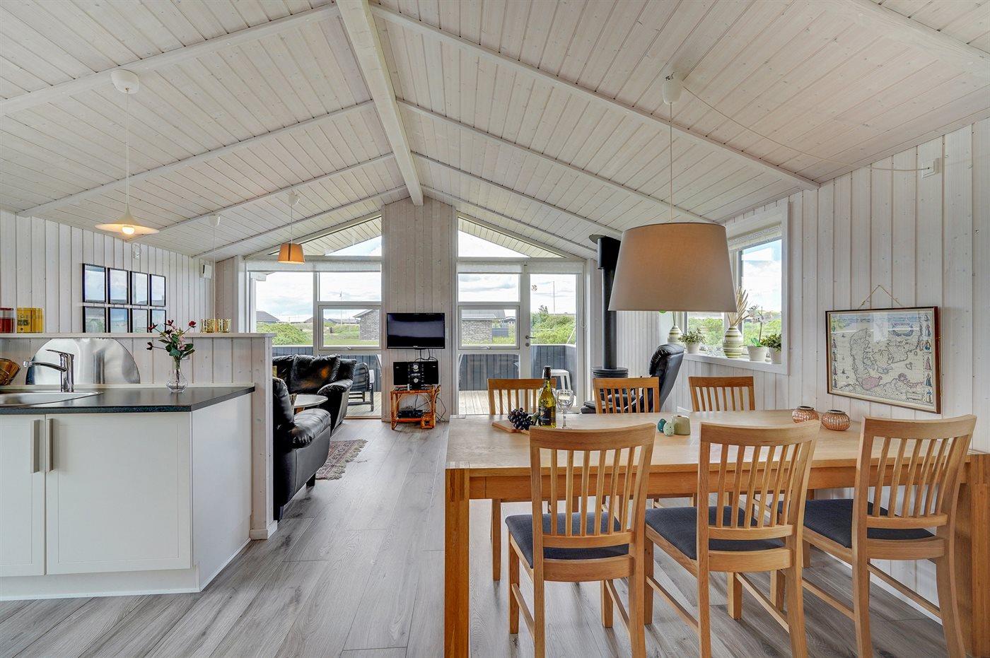 Dette flotte sommerhus, bygget i 2017, ligger på en stor grund med plads til udendørs aktiviteter. Huset er flot og lyst indrettet og i den hyggelige spise-/opholdsstue sørger de store vinduespartier for et godt lysindfald. Til huset hører en stor og aflukket terrasse, delvist overdækket, med havemøbler og fine læ forhold.