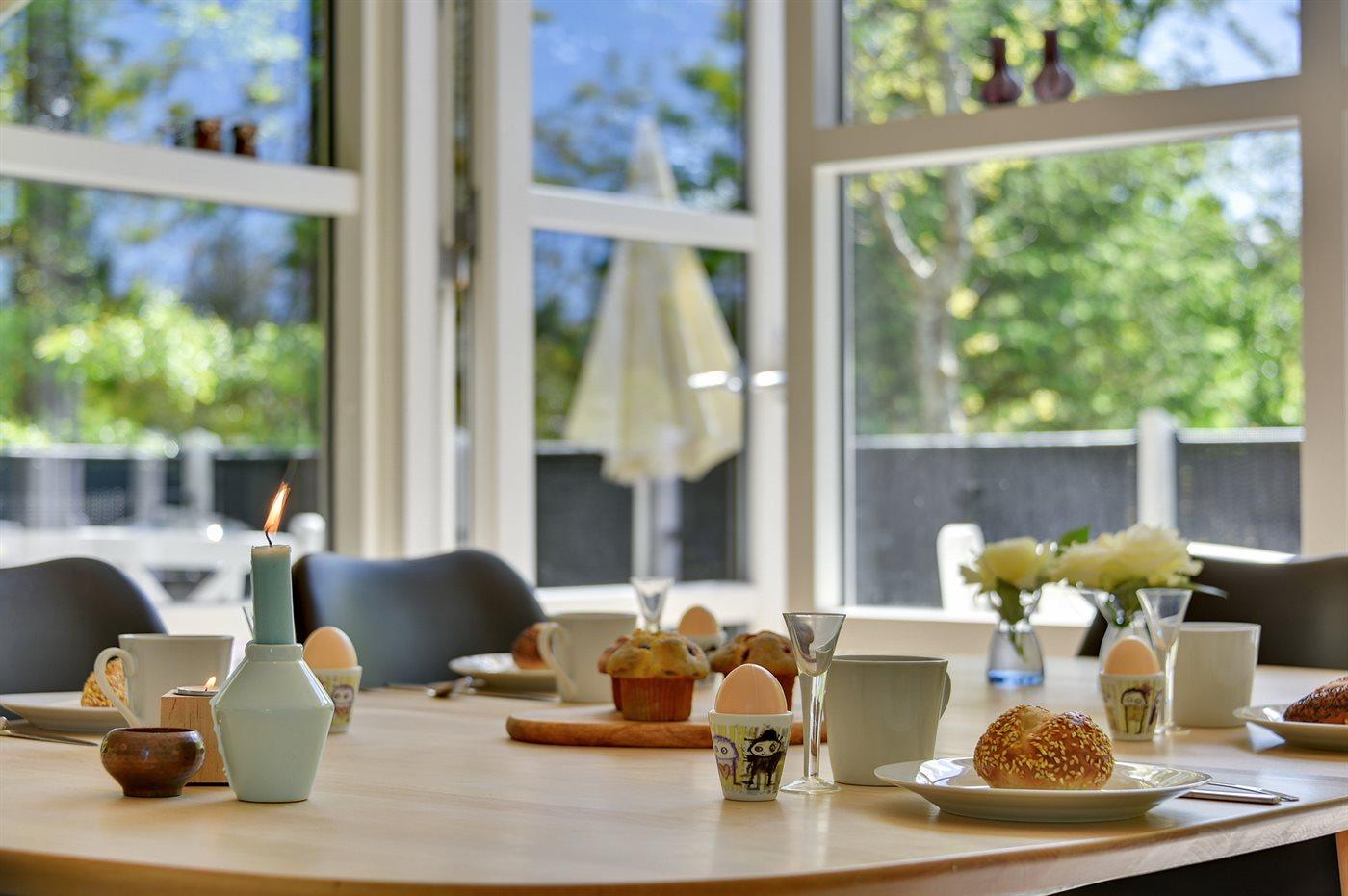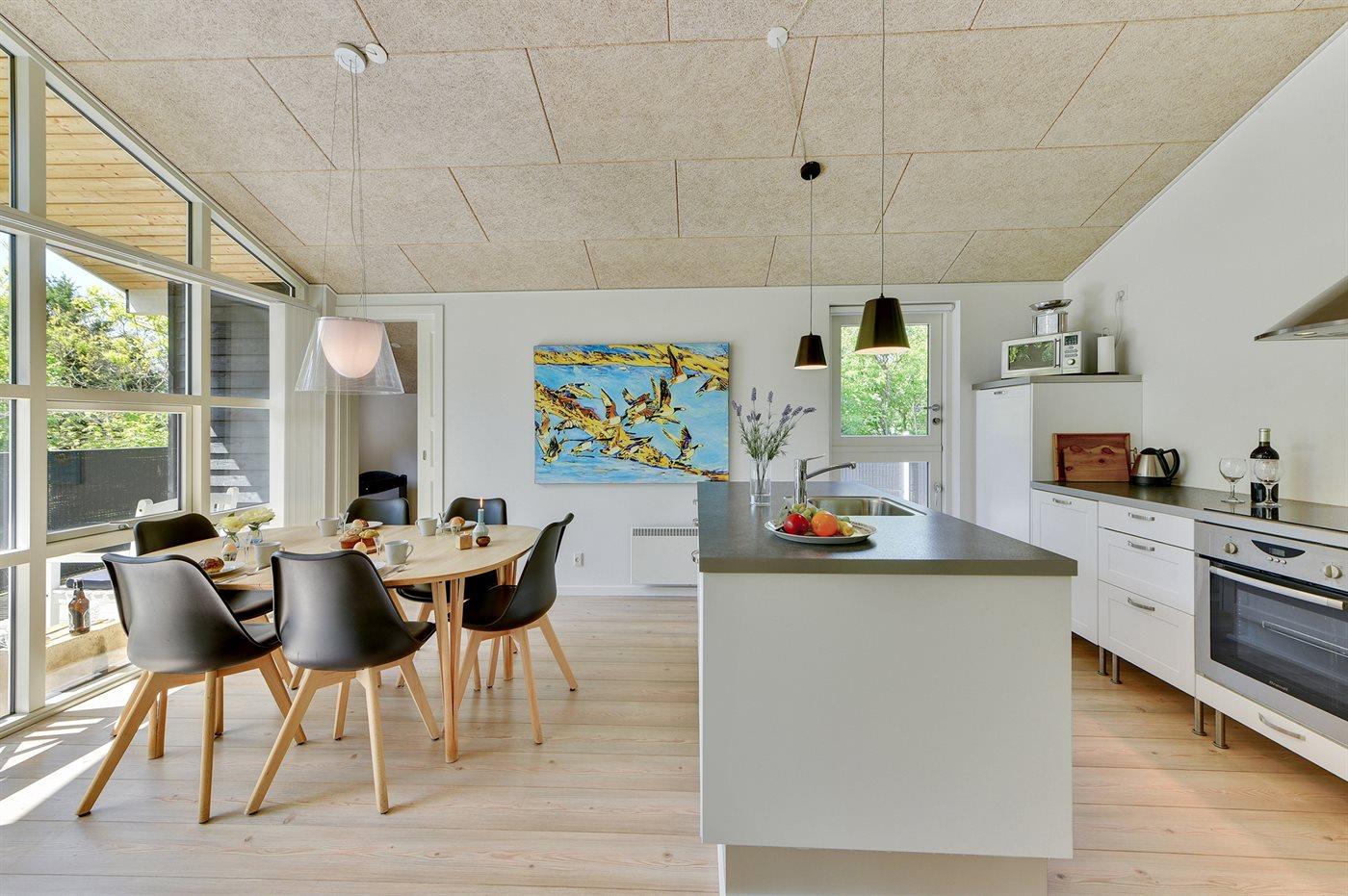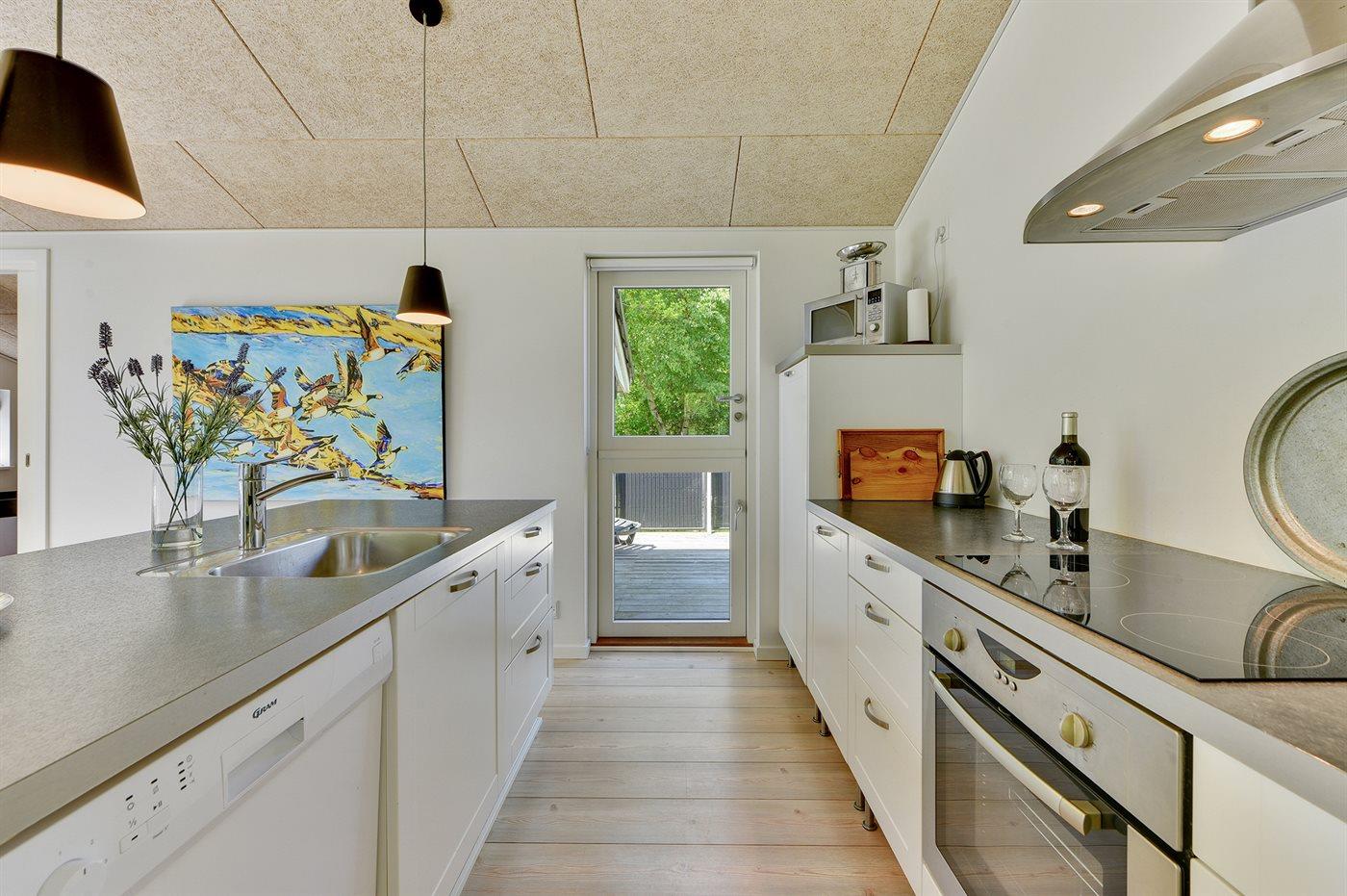 Køkkenet er udstyret med 1 køleskab. Der er 4 keramiske kogeplader, varmluftovn, mikrobølgeovn samt opvaskemaskine.