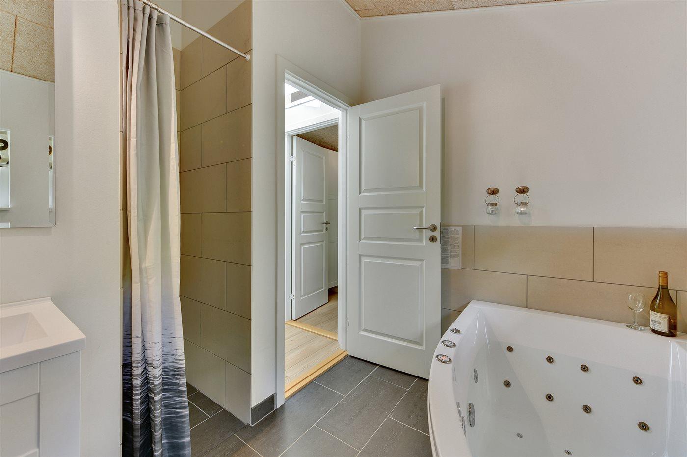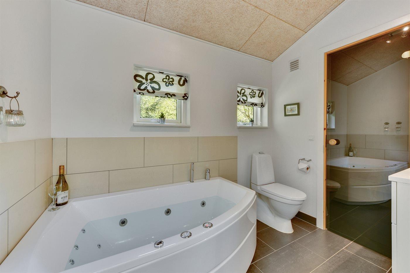 Der er 2 badeværelser med bruseniche og 2 toiletter. Der er gulvvarme på 2 badeværelser. I saunaen er der mulighed for afslapning.