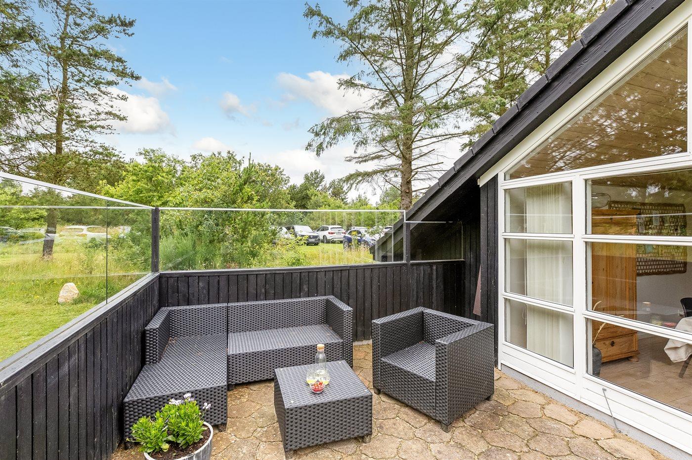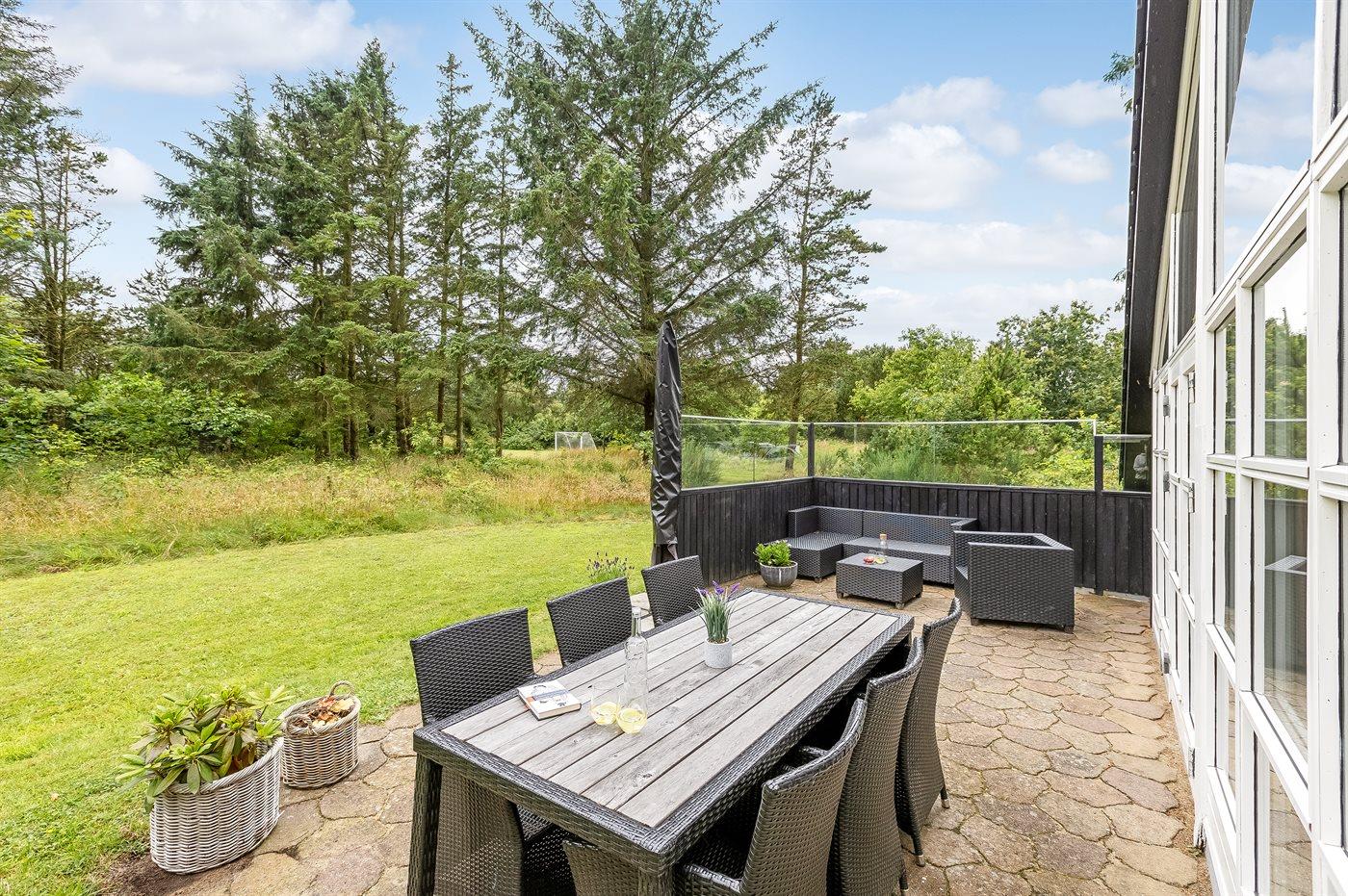 Ferieboligen er beliggende på en 2300 m² stor naturgrund. Der er 2000 m til havet. Der er 2000 m til fjorden. Nærmeste forretning er beliggende i en afstand af 1800 m. Der er en golfbane i en afstand af 1800 m. Til ferieboligen hører 25 m² terrasseareal. Der er redskabsrum. Sandkasse. Parkering ved ferieboligen.