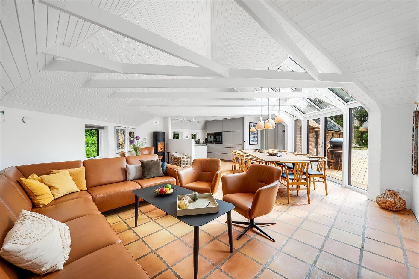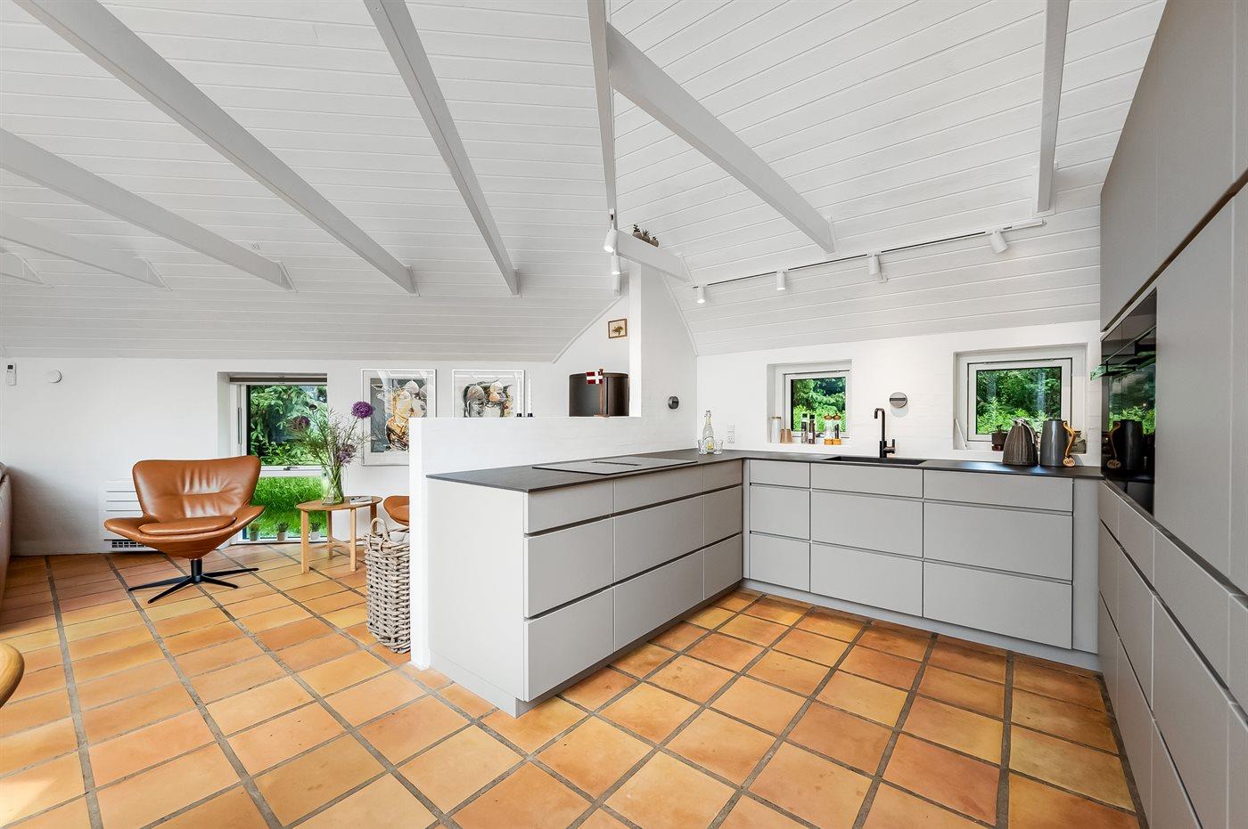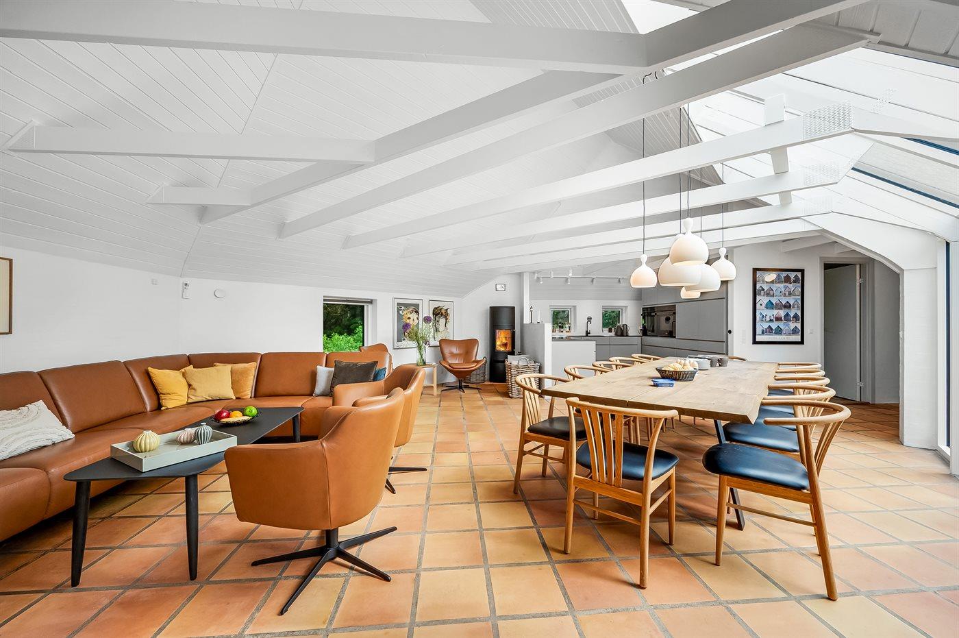 STUEN er en stor, kombineret opholds-, spise- og køkkenafdeling. Lys og behagelig takket være de store sydvestvendte tagvinduer, der kan solafskærmes. Køkkenet er veludstyret med bl.a. 2 indbygningsovne, mikrobølgeovn, induktionskomfur, opvaskemaskine og stort køleskab. Stuen er smagfuldt indrettet med kvalitetsmøbler, brændeovn og en imponerende 65" smart-TV med cromecast.