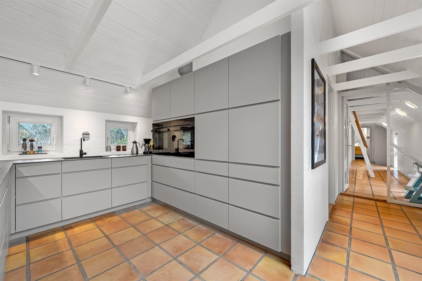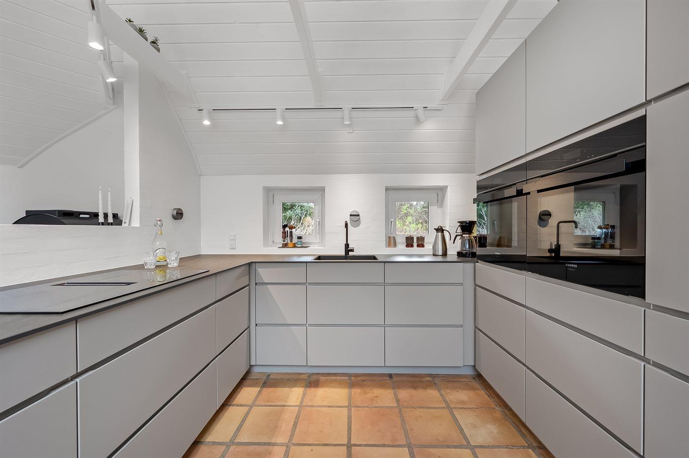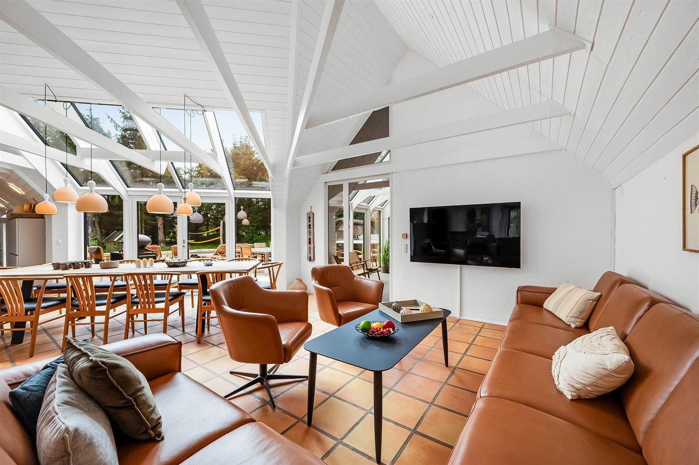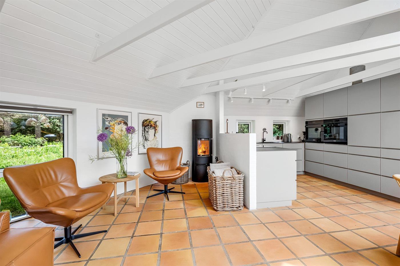 STUEN er en stor, kombineret opholds-, spise- og køkkenafdeling. Lys og behagelig takket være de store sydvestvendte tagvinduer, der kan solafskærmes. Køkkenet er veludstyret med bl.a. 2 indbygningsovne, mikrobølgeovn, induktionskomfur, opvaskemaskine og stort køleskab. Stuen er smagfuldt indrettet med kvalitetsmøbler, brændeovn og en imponerende 65" smart-TV med cromecast.