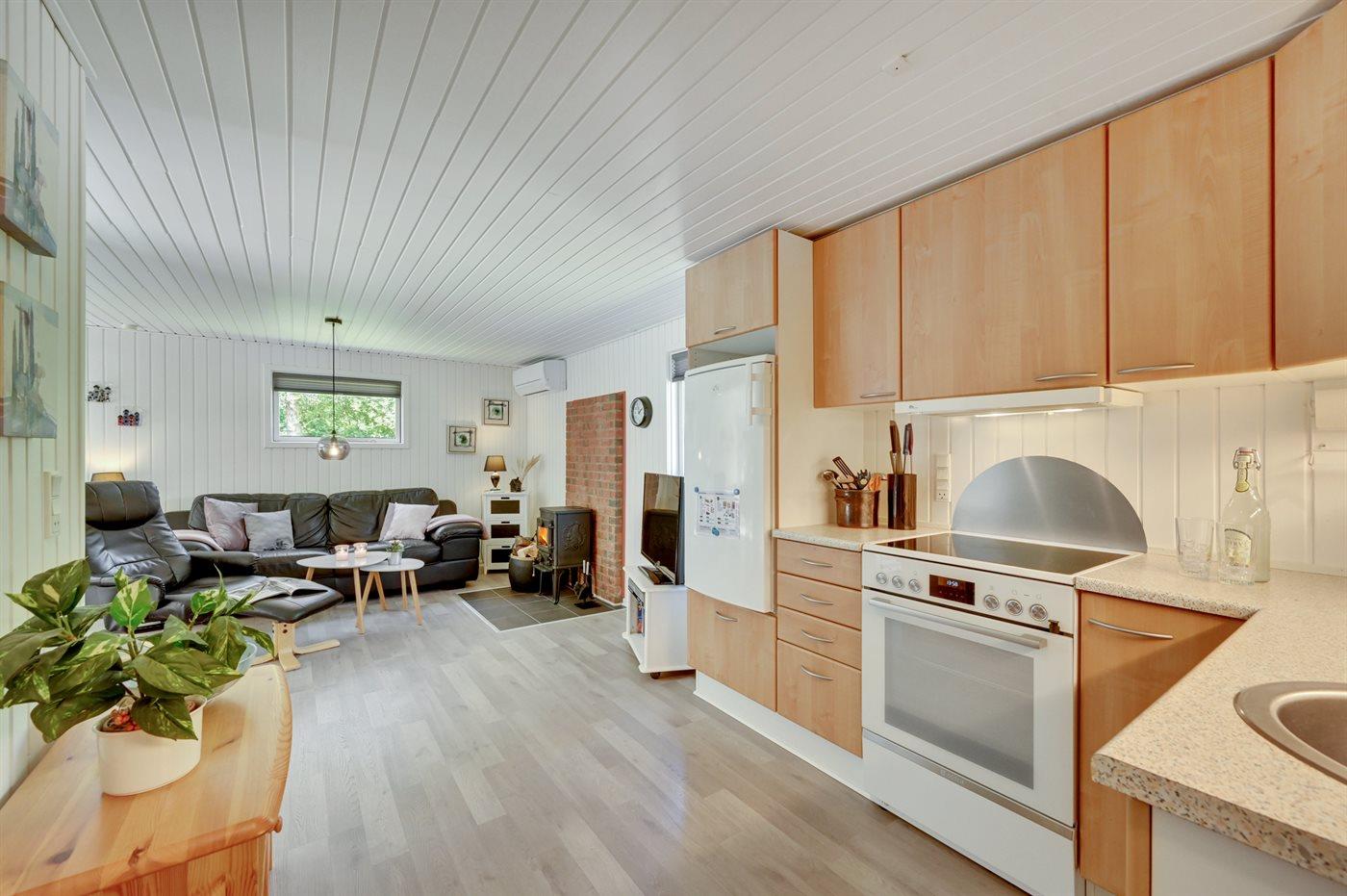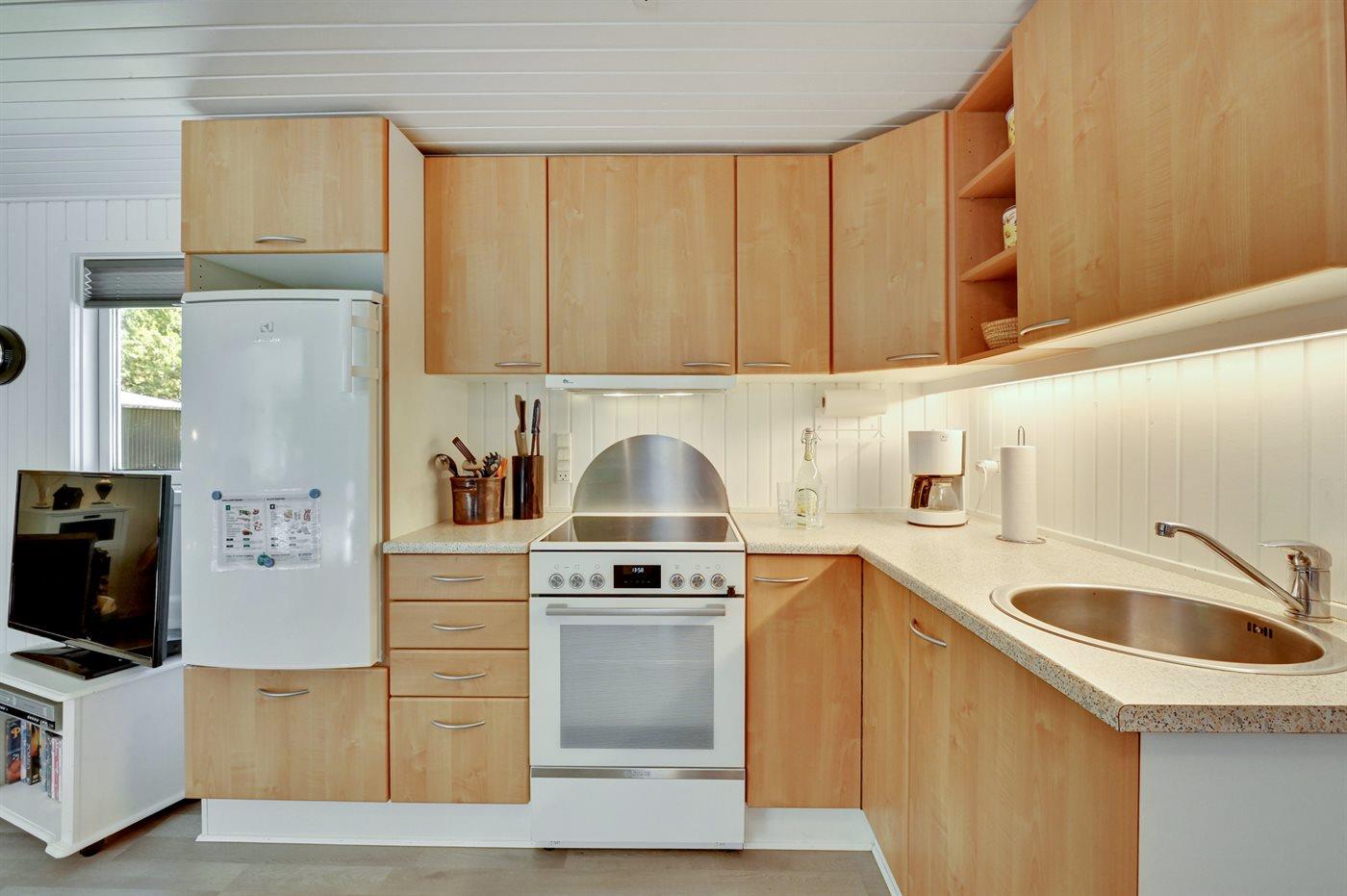 Køkkenet er udstyret med 1 køleskab. Der er 4 keramiske kogeplader, varmluftovn, mikrobølgeovn.