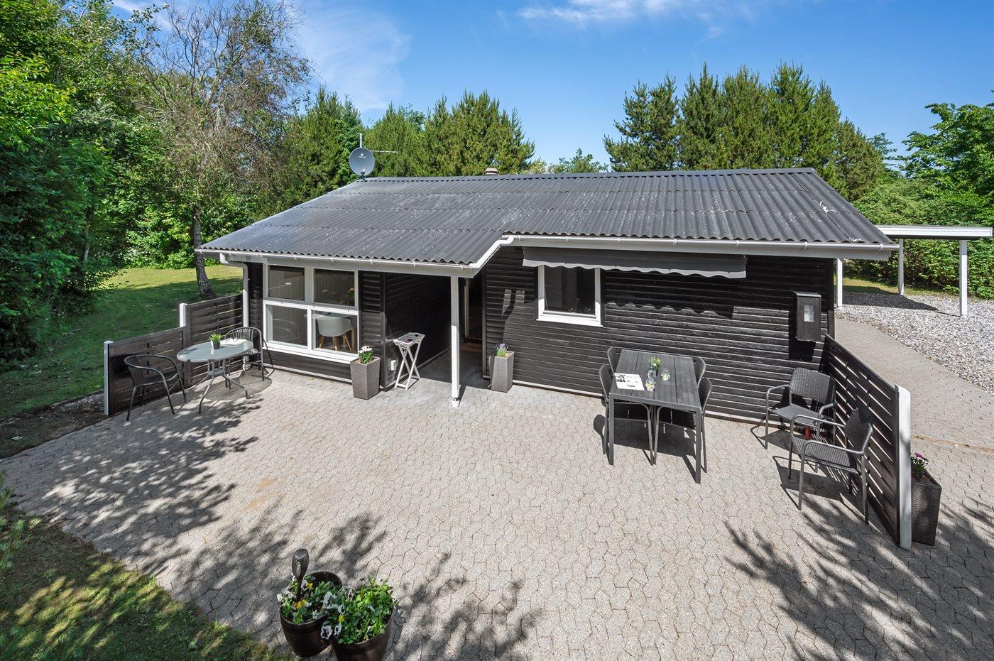 Ferieboligen er beliggende på en 2300 m² stor havegrund. Der er 1600 m til havet. Nærmeste forretning er beliggende i en afstand af 1400 m. Der er en golfbane i en afstand af 600 m. Til ferieboligen hører 40 m² terrasseareal. Fodboldmål. Udendørs sauna. Der er carport til rådighed. Parkering ved ferieboligen.