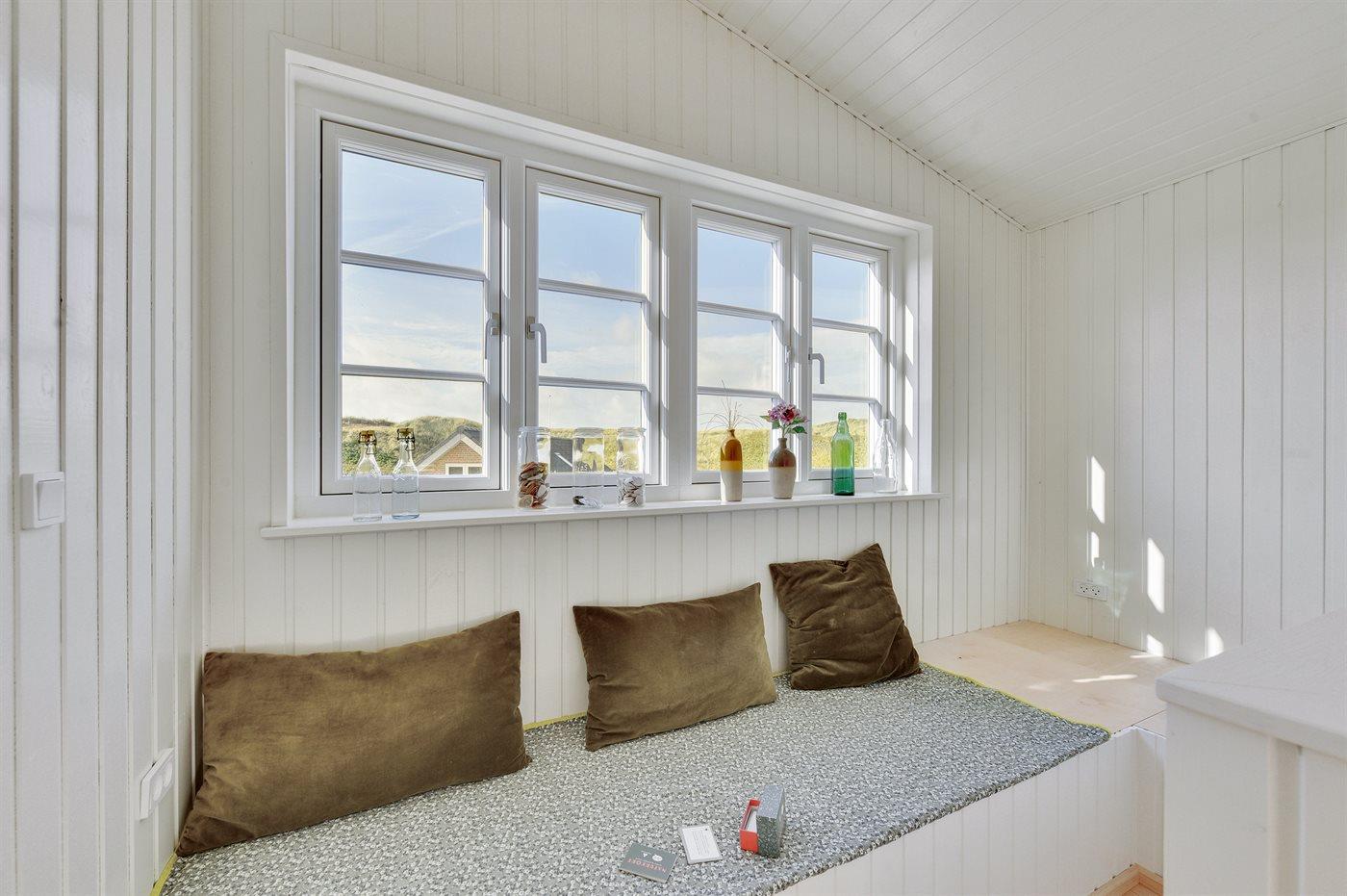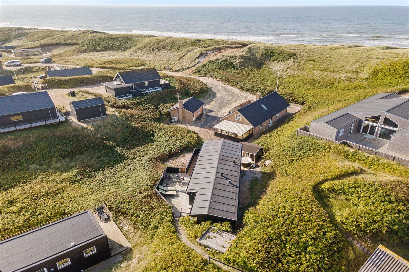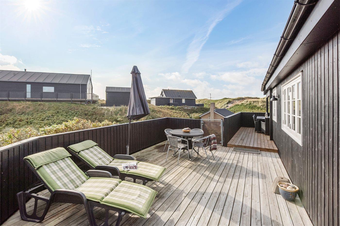 Midt i Søndervig ligger dette dejlige sommerhus - bygget ind i klitlandskabet på en forhøjning, hvilket sikrer en flot udsigt fra husets terrasse og vinduer. Husets arkitektur er nøje tilpasset det omkringliggende landskab. Fra terrassen, som omgiver huset, er der, takket være den høje beliggenhed, en flot udsigt over det bølgende klitlandskab. På terrassen, hvor der findes et dejligt vildmarksbad til 6 personer, kan I nyde en god bog i skyggen, en kold forfriskning, mens børnene leger eller bare sidde på terrassen og nyde solen og det hyggelige samvær.