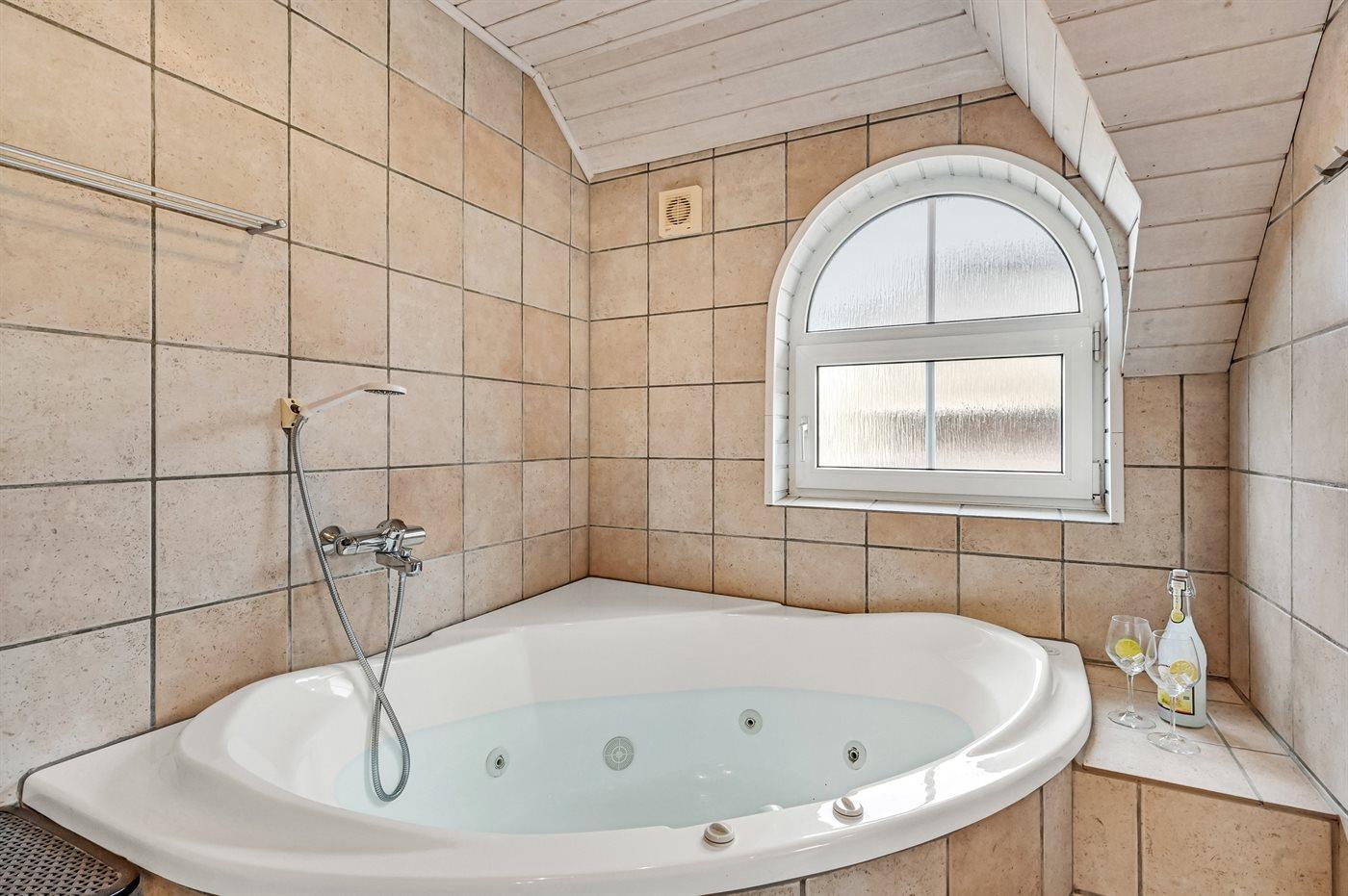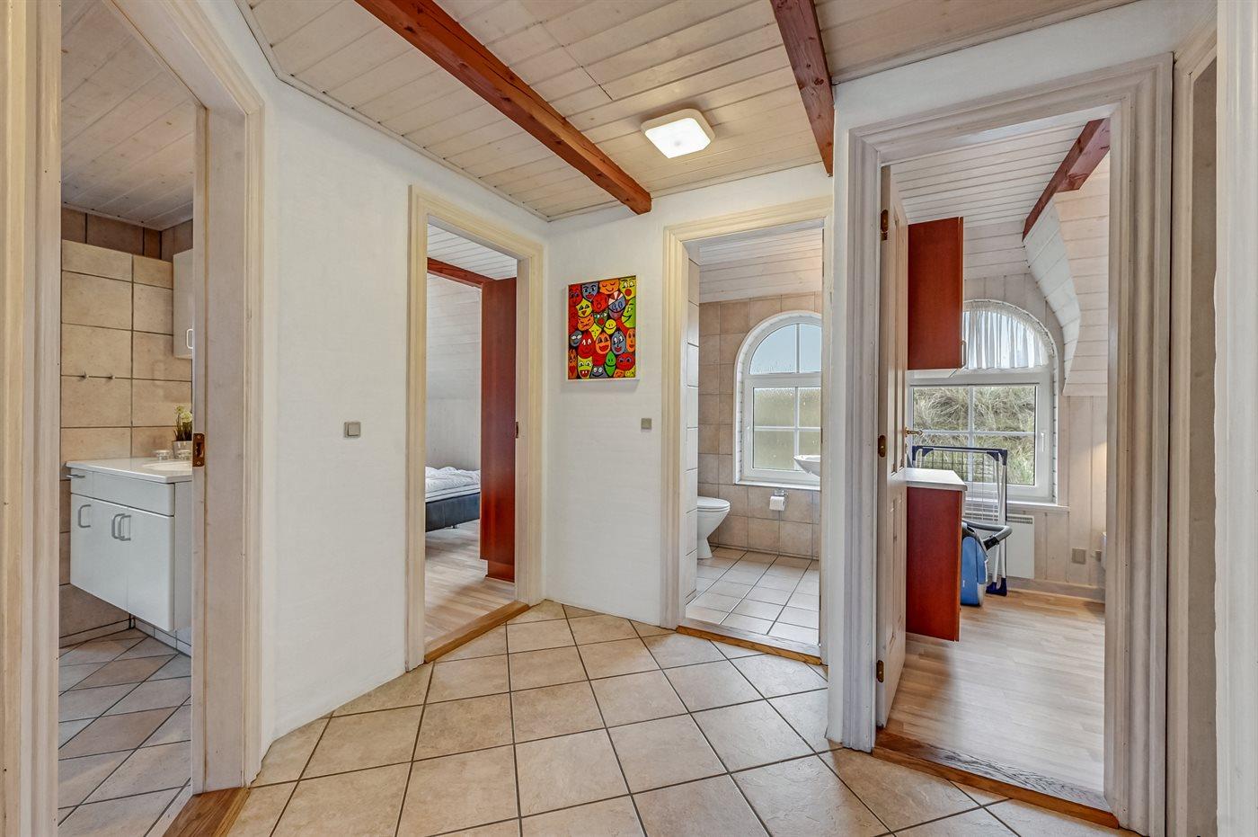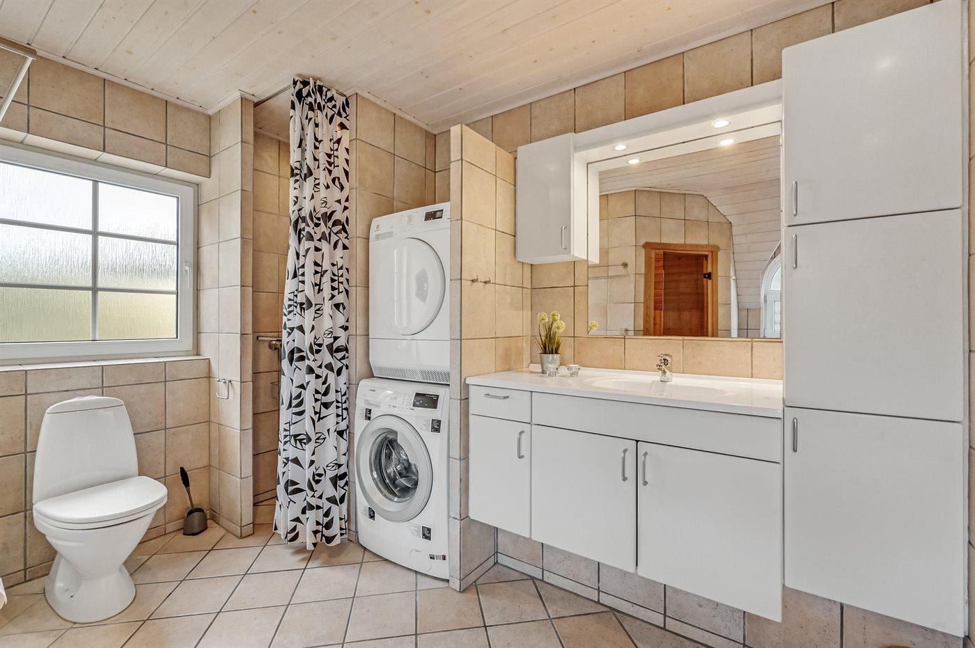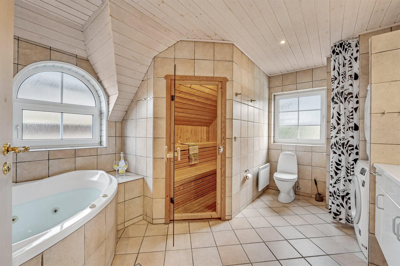 Der er 2 badeværelser med bruseniche og 2 toiletter. Der er gulvvarme på 2 badeværelser.. Badekar. I saunaen er der mulighed for afslapning.