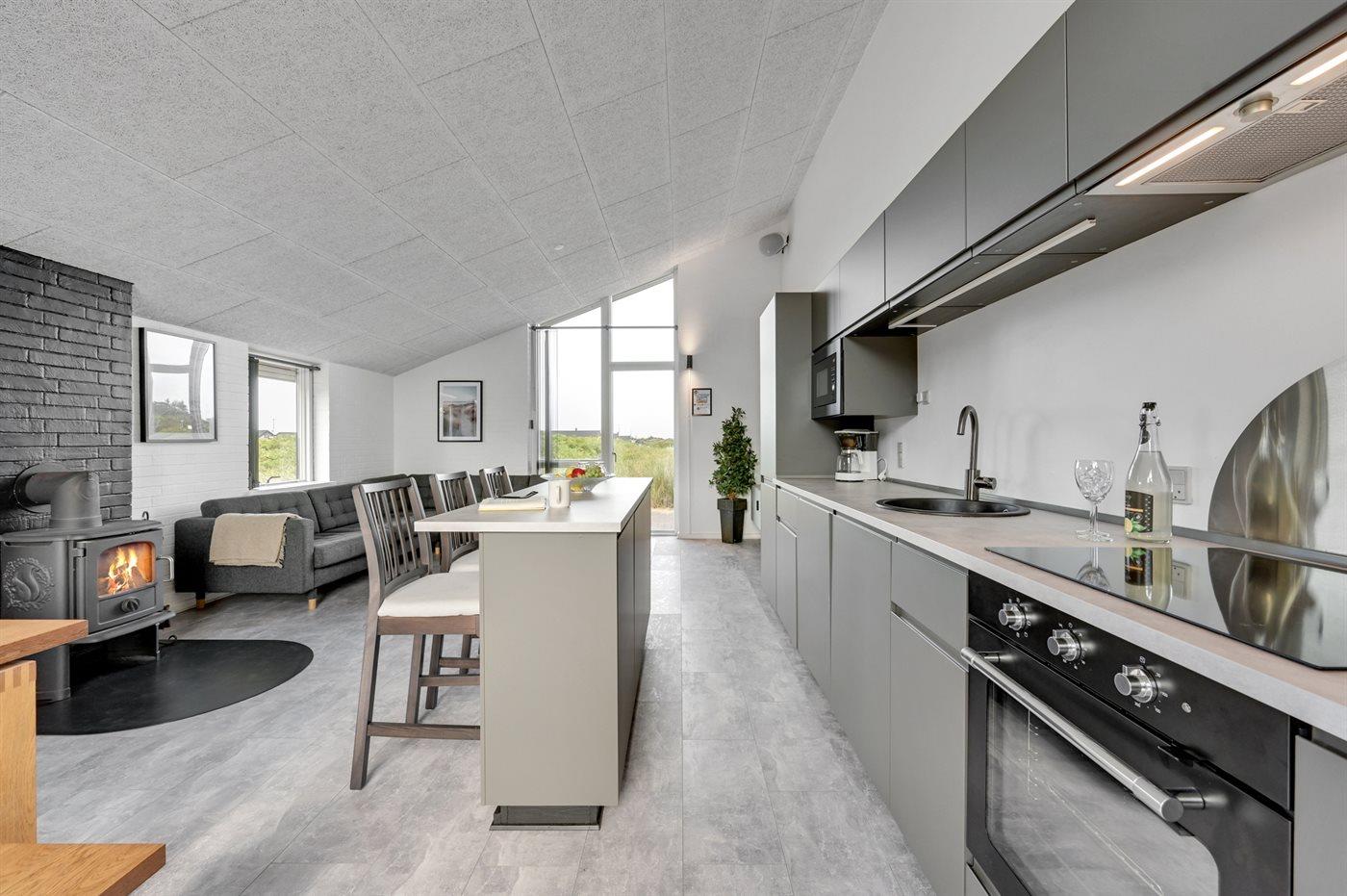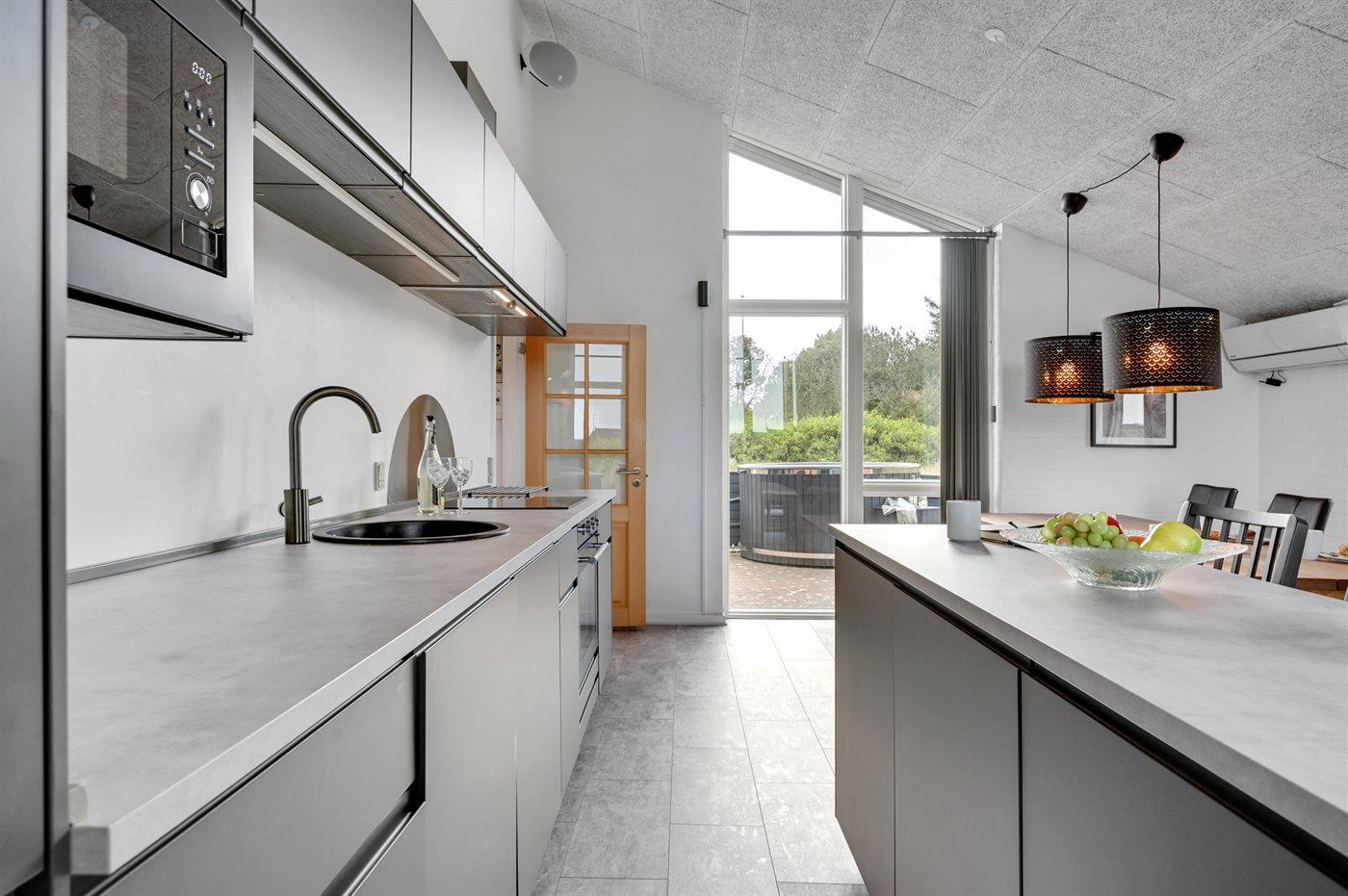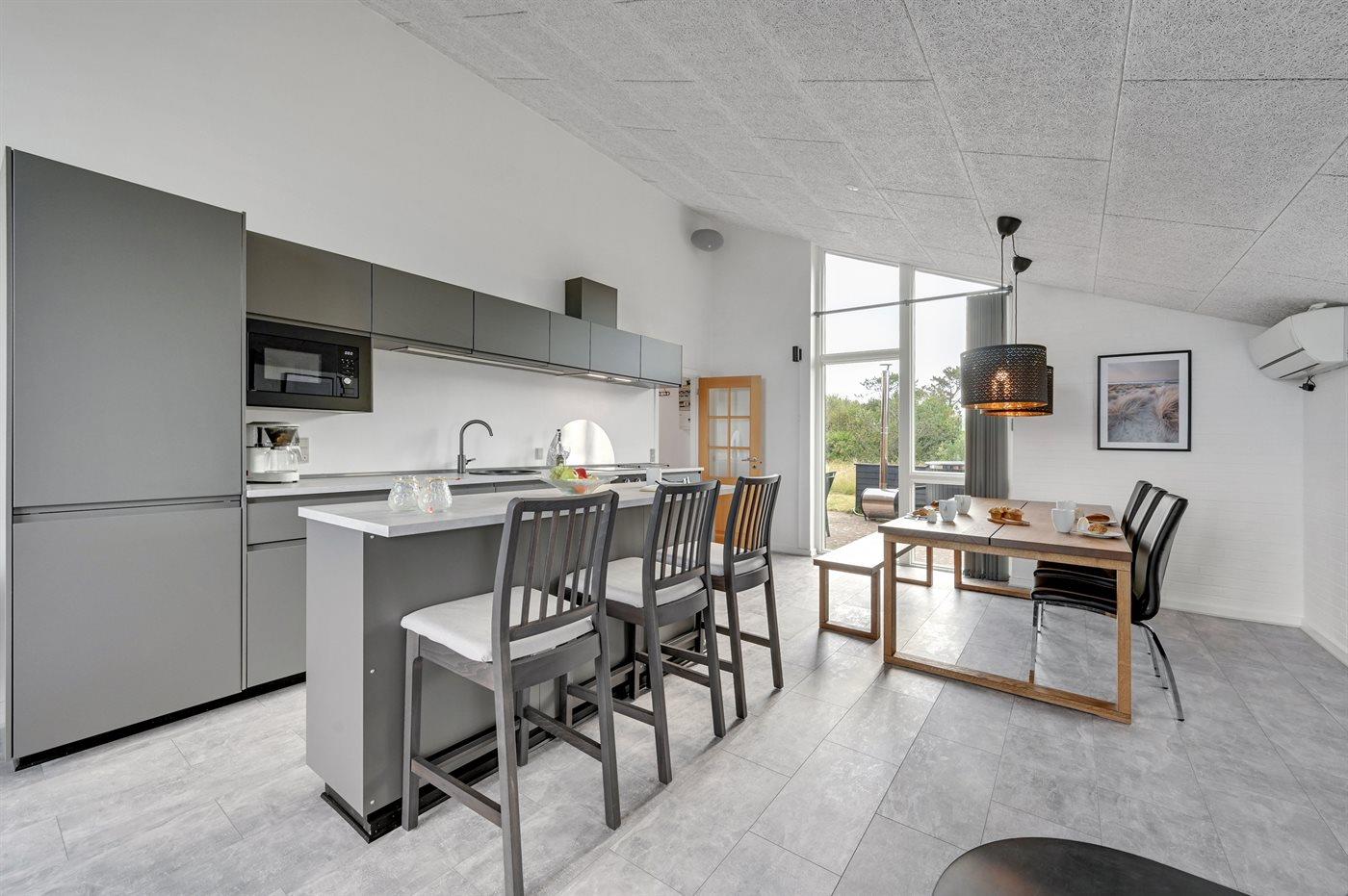 Køkkenet er udstyret med 1 køleskab. Der er 4 induktionskogeplader, varmluftovn, mikrobølgeovn samt opvaskemaskine.