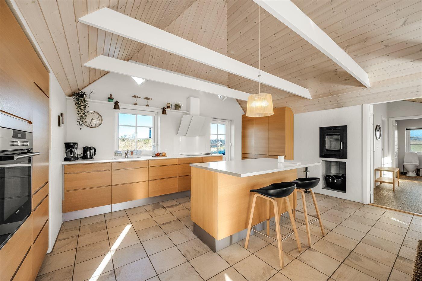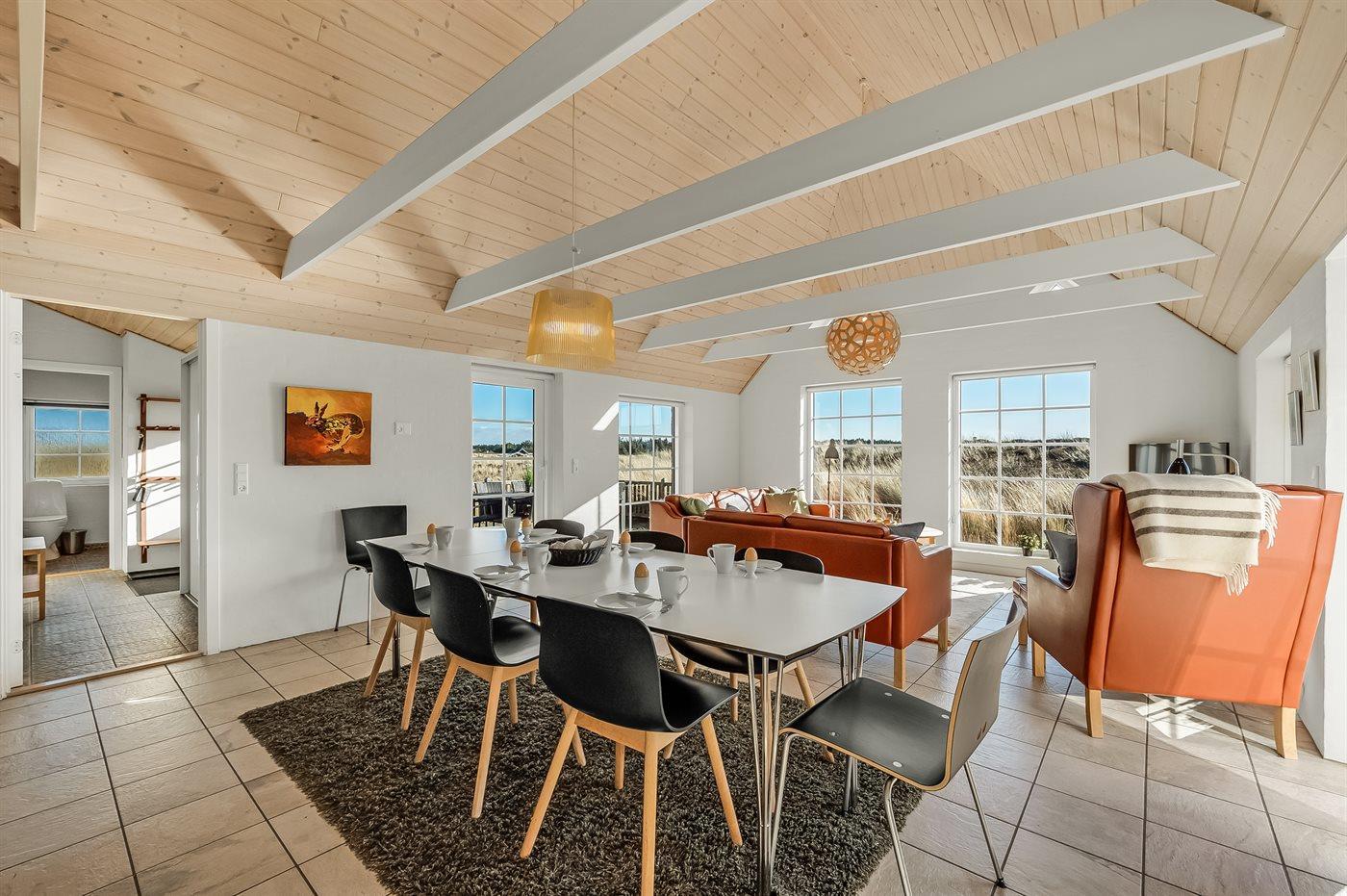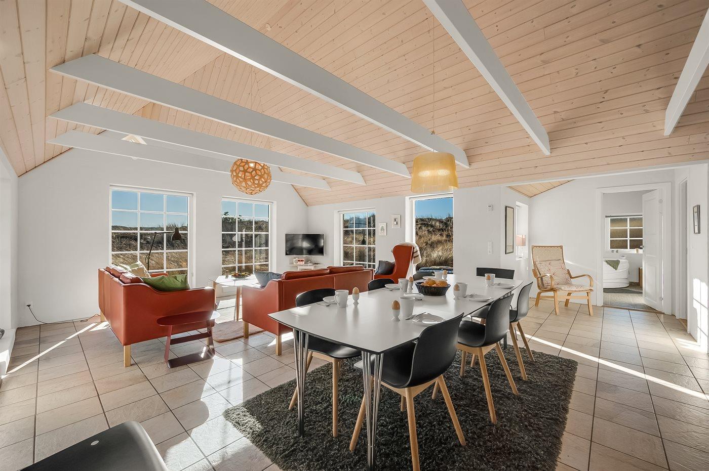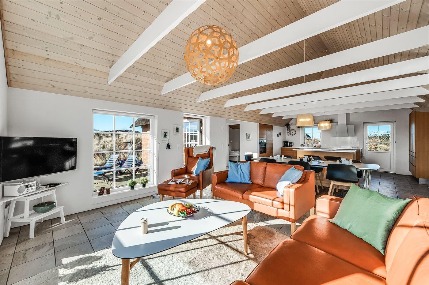 Fantastisk stråtækt sommerhus med en dejlig beliggenhed på en meget stor grund i naturskønne omgivelser. Huset ligger på en lukket vej mellem hav og fjord - nær havet og skøn badestrand samt Søndervig by. Indretningen i huset er smagfuld og med masser af plads til hygge og samvær.