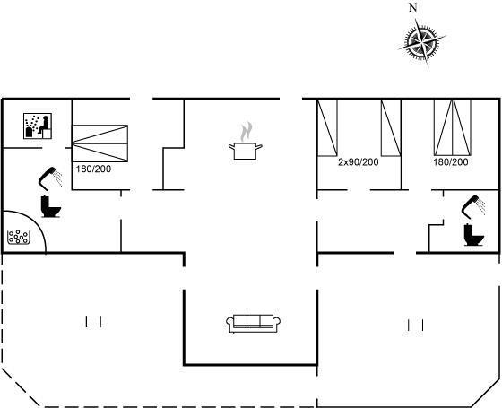 Der er i alt 3 soveværelser. Sovepladserne fordeler sig på: 4 sovepladser i dobbeltsenge. 2 sovepladser i enkeltsenge.