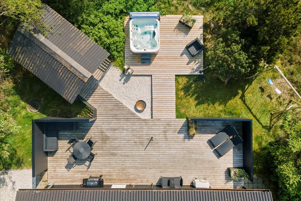 Sommerhusets udestue er en hyggelig opholdsplads, men når vejret er godt, er der nu ikke noget, der overgår det store terrassemiljø. Det er nemlig en skøn oase med flere gode lækroge, kvalitetshavemøbler og grøn beplantning, der skærmer af og sørger for privatliv. Der er gynger til børnene lige ved siden af, og som en perfekt tilføjelse er terrassen udstyret med et spabad, en sauna og en udendørs bruser – kort sagt alt hvad I skal bruge, hvis I er i humør til wellness og komplet afslapning.