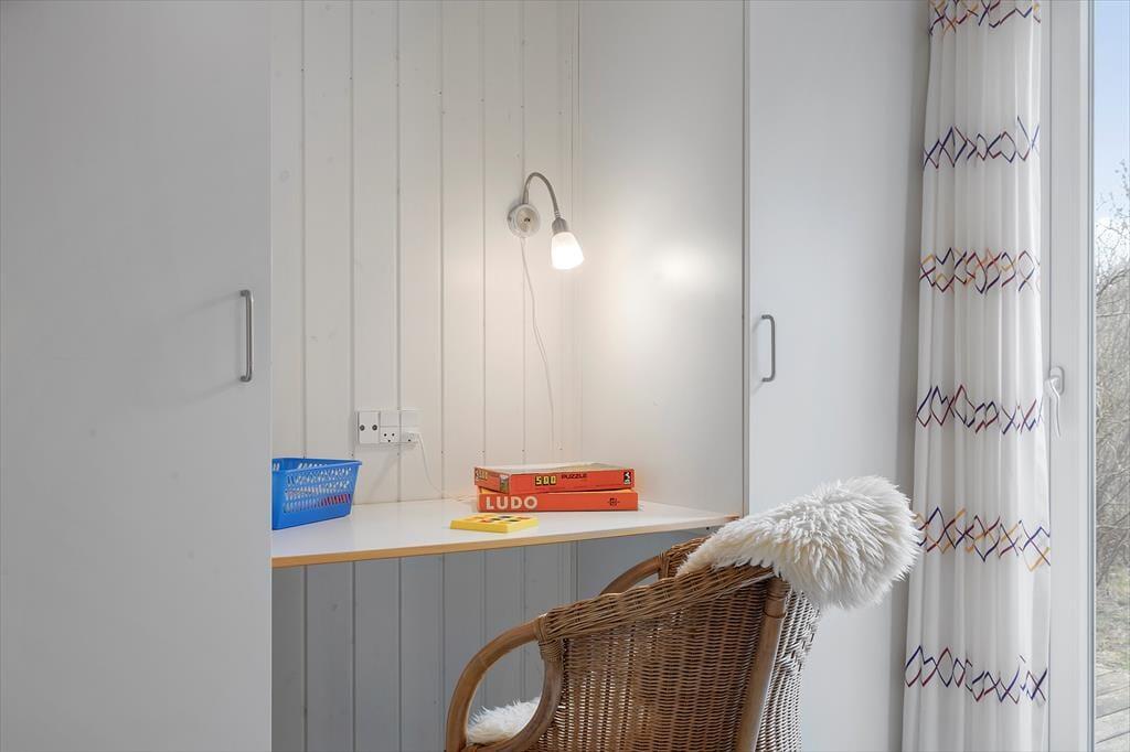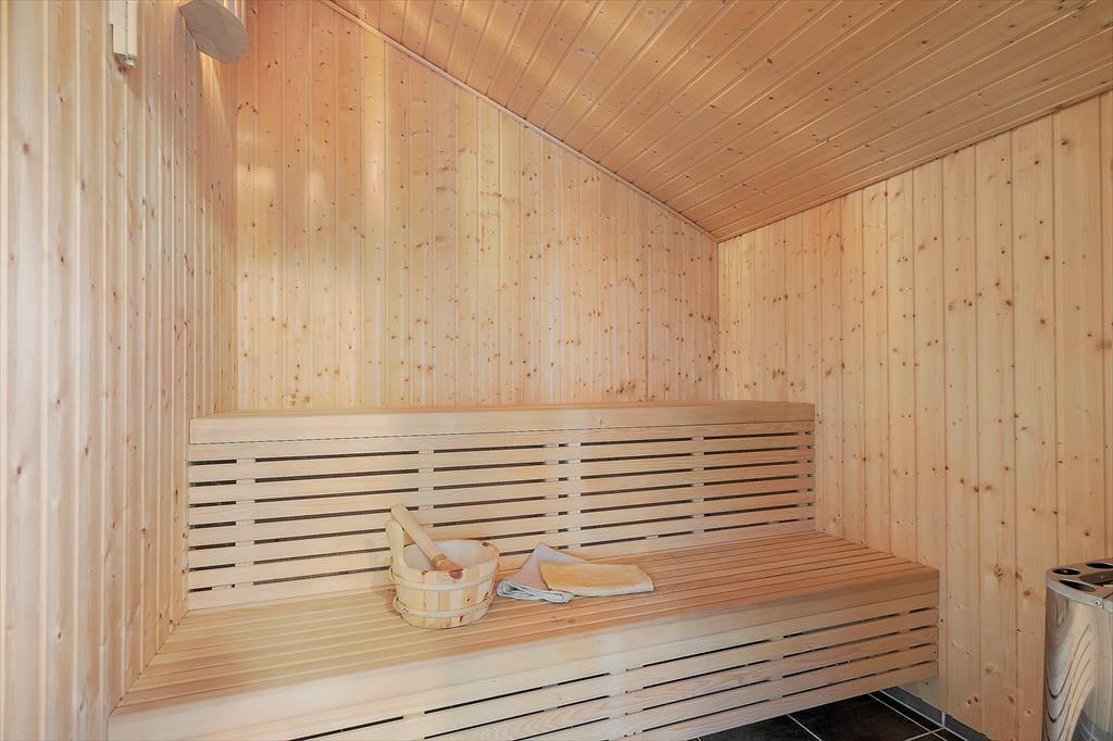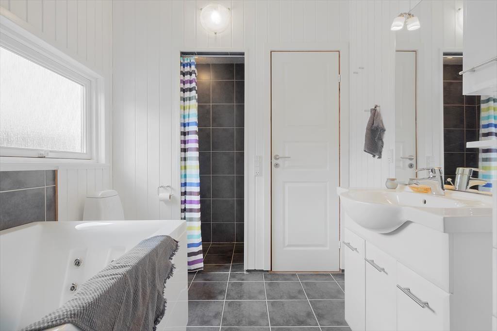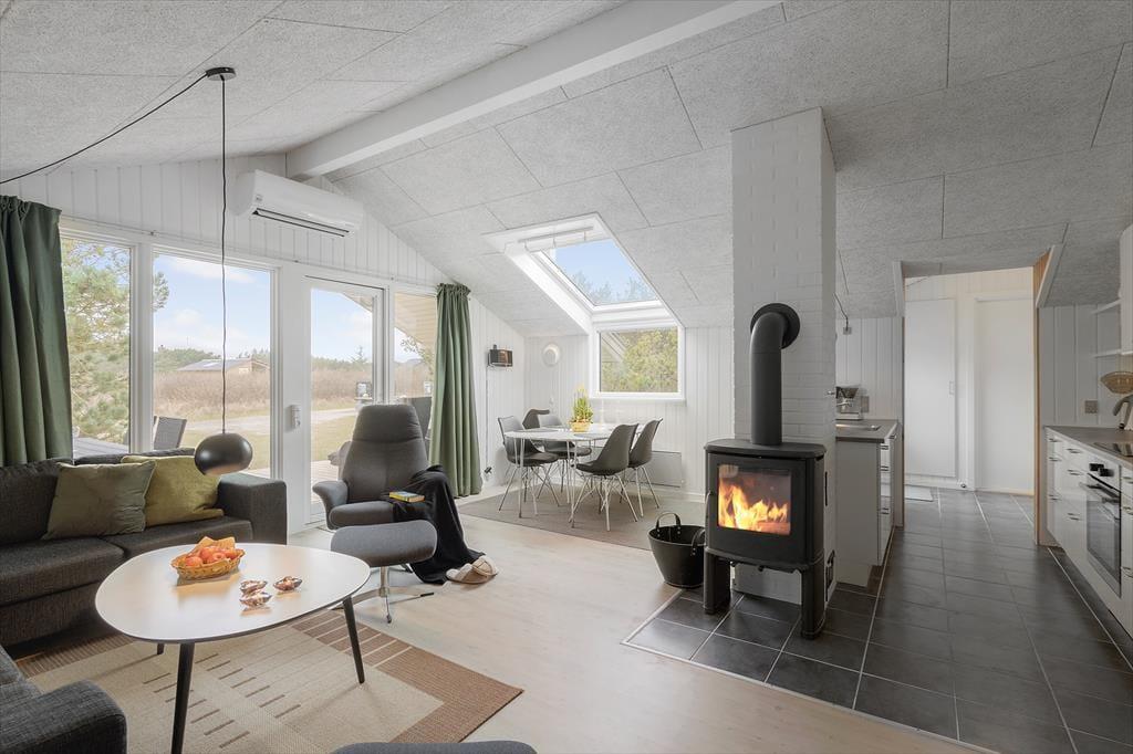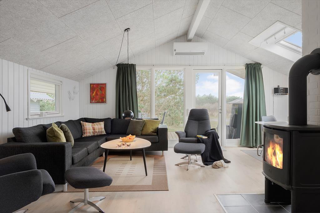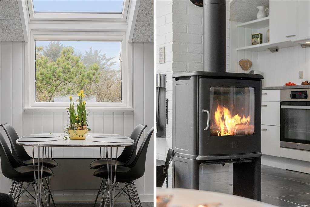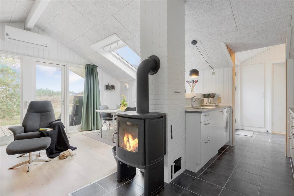 Skal I holde ferie med børn, vil sommerhuset give jer en skøn ramme om både leg og hyggestunder. Der er også tænkt på de praktiske detaljer, for i entréen er der vaskemaskine og en pusleplads til de alleryngste feriegæster, og så hører der både et gæstetoilet og et badeværelse med til planløsningen. Netop badeværelset fortjener et par ekstra ord med på vejen, for her bliver I forkælet med både spabad og sauna, så I kan afslutte feriedagen med tilbagelænet wellness. Alternativt kan I tænde op i stuens brændeovn, lave te eller kaffe i det åbne køkken og gøre klar til en rolig stund i hjørnesofaen.