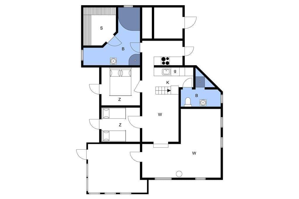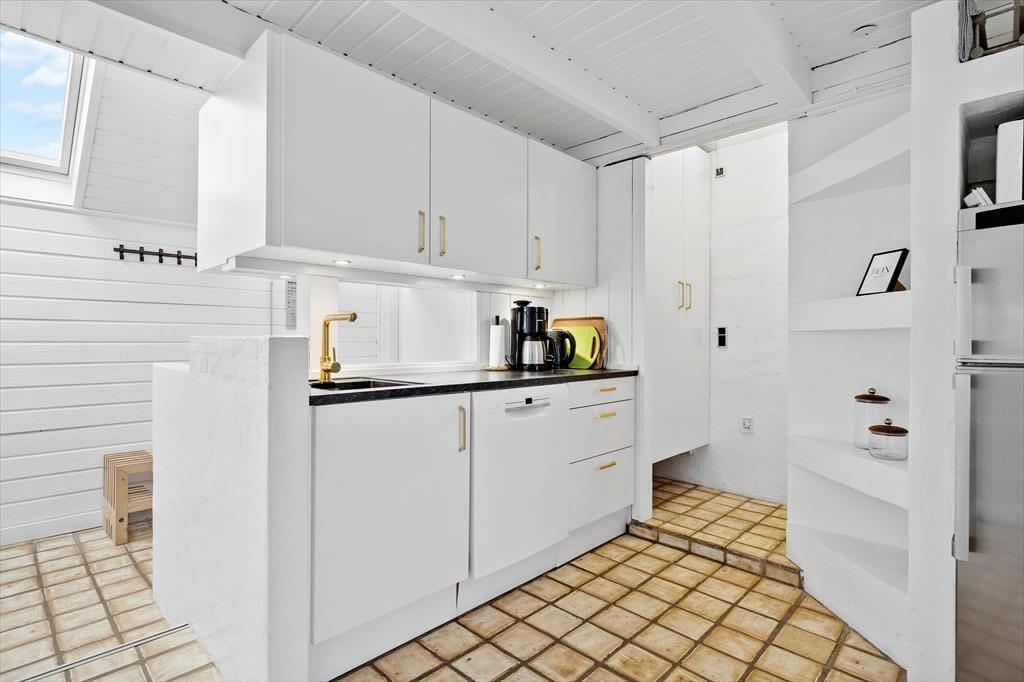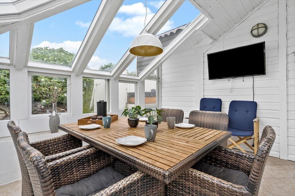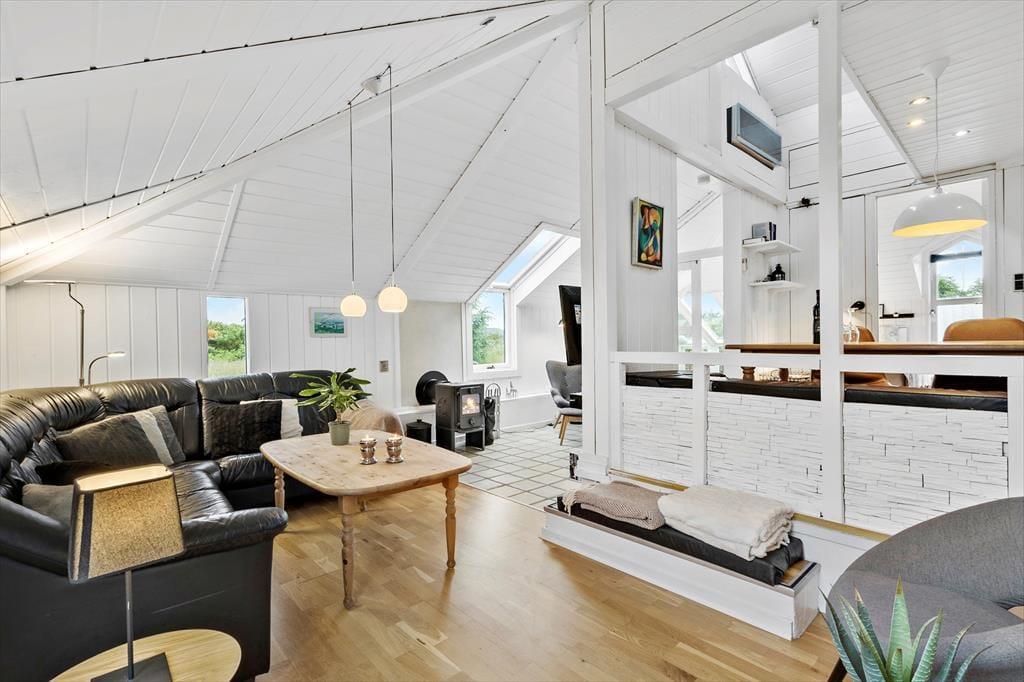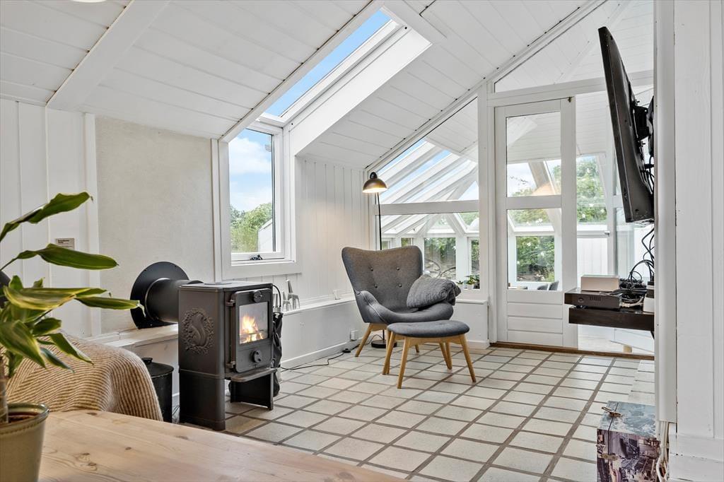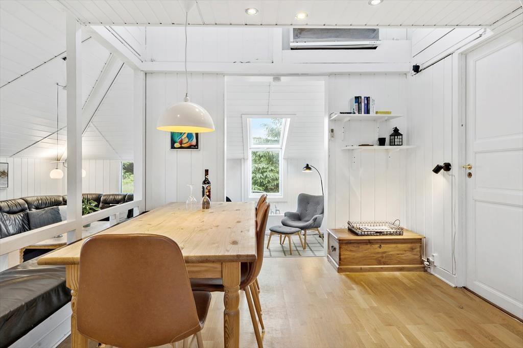 Det arkitekttegnede hus er senest renoveret i 2018, så de 115 m2 fremstår lyse og indbydende. Huset har en spændende grundplan i flere niveauer: Fra køkken-alrummet kan I kigge ned i den hyggelige stue, hvor en konvektionsbrændeovn sørger for, at varmen cirkulerer i rummet – med mindre det altså er vejr til at tage varmepumpens kølefunktion i brug. Fra stuen har I adgang til en rummelig udestue med store vinduespartier, der inviterer sollyset indenfor og skaber en god kontakt til den grønne naturgrund. Bliver I siddende herude, indtil månen og stjernerne står frem på himlen, kan I sige godnat og trække jer tilbage på husets soverum. Der er to gode soveværelser og derudover ekstra senge på hemsen, så i alt har I plads til seks feriegæster. Planløsningen byder også på to badeværelser, hvoraf det største er udstyret med både spabad og sauna.