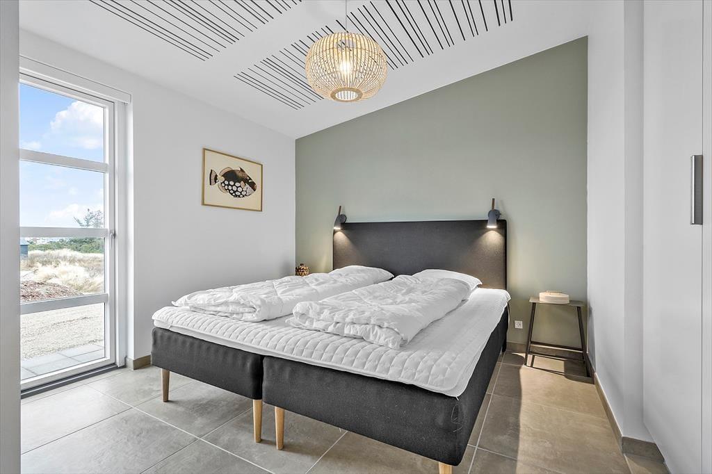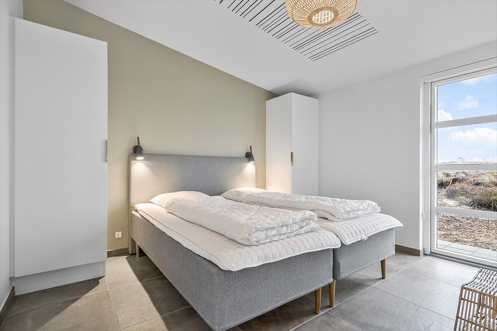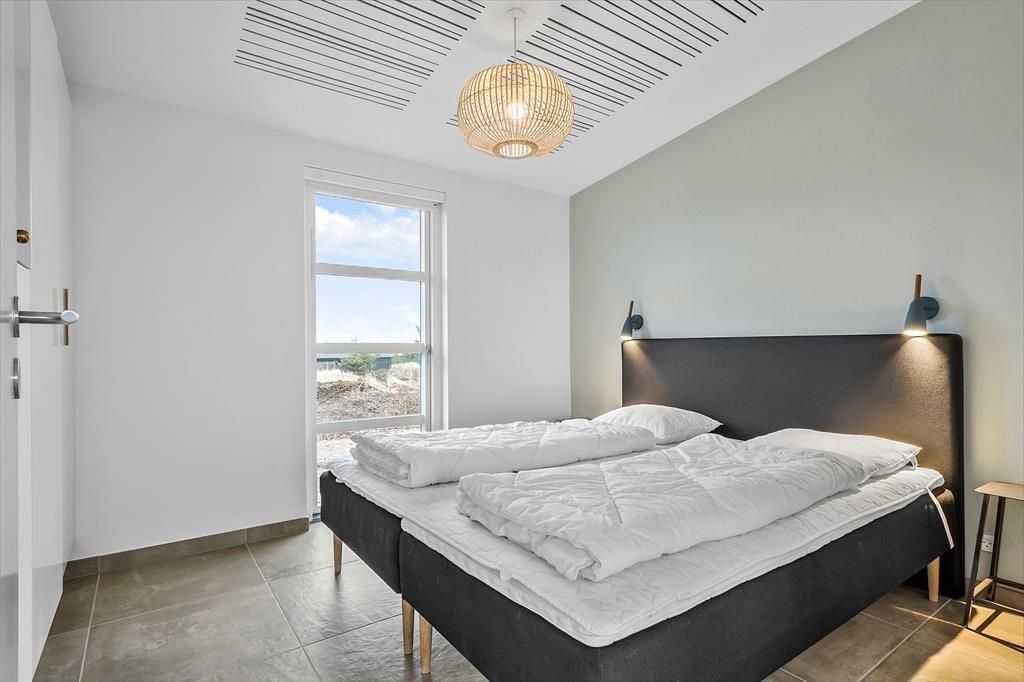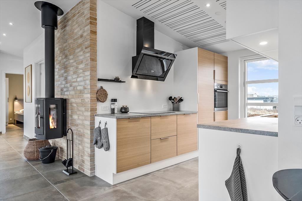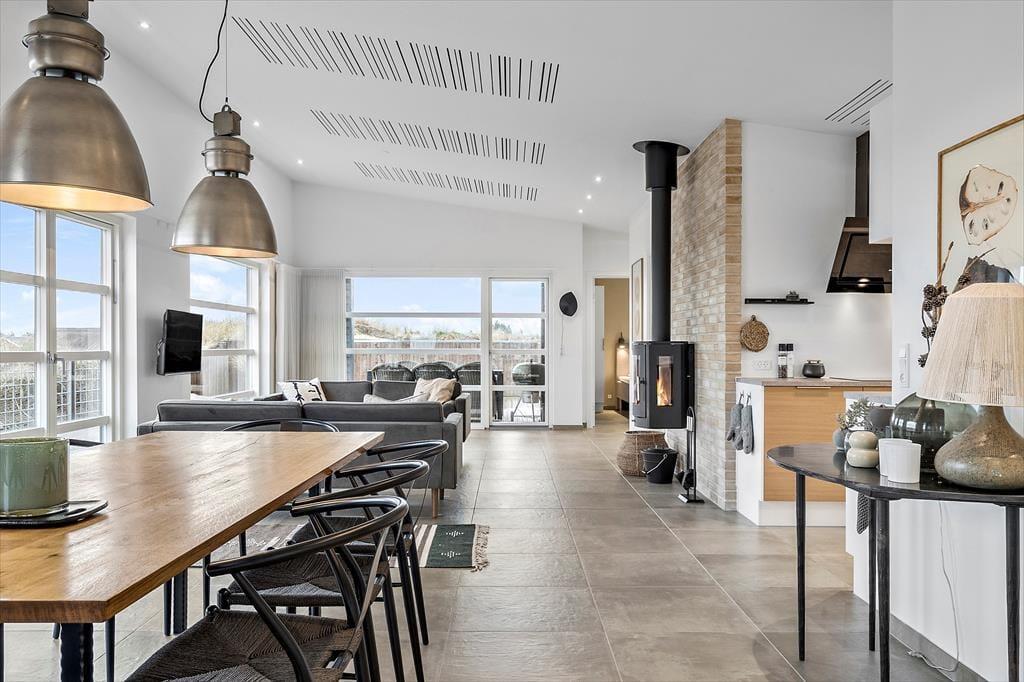 Der blev ikke sparet på noget, da huset blev opført i 2021. I får derfor hele 120 m2 at brede jer på, og hver eneste kvadratmeter er indrettet på gennemført vis – lige fra gulvvarmen under stuens brede gulvklinker til rummenes elegante akustiklofter. Sommerhusets tre soveværelser er alle indrettet med komfortable senge, garderobeskabe og dør ud til terrassen, og planløsningen byder derudover på to flotte badeværelser og en rummelig entré med vaskesøjle. Det allerbedste rum er nu stuen, der har det skønneste lysindfald takket være kæmpe vinduespartier mod øst, syd og vest. En brændeovn er monteret på væggen midt i rummet, så når I slapper af i sofaafdelingen, kan det foregå i skæret fra flammerne. I det moderne køkken kommer I ikke til at mange noget, og når vinen er åbnet og maden står klar, kan I glæde jer til at samles ved spisebordet til en lækker middag.