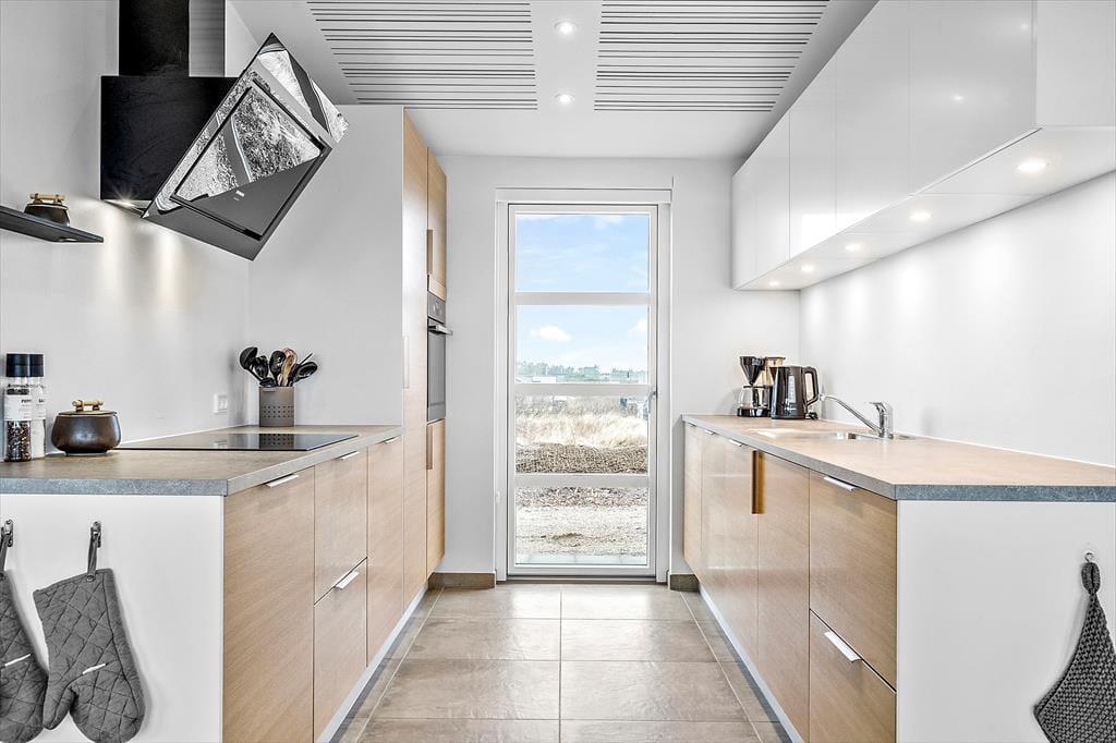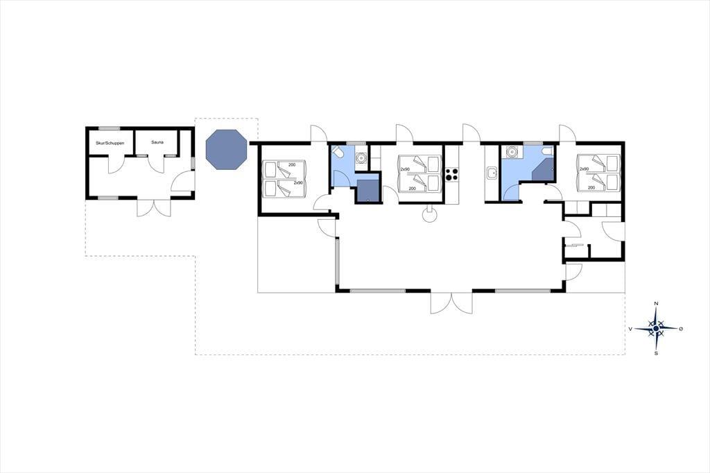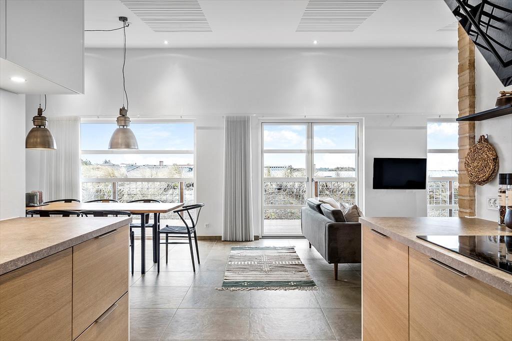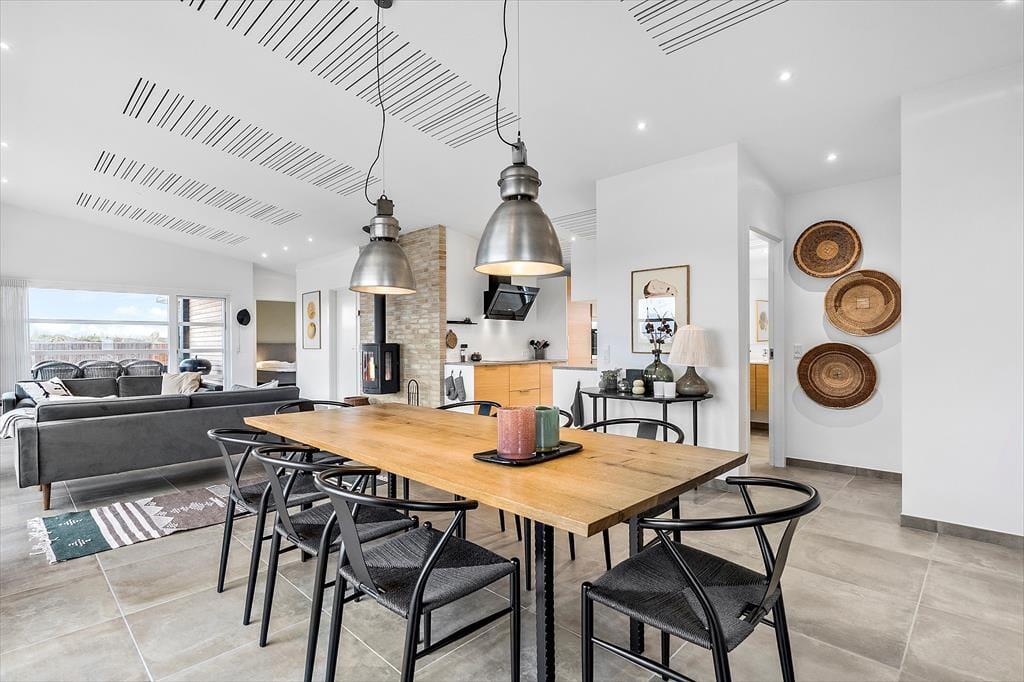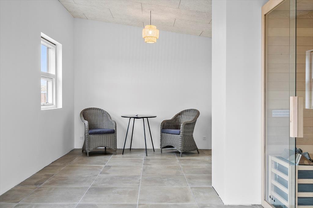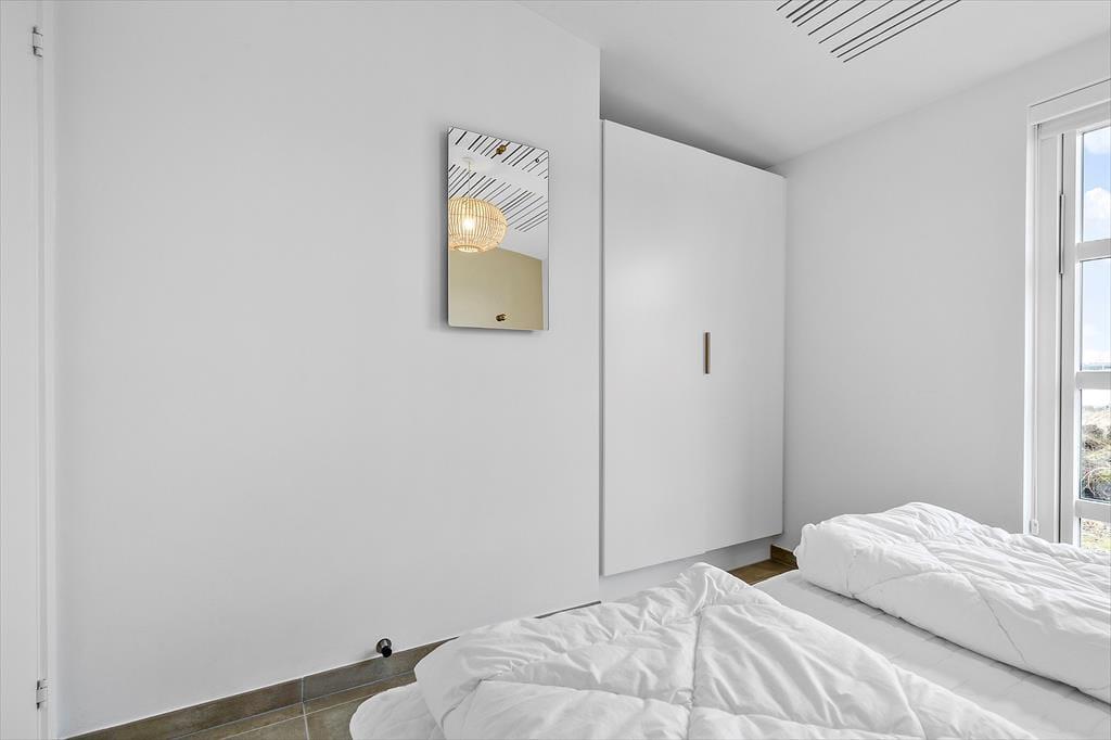 Der blev ikke sparet på noget, da huset blev opført i 2021. I får derfor hele 120 m2 at brede jer på, og hver eneste kvadratmeter er indrettet på gennemført vis – lige fra gulvvarmen under stuens brede gulvklinker til rummenes elegante akustiklofter. Sommerhusets tre soveværelser er alle indrettet med komfortable senge, garderobeskabe og dør ud til terrassen, og planløsningen byder derudover på to flotte badeværelser og en rummelig entré med vaskesøjle. Det allerbedste rum er nu stuen, der har det skønneste lysindfald takket være kæmpe vinduespartier mod øst, syd og vest. En brændeovn er monteret på væggen midt i rummet, så når I slapper af i sofaafdelingen, kan det foregå i skæret fra flammerne. I det moderne køkken kommer I ikke til at mange noget, og når vinen er åbnet og maden står klar, kan I glæde jer til at samles ved spisebordet til en lækker middag.