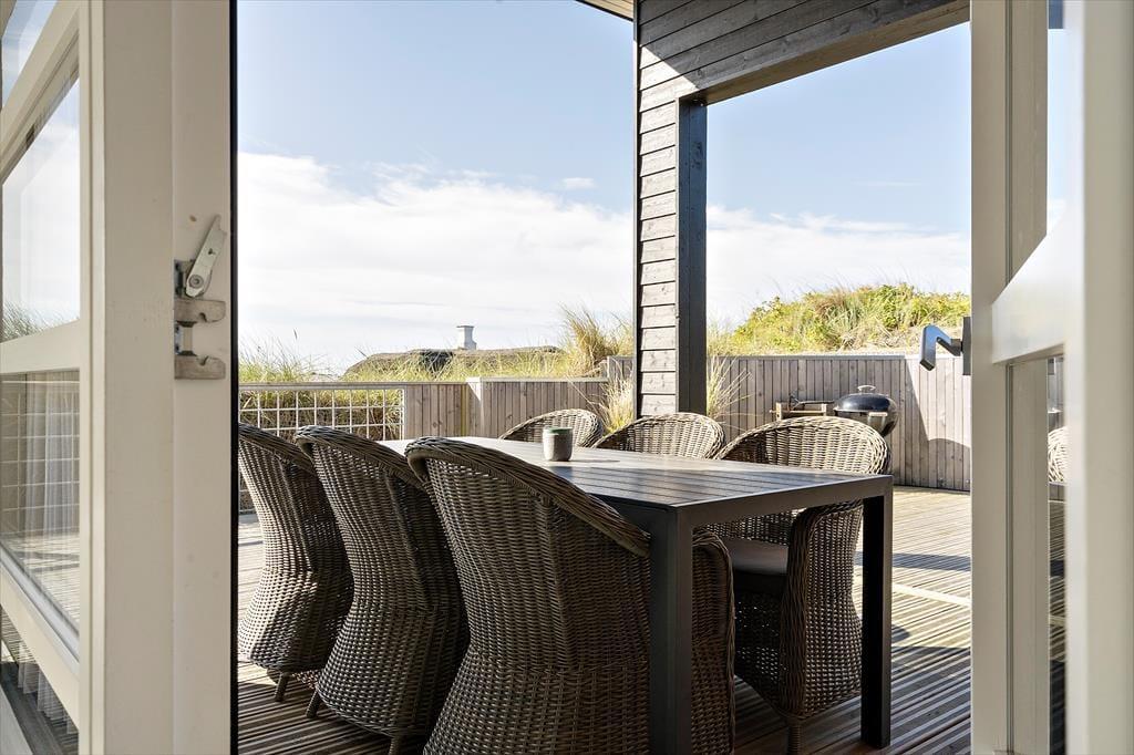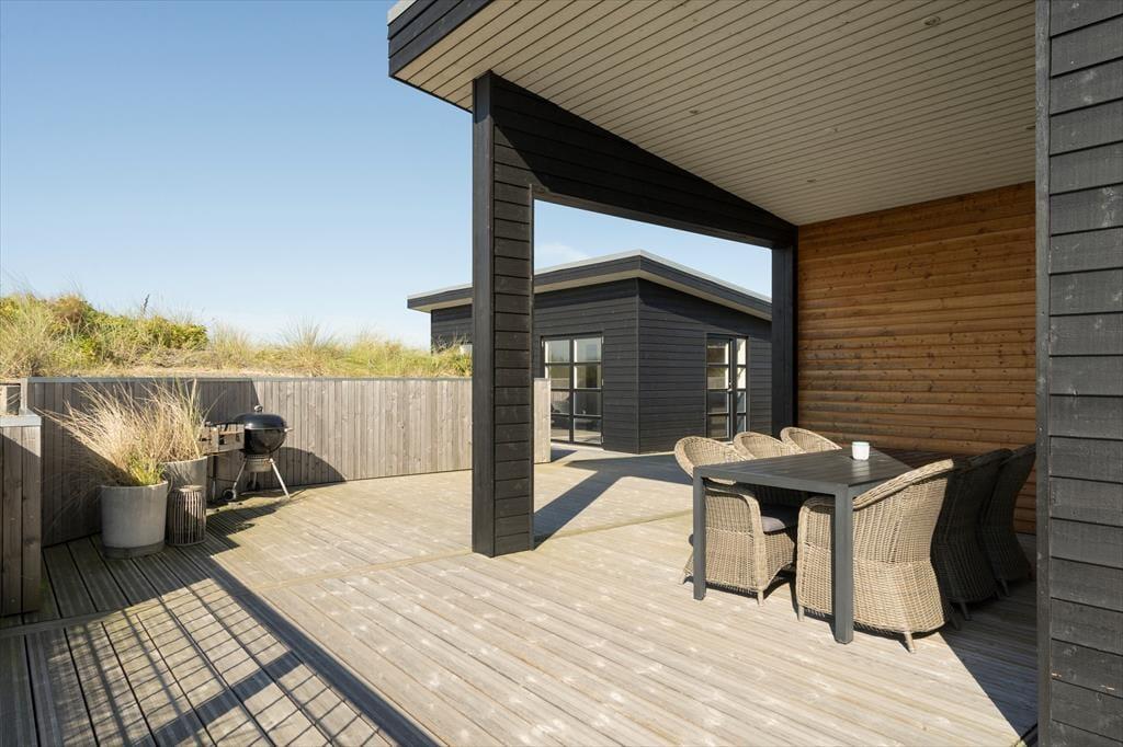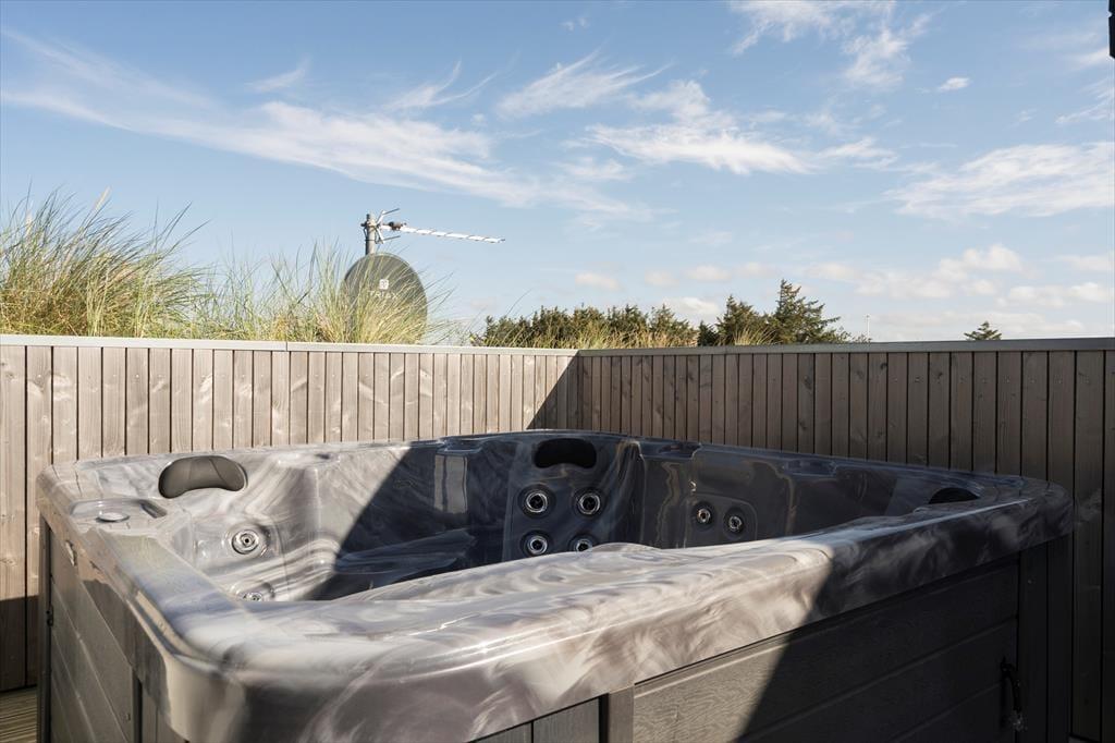 Hvis I holder af spa og wellness, er det perfekt at have en privat, udendørs oase at nyde livet i. På sommerhusets store træterrasse står der et stort spabad, og det føles velgørende at sidde her under den funklende stjernehimmel – uanset årstiden. I løbet af dagen vil I måske hellere sole jer i liggestolene eller dække op til en udendørs frokost på den delvist overdækkede terrasse, og om aftenen kan I tænde op i grillen, mens I gennemgår planerne for næste feriedag.