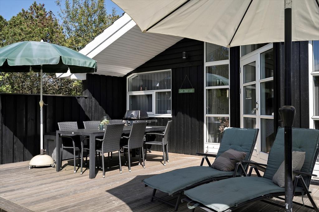 Den 1280 m2 store grund ligger godt og uforstyrret på en lille, lukket vej, så det er et skønt sted at lege, grille og slappe af. Ude i det fri har I plads til at spille bold på græsplænen, og der er også gynge og sandkasse til de yngste børn. Der er terrasser mod både øst og vest, så I kan nyde solen både morgen og aften, og den vestvendte har tilmed et mindre, overdækket areal, hvis I er mere til skygge. Ydermere er der på huset terrasse mulighed for at nyde en stille stund i vildmarksbadet.