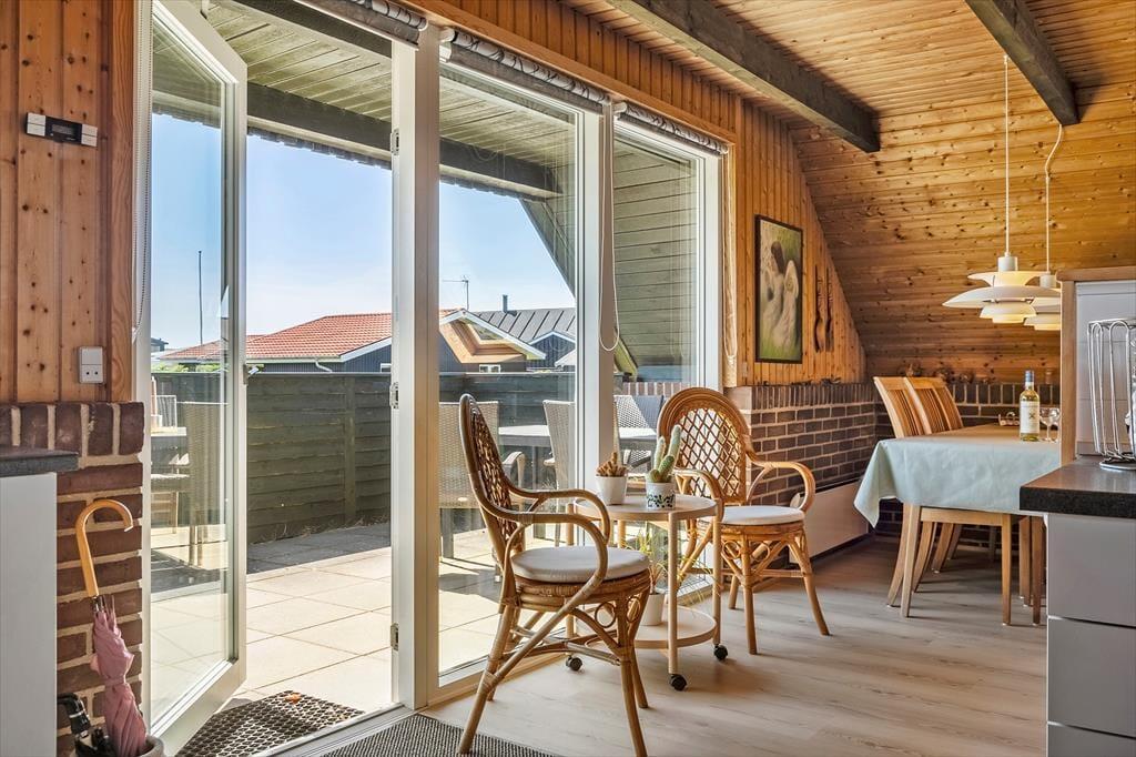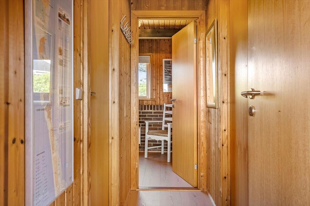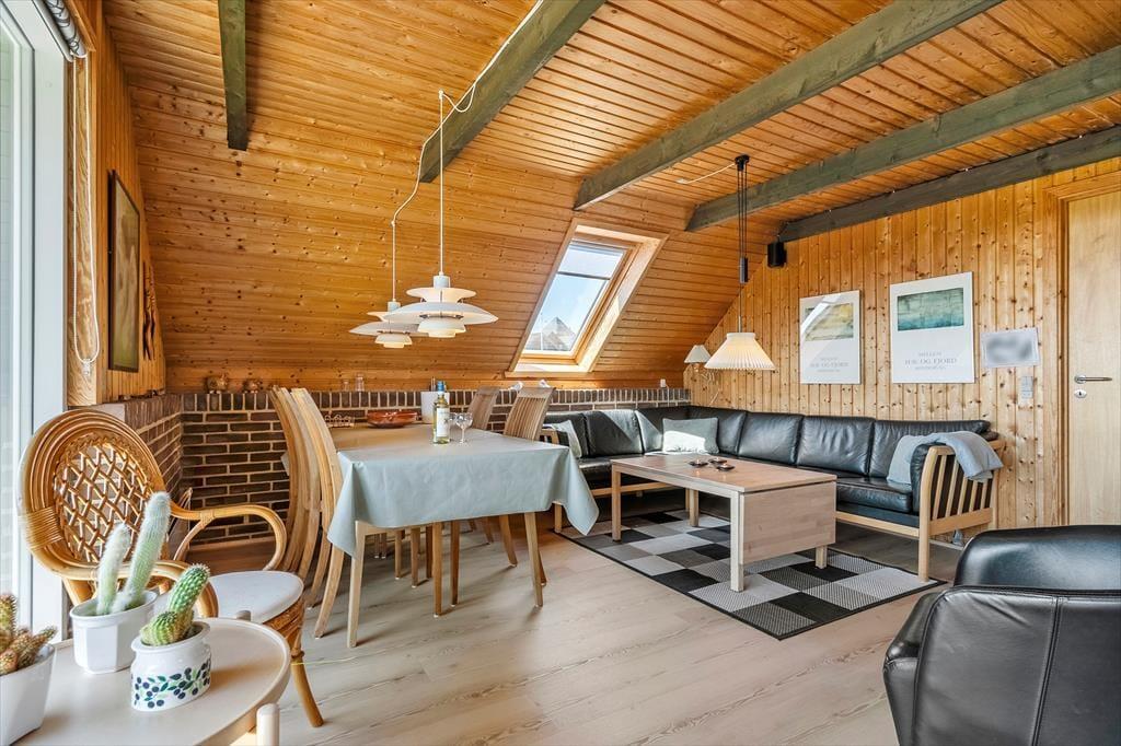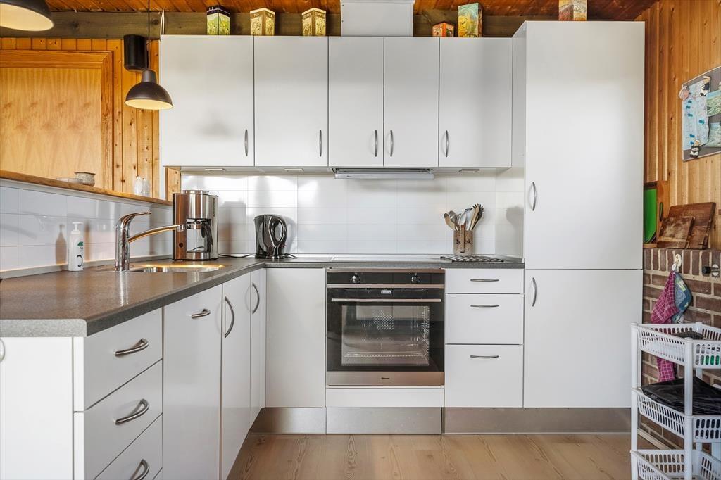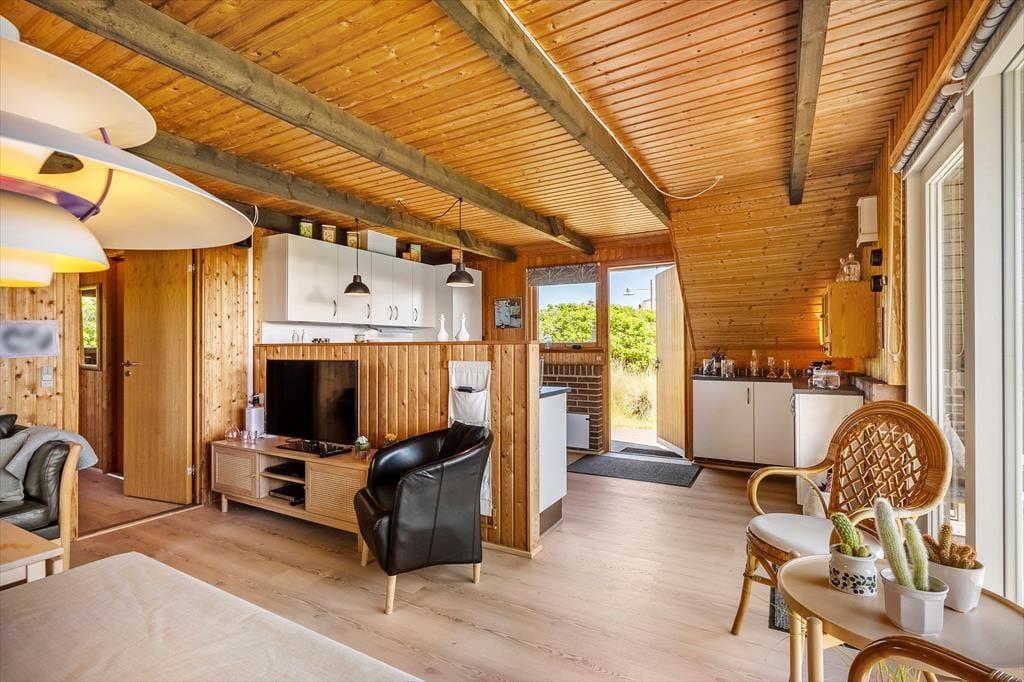 Når I træder ind i sommerhuset, mødes I af en lys og indbydende atmosfære. Huset har netop fået en lækker opdatering med nye gulve i 2025, og det giver boligen et frisk og moderne udtryk, samtidig med at den oprindelige sommerhusstemning bevares. Trævæggene og loftets synlige bjælker sætter en hyggelig ramme om ferien, og indretningen er enkel og hjemlig, så I hurtigt føler jer tilpas. Køkken og stue er forenet i ét fælles opholdsrum, hvor både madlavning, måltider og hyggestunder kan nydes sammen. Sæt jer godt til rette i sofaen med en kop kaffe, find yndlingsfilmen frem på fladskærmen eller nyd en stille stund med en god bog – måske med døren åben ud til terrassen, så I kan høre mågerne skrige og mærke den friske luft strømme ind. De tre soveværelser fordeler sig praktisk rundt i huset, og især det ene værelse, som er lidt adskilt, kan være et hit hos den teenager, der gerne vil have lidt privatliv.