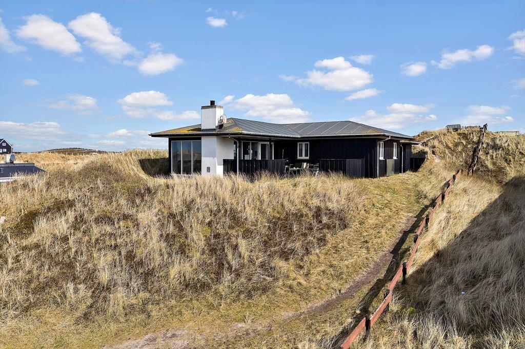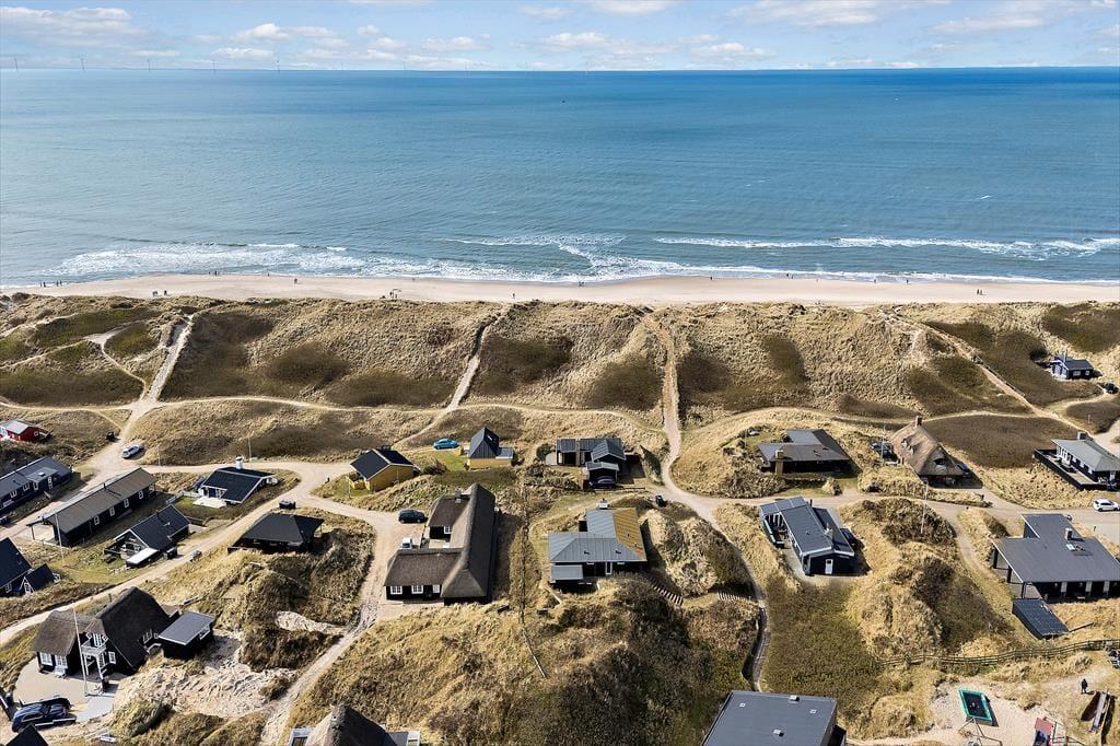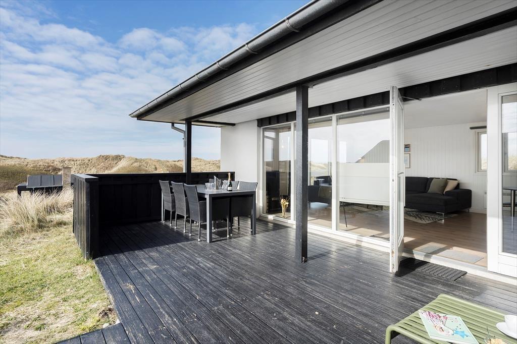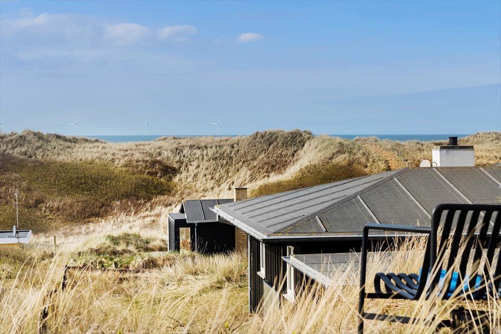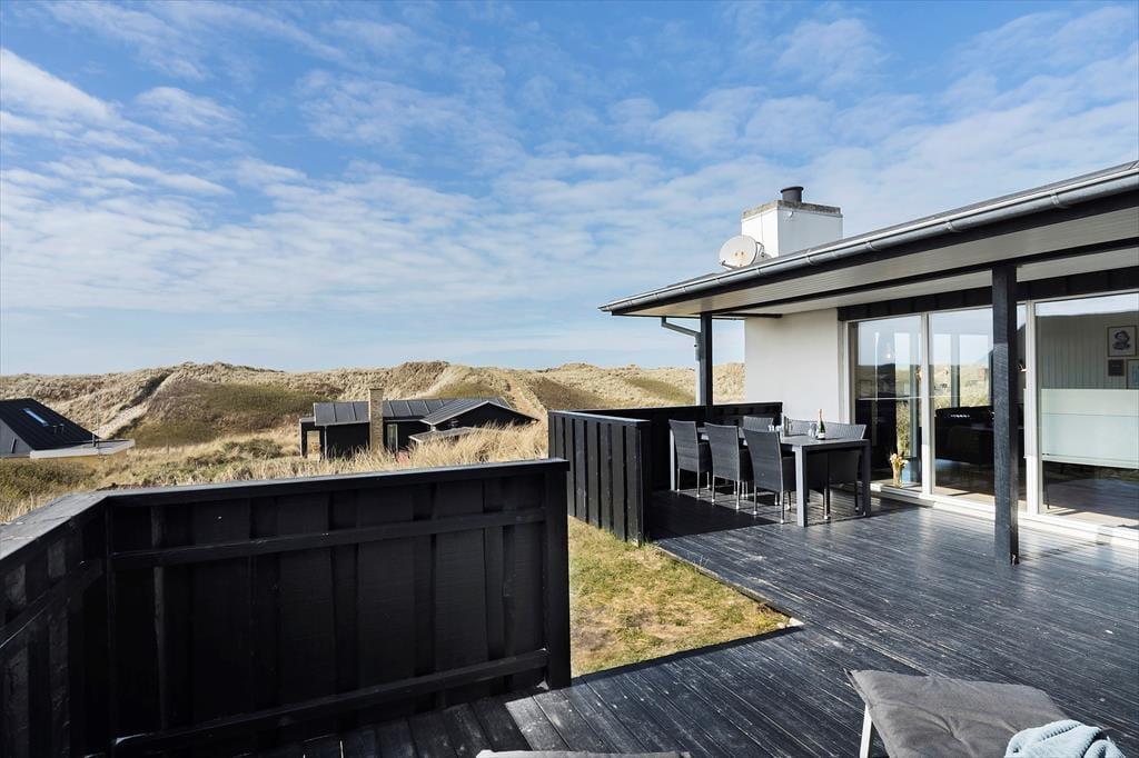 Sommerhusets sydvestvendte terrasse er delvist overdækket og tilpas afskærmet, så du kan koble af i ugenerede omgivelser med udsigt til det kuperede kystlandskab. Du er så tæt på den yderste klitrække, at du måske ligefrem kan høre bølgerne rulle ind på stranden – og hvis du går op for at sætte dig på grundens udsigtsbænk, kan du se havet og har frit udsyn til aftnens smukke solnedgang. Med andre ord giver udearealerne dig mulighed for at komme i kontakt med naturen og mærke roen i kroppen, og samtidig har du særdeles nem adgang til byens tilbud, hvis du får lyst til at spise is eller drikke cafékaffe undervejs.