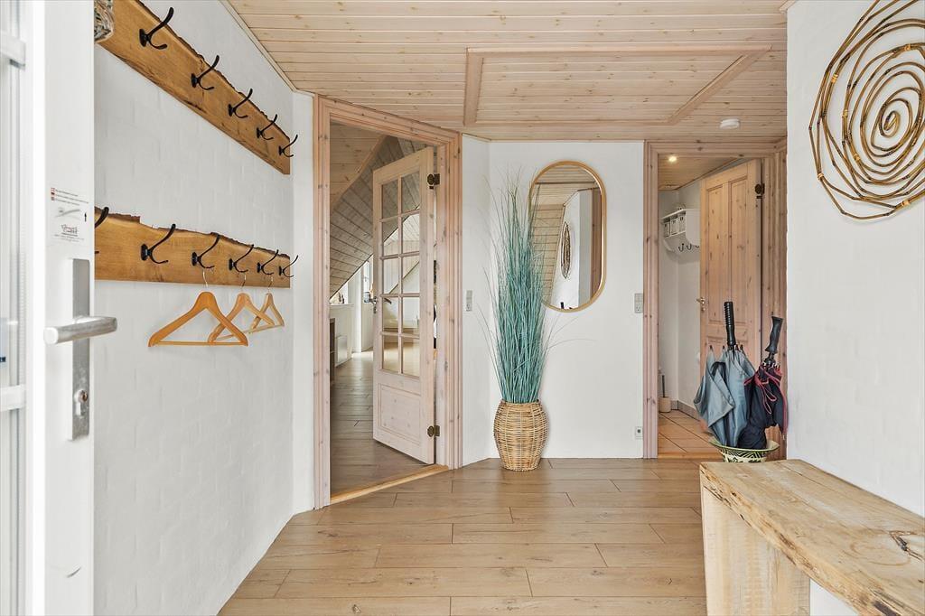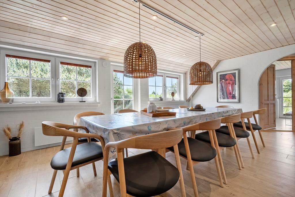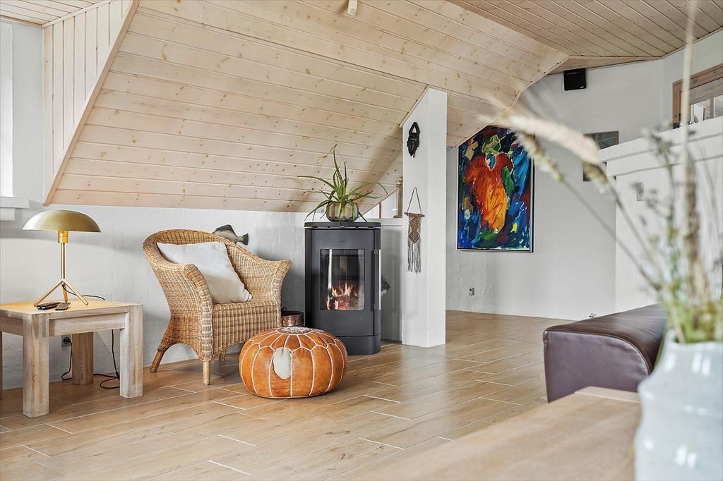 Sommerhus i Søndervig Strand og By, Vestjylland, med plads til 10 voksne og 2 husdyr. Der er en hyggelig indretning med bl.a. brændeovn, og du finder desuden vaskemaskine, opvaskemaskine og tørretumbler i boligen.
