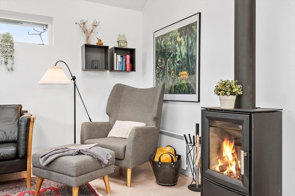 I sommerhuset kan der været op til seks personer – og I så fald kan I fordele jer på to gode soveværelser og en rummelig hems. Uanset om huset er fuldt eller ej, er det skønt at opholde sig i stuen, for her er der loft til kip, ovenlysvinduer og en gennemført indbydende indretning med både pænt og komfortabelt møblement. Når du slapper af i sofaafdelingen, kan du nyde synet af de dansende flammer i brændeovnen eller vende blikket mod fladskærms-tv’et, hvis du er i humør til at se film eller serier. Melder sulten sig, kan du diske op med noget lækkert at spise i det åbne køkken, og hvis du trænger til en helt rolig aften, kan du sætte dig i saunaen for at koble helt af i varmen.