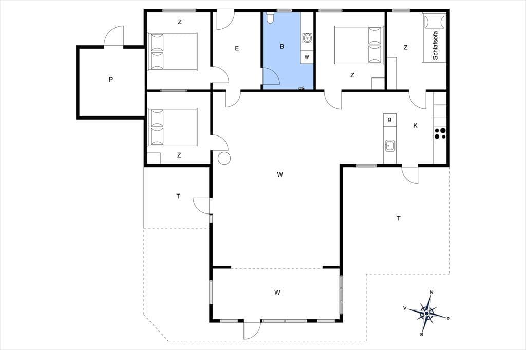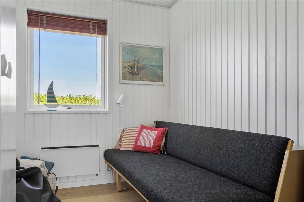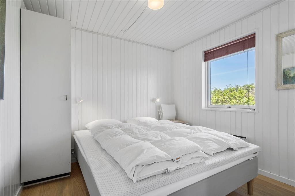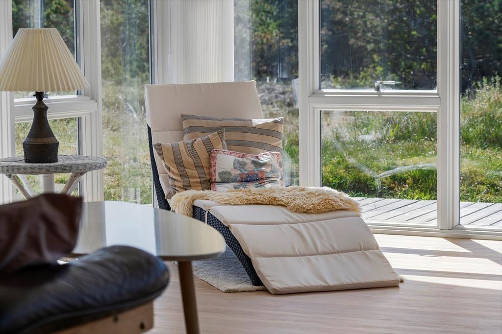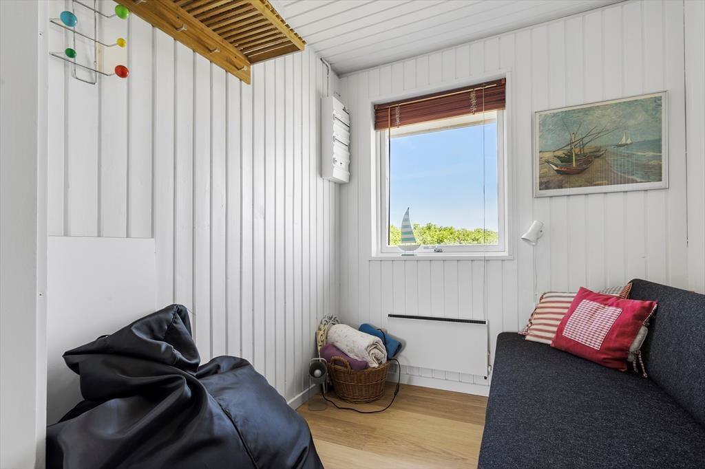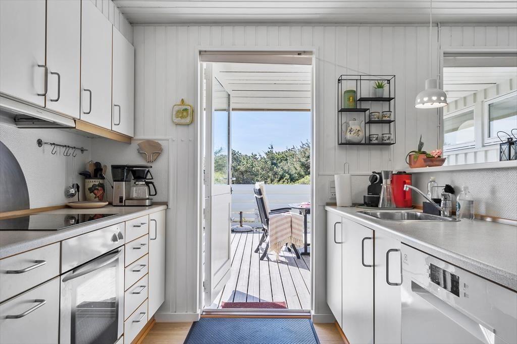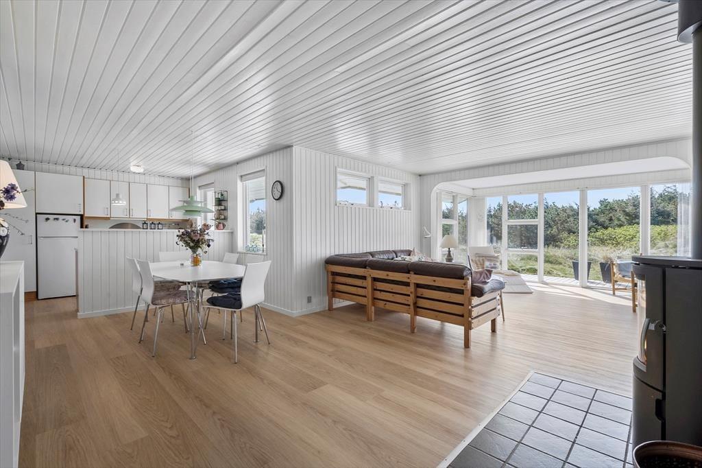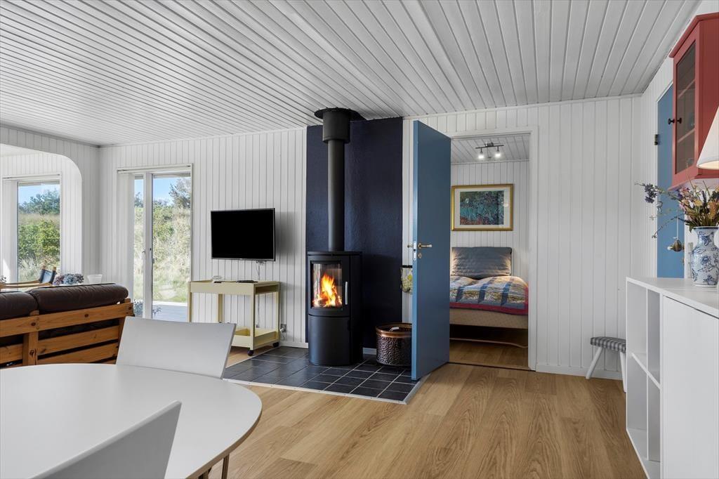Træder du indenfor i dette hyggelige sommerhus, mødes du af en indbydende og lys stemning. De store vinduespartier i stuen trækker naturen med helt ind i rummet, og når solen falder ind over trægulvene, breder der sig en rolig og lun atmosfære. Hjertet i huset er opholdsrummet med køkken, spiseplads og sofaområde i ét – og med brændeovnen som et hyggeligt midtpunkt. Her kan du læne dig tilbage med et tæppe og en god bog, mens flammerne knitrer i baggrunden, eller samles med familien til brætspil og lange snakke, når mørket falder på. Indretningen er både enkel og funktionel – og gør det nemt at finde sig til rette og nyde feriestemningen fra første dag.