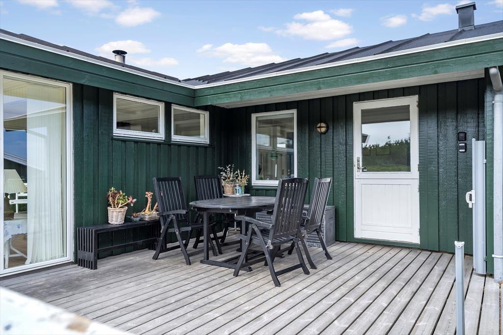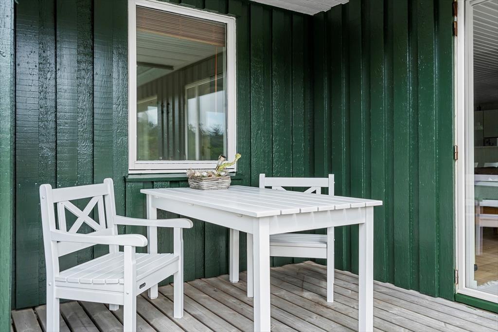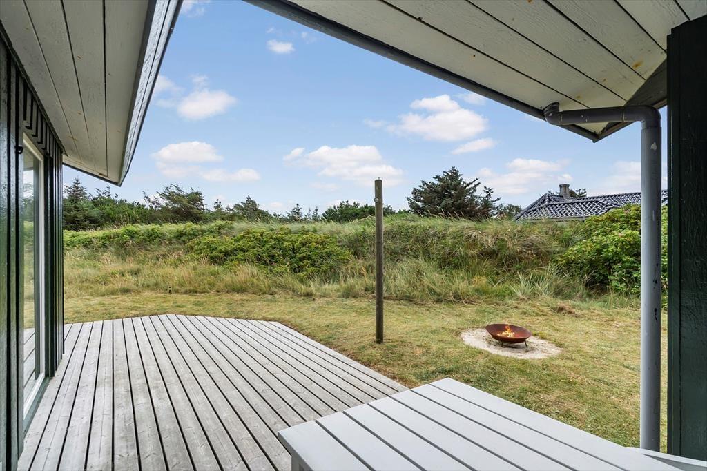 Udenfor fortsætter de gode ferieoplevelser. Sommerhuset ligger på en lukket og ugeneret grund med høje træer og grøn bevoksning, der skaber en privat og afslappet stemning. Den hyggelige træterrasse er delvist overdækket, så du kan nyde både skygge og læ – og du kan nemt lade dagen begynde her med morgenkaffe, fuglefløjt og lyden af vinden i trætoppene. Om aftenen kan I samles omkring bålfadet, riste skumfiduser og se flammerne danse under stjernehimlen. Her er plads til både ro og leg – og uanset om du vil trække dig tilbage med en god bog eller spille bold med børnene, får du optimale rammer for udelivet.