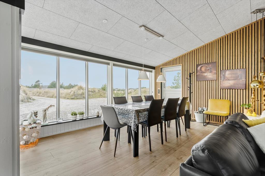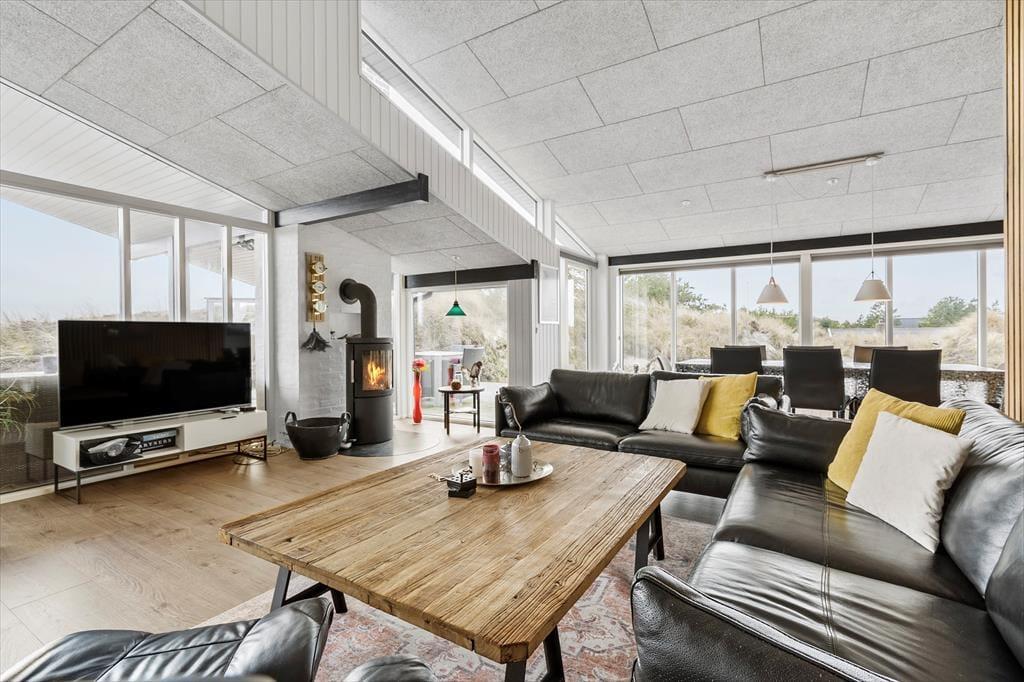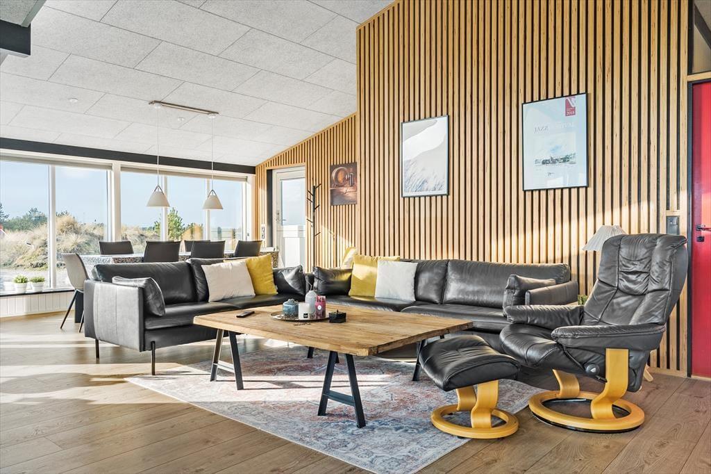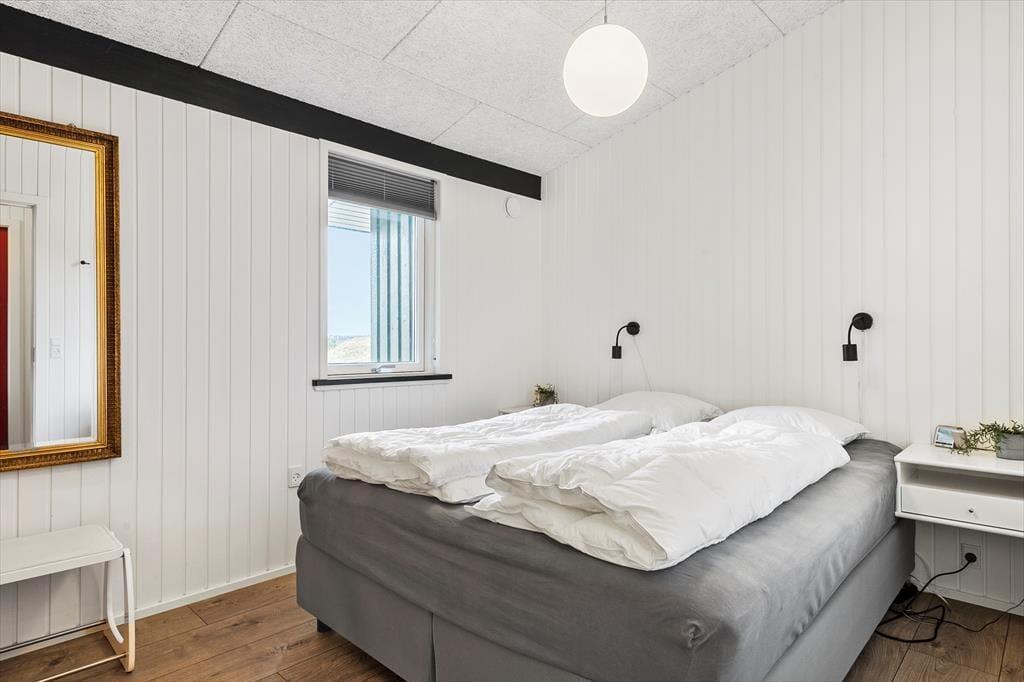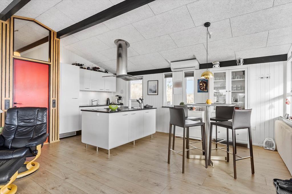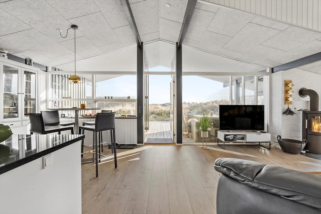 Selvom sommerhuset blev opført helt tilbage i 1973, er det ikke tidligere blevet udlejet. Igennem de seneste år har huset været igennem en moderniseringsproces, hvor det er blevet både tilbygget og renoveret, så rummene fremstår velholdte og indbydende. Husets hjerte er et lækkert opholdsrum, der består af køkken og stue i åben forbindelse, og her er der loft til kip, brændeovn og store vinduespartier, der lader sollyset skinne ind og giver udsigt til klitterne. Alt efter humøret kan I finde ludospillet frem eller tænde for det store fladskærms-tv, når I rigtigt vil slappe af, og hvis sulten begynder at melde sig, har I alt, hvad I skal bruge for at lave lækker mad i det moderne indrettede køkken. Endelig fuldendes den gennemførte planløsning af et rummeligt brusebadeværelse og et gæstetoilet med vaskemaskine.