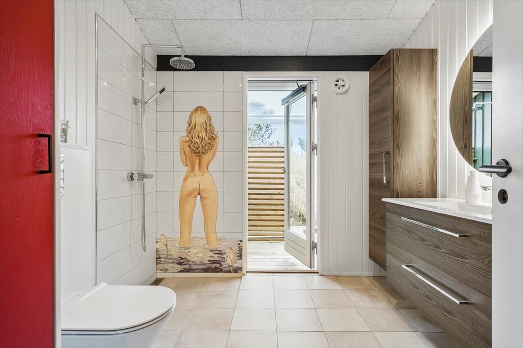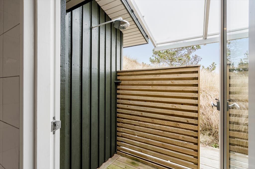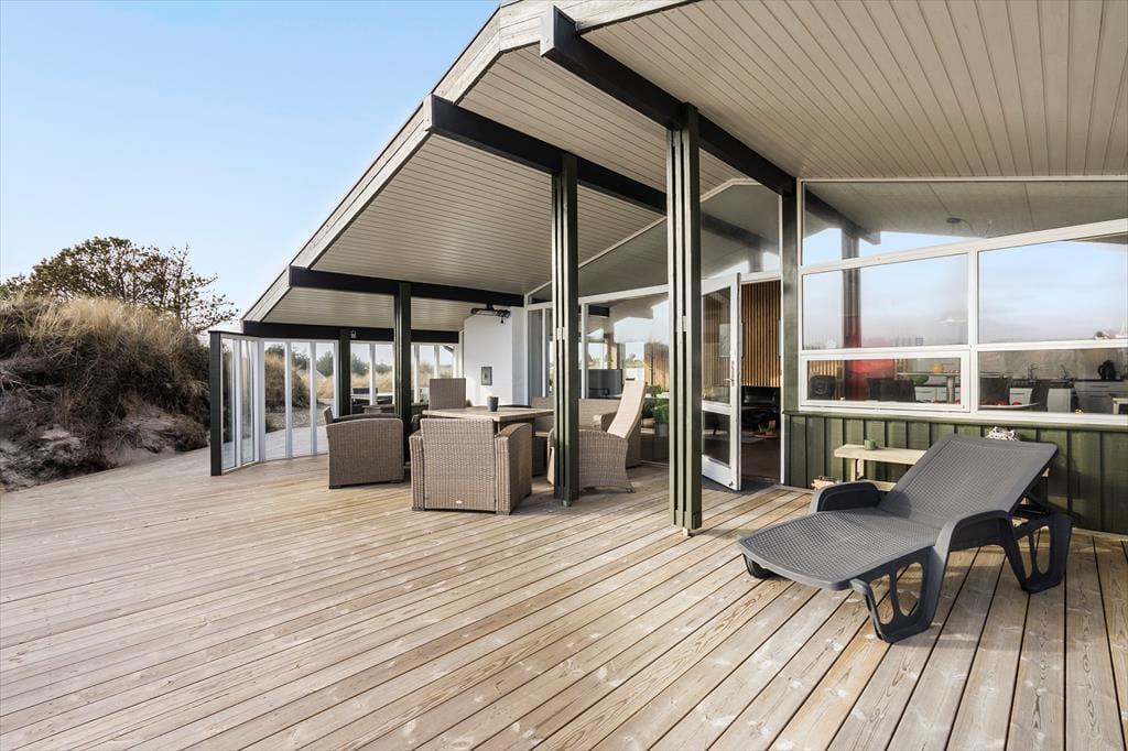 Sommerhusets lækre terrassemiljø er det helt rette sted at nyde solen, når der er afslapning på programmet. Der er flere gode opholdspladser at vælge imellem, inklusiv en delvist overdækket livsnyderterrasse mod syd og en delvist overdækket østterrasse, der ligger godt i læ bag klitterne. Dagen kan starte med et opkvikkende morgenbad under udebruseren, og om aftenen kan I hygge jer med at lave mad i udekøkkenet og på grillen – eller med at riste skumfiduser ved bålstedet under stjernehimlen.
