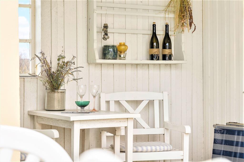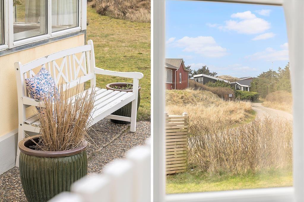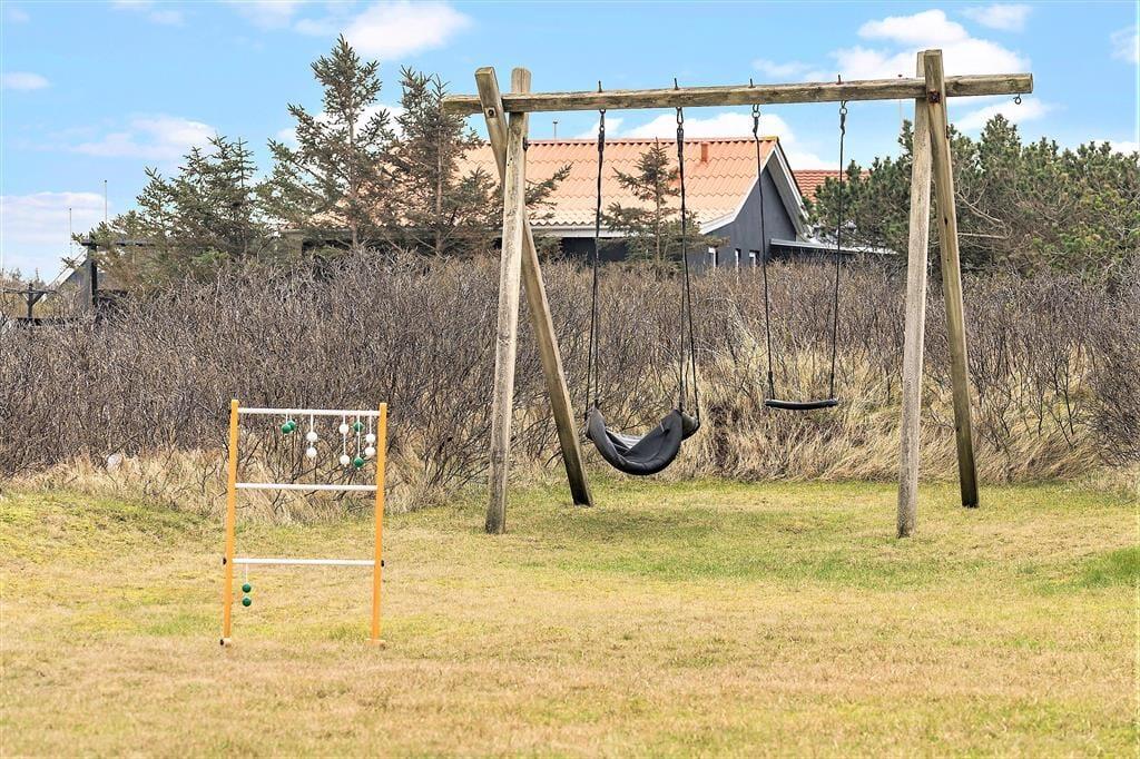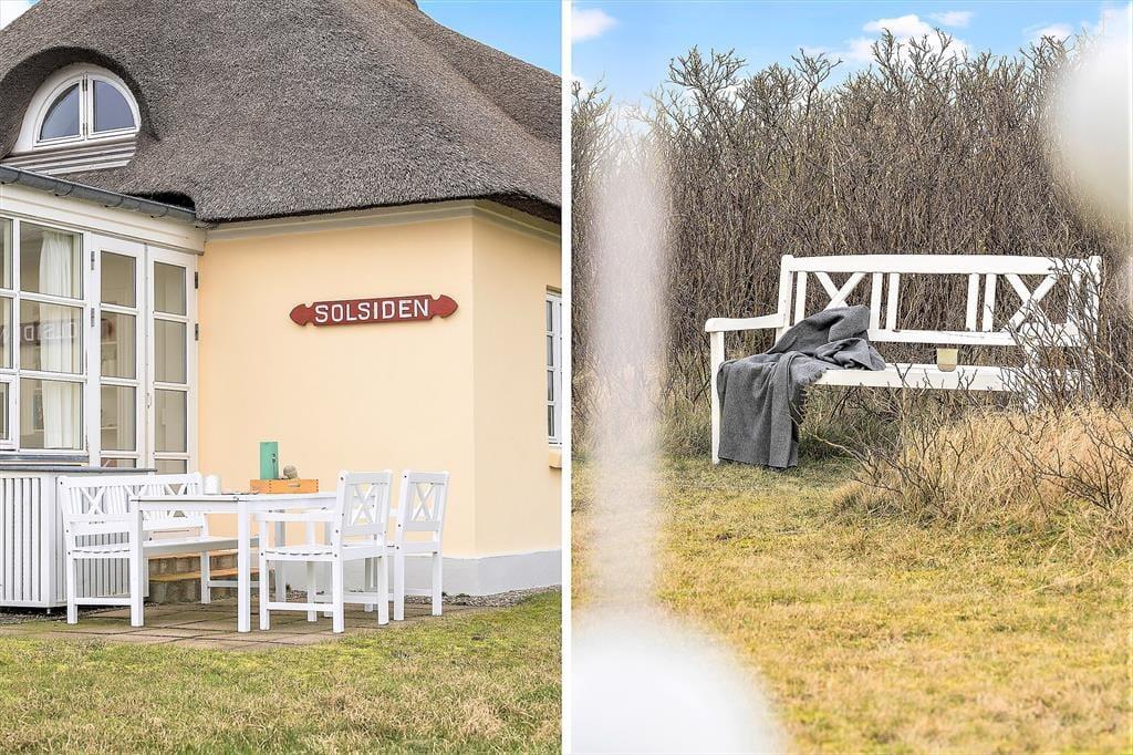 Rundt omkring på den naturskønne og kun let kuperede grund er det nemt at finde en fristende opholdsplads i solen. Ved huset kan du slå dig ned på en bænk eller vælge en lækrog – for eksempel er der en helt lukket terrasse, der skærmes af murværk og endda har et overdækket areal, hvis det er at foretrække. Du kan også sætte dig i en havestol tæt op ad de duftende hybenbuske og grundens små klittoppe, og hvis du har børn med på ferie, kan du give dem en gyngetur eller udfordre dem i vikingespil på græsplænen.